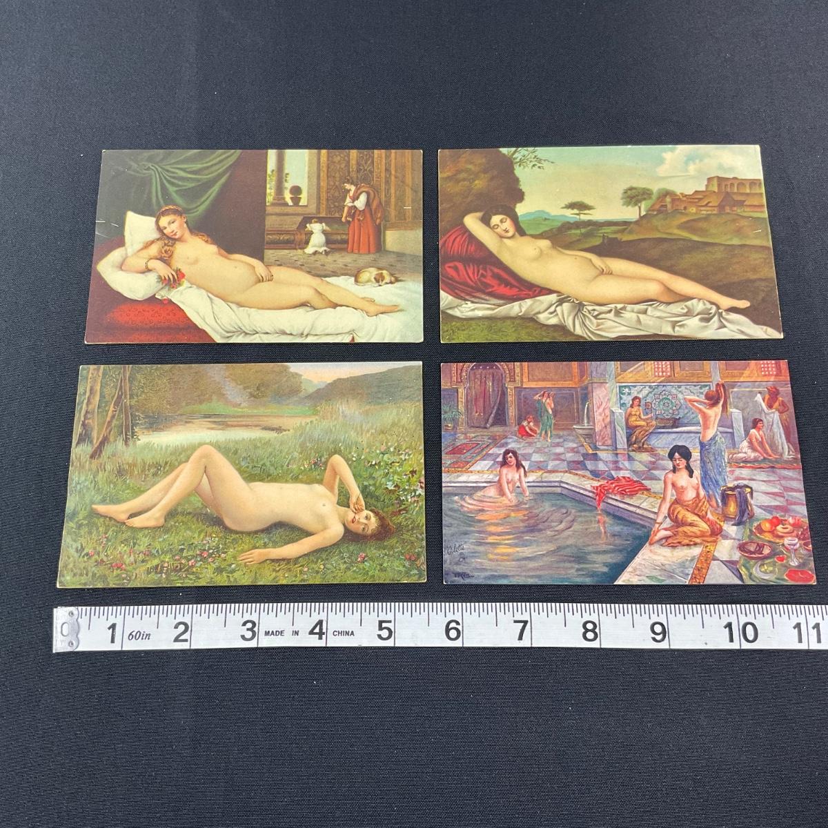 FOur vintage risqué art nouveau style postcards. Please see photos for details and condition. Any condition statement is given as a courtesy to a client, is an opinion, and should not be treated as a statement of fact. Reference to condition written, oral or within a condition report shall not be regarded as a full account of condition and may not include all defects, alterations, or restorations. Absence of a condition report does not imply a lot is flawless or lacking imperfections or damage. Katherine’s Auction & Appraisal Service shall have no responsibility for any error or omission. Returns shall not be accepted on the basis of condition. ::: Shipping is available on this lot. If you require shipping you must let us know at the close of the auction. We will coordinate with you after the item has been won. Shipping fees will include insurance up to or exceeding the value of all items being mailed. If you have any questions regarding this lot please contact the auctioneer either via this website, by direct email or by phone. PICK UP TIMES and other important information can be found in the TERMS and DESCRIPTION of the auction. Please take a look for pertinent information. Thanks!