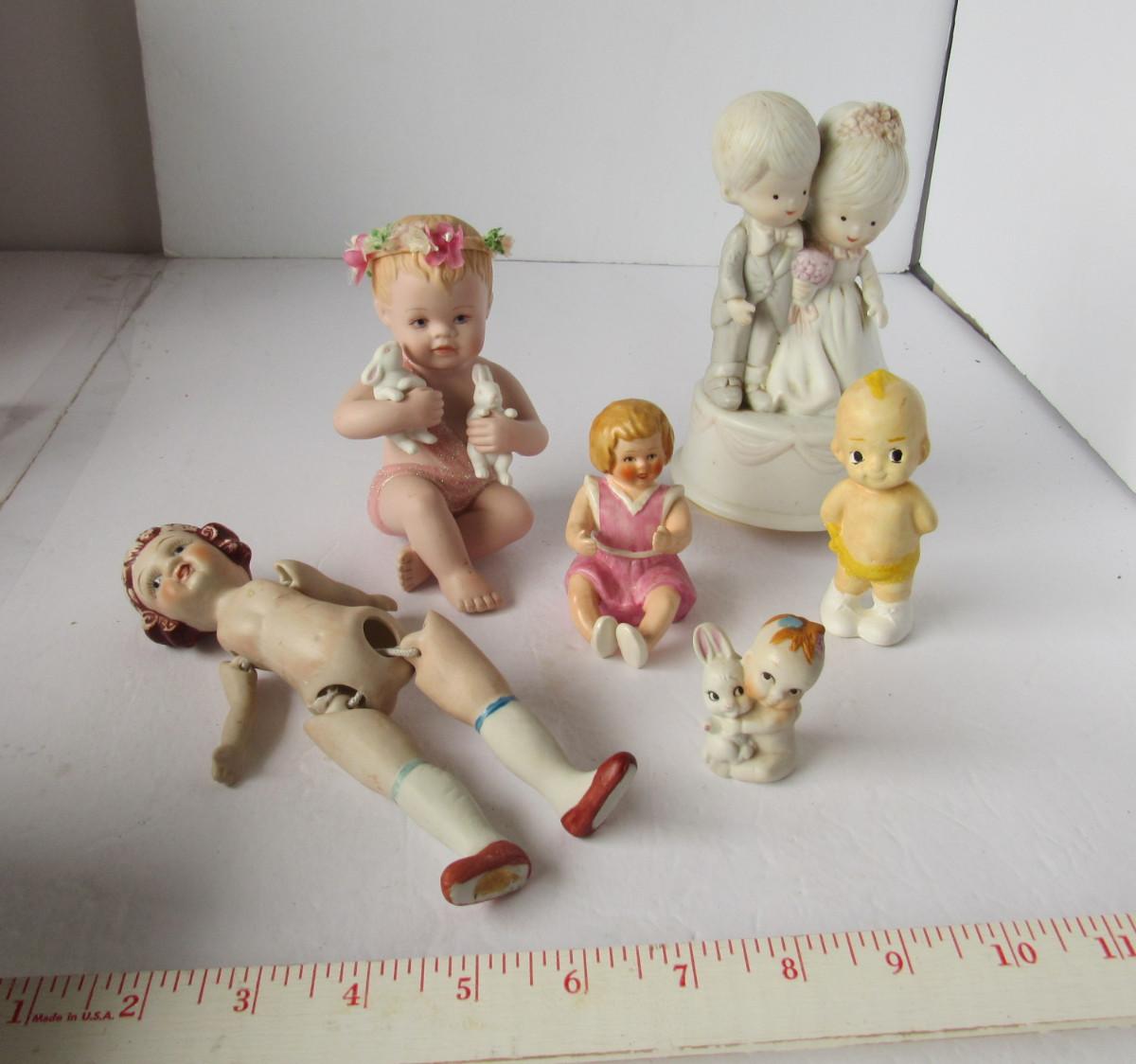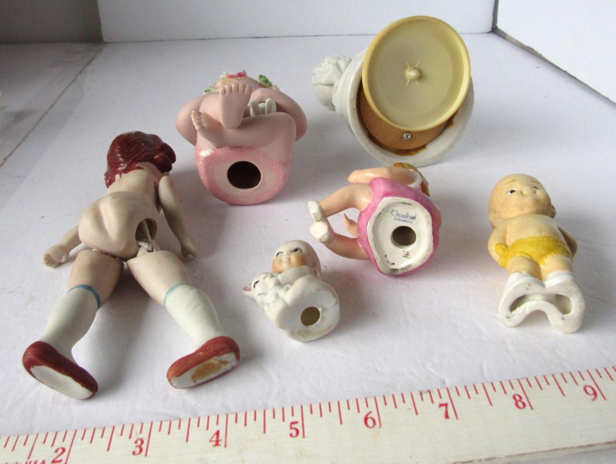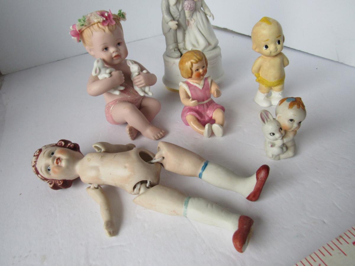 The doll has a lot of paint wear and probably was restrung at one time, age unknown. The smaller seated girl is a Goebel figure. Unsure if the music box works or not, forgot to try it. Shipping is available at actual shipping cost plus $5.00 handling fee per box for supplies/labor. See our terms for details. All sales are final. Condition notes may not be all inclusive, we may miss some issues as most vintage items are not in mint condition and have some degree of wear, paint loss, etc, but we always try to note obvious damage.