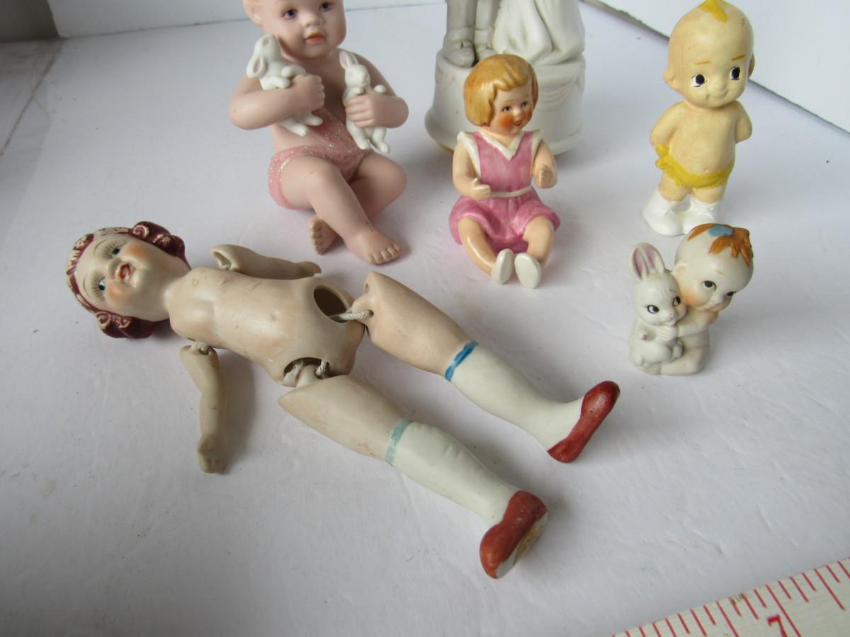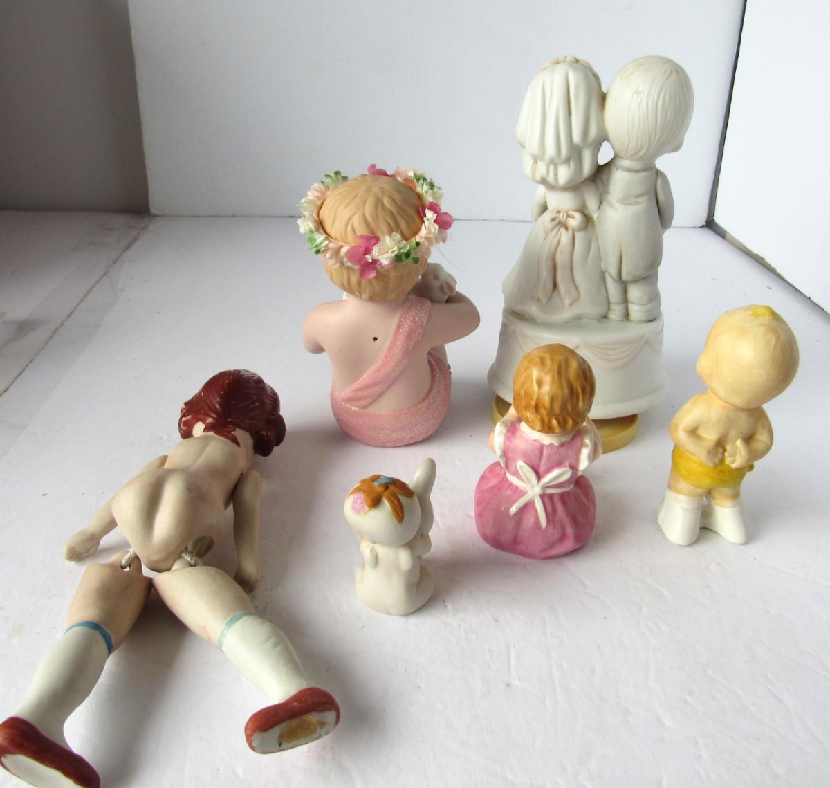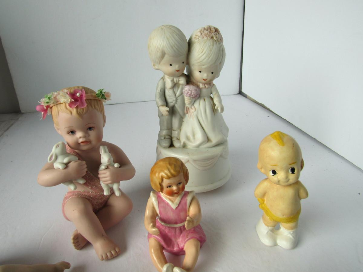 The doll has a lot of paint wear and probably was restrung at one time, age unknown. The smaller seated girl is a Goebel figure. Unsure if the music box works or not, forgot to try it. Shipping is available at actual shipping cost plus $5.00 handling fee per box for supplies/labor. See our terms for details. All sales are final. Condition notes may not be all inclusive, we may miss some issues as most vintage items are not in mint condition and have some degree of wear, paint loss, etc, but we always try to note obvious damage.