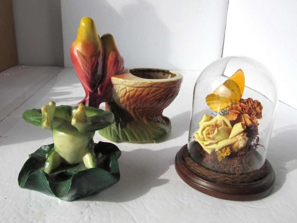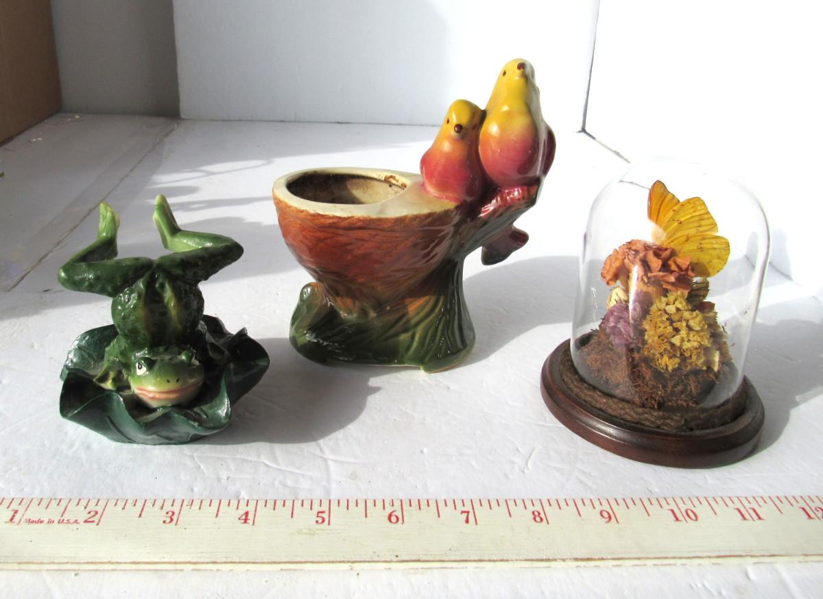Old Pottery Planter, Butterfly in Dome and Plastic Frog