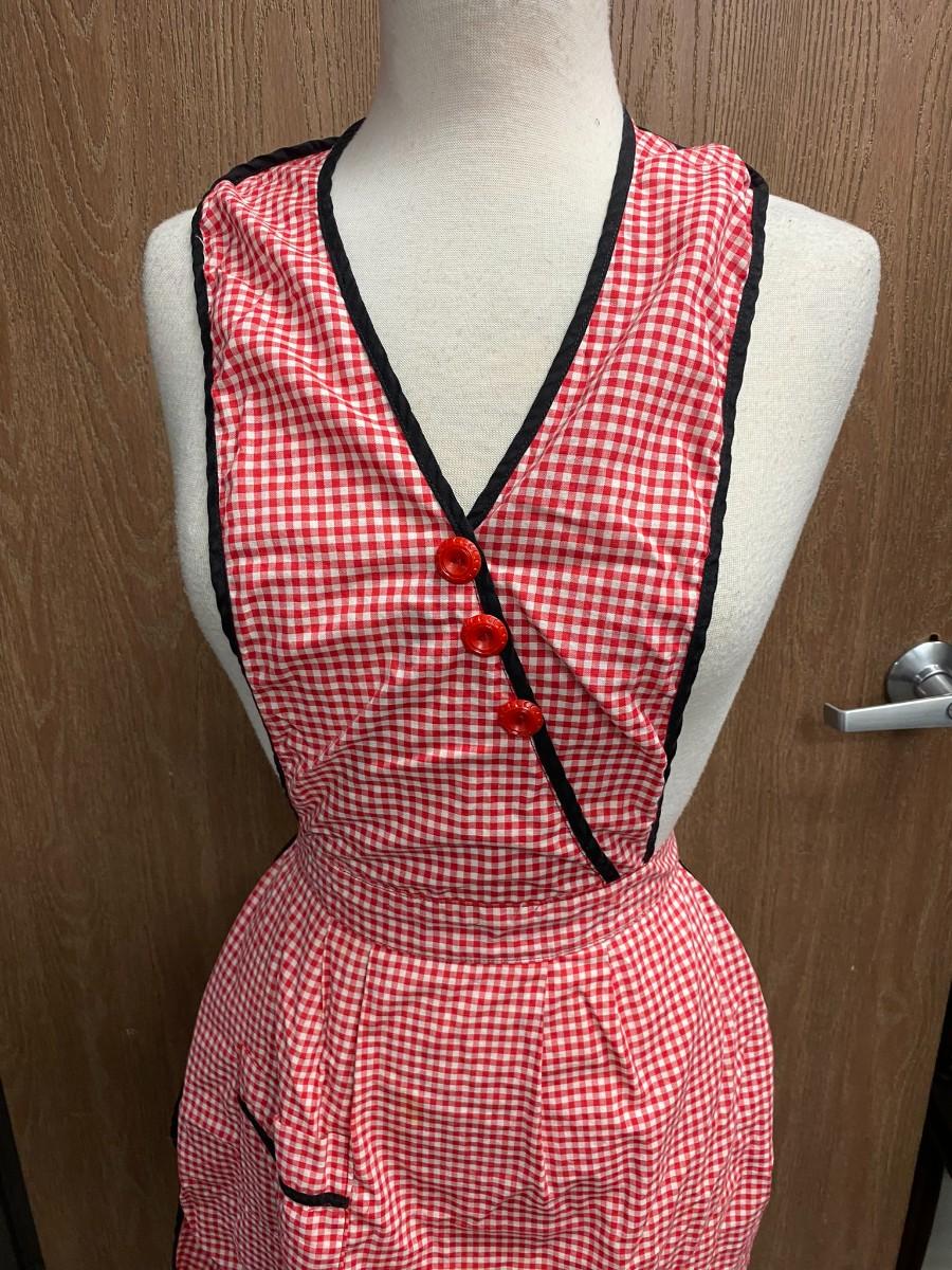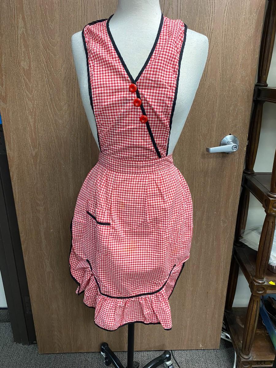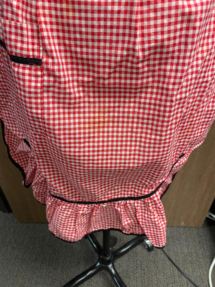 Red and White Gingham Checkered Vintage Full Apron Tie Waist. In good vintage condition. Some light spotting on the lower part of apron.