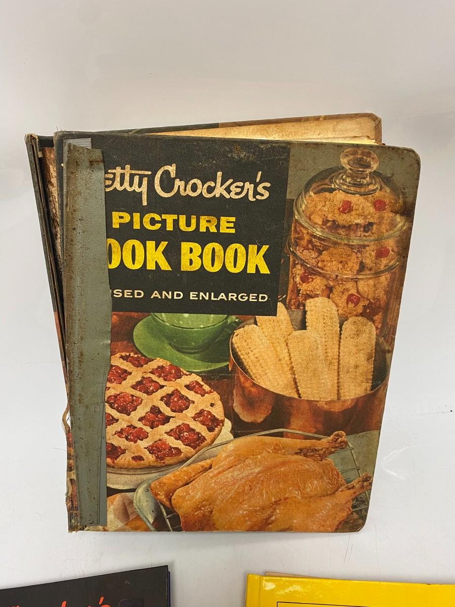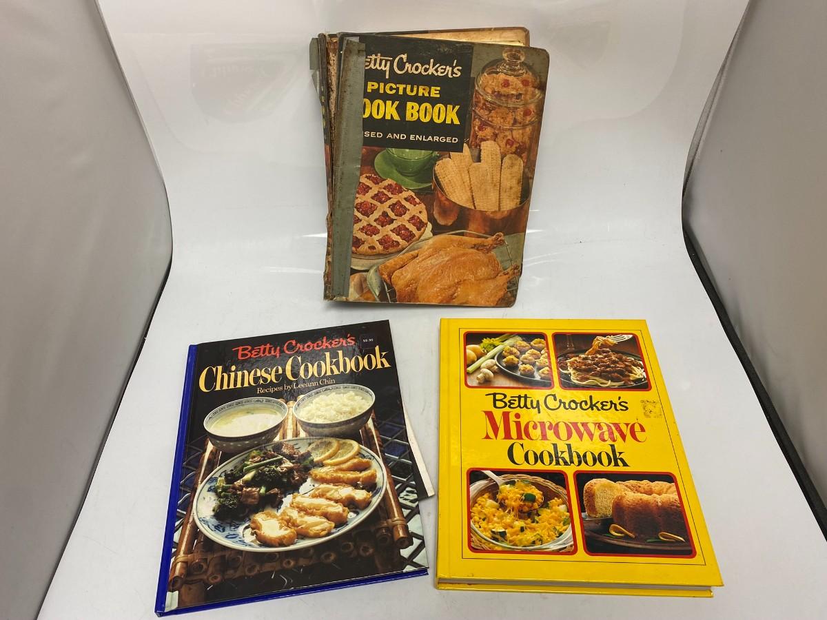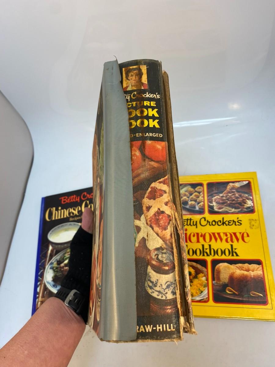Set of 3 Betty Crocker Cookbooks Picture Cook Book Chinese Food Microwave. The Picture Cook Book is well used, the cover is falling apart but it also contains some additions of the previous owners favorite recipes.
