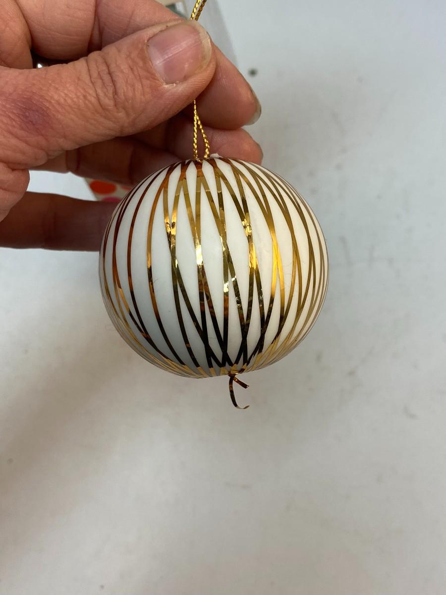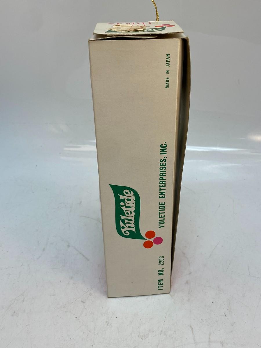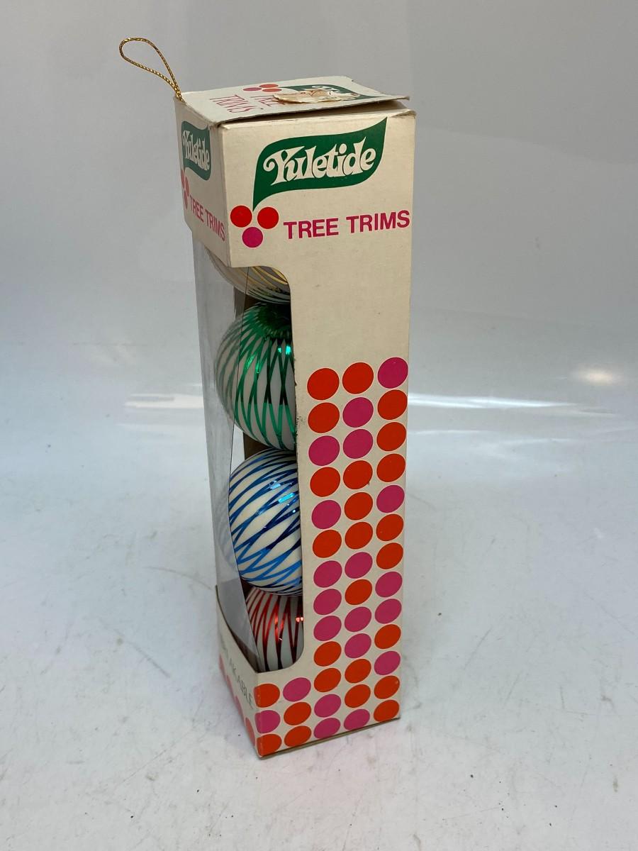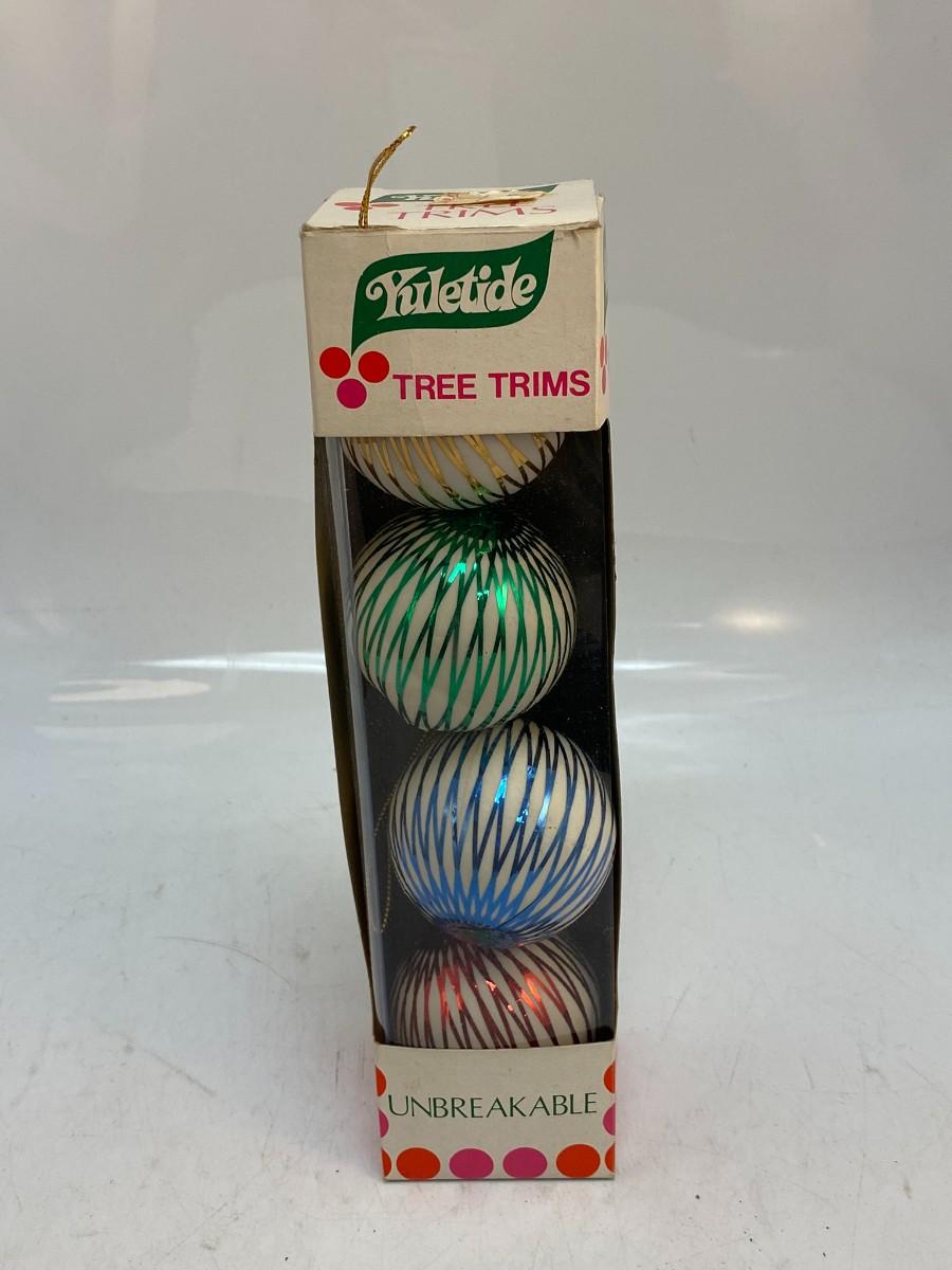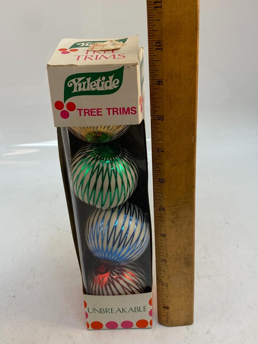 Vintage Set of 4 Yuletide Metallic Foil Striped Unbreakable Christmas Holiday Tree Ornaments. Made in Japan. Some wear to the box but in good vintage condition.