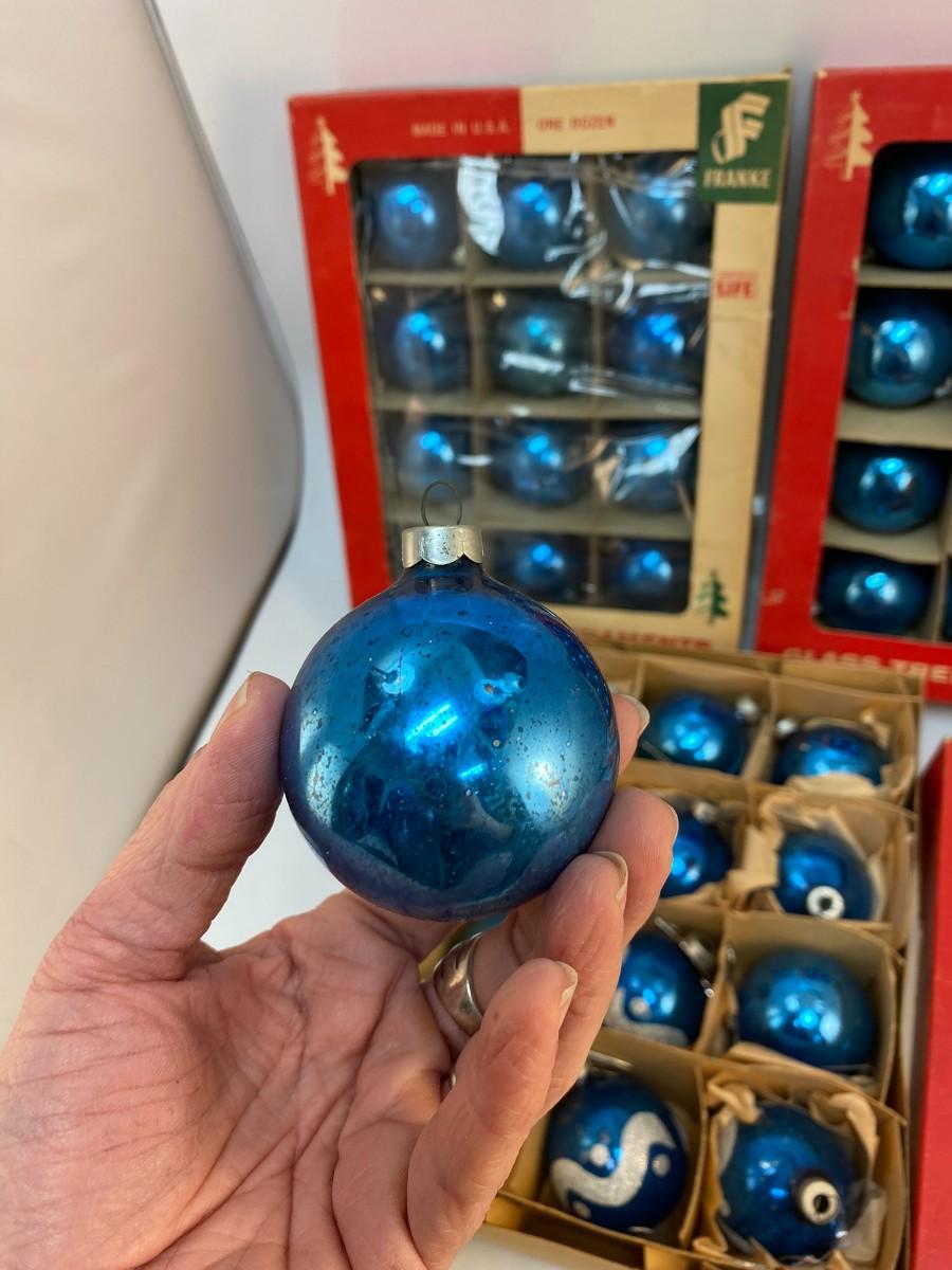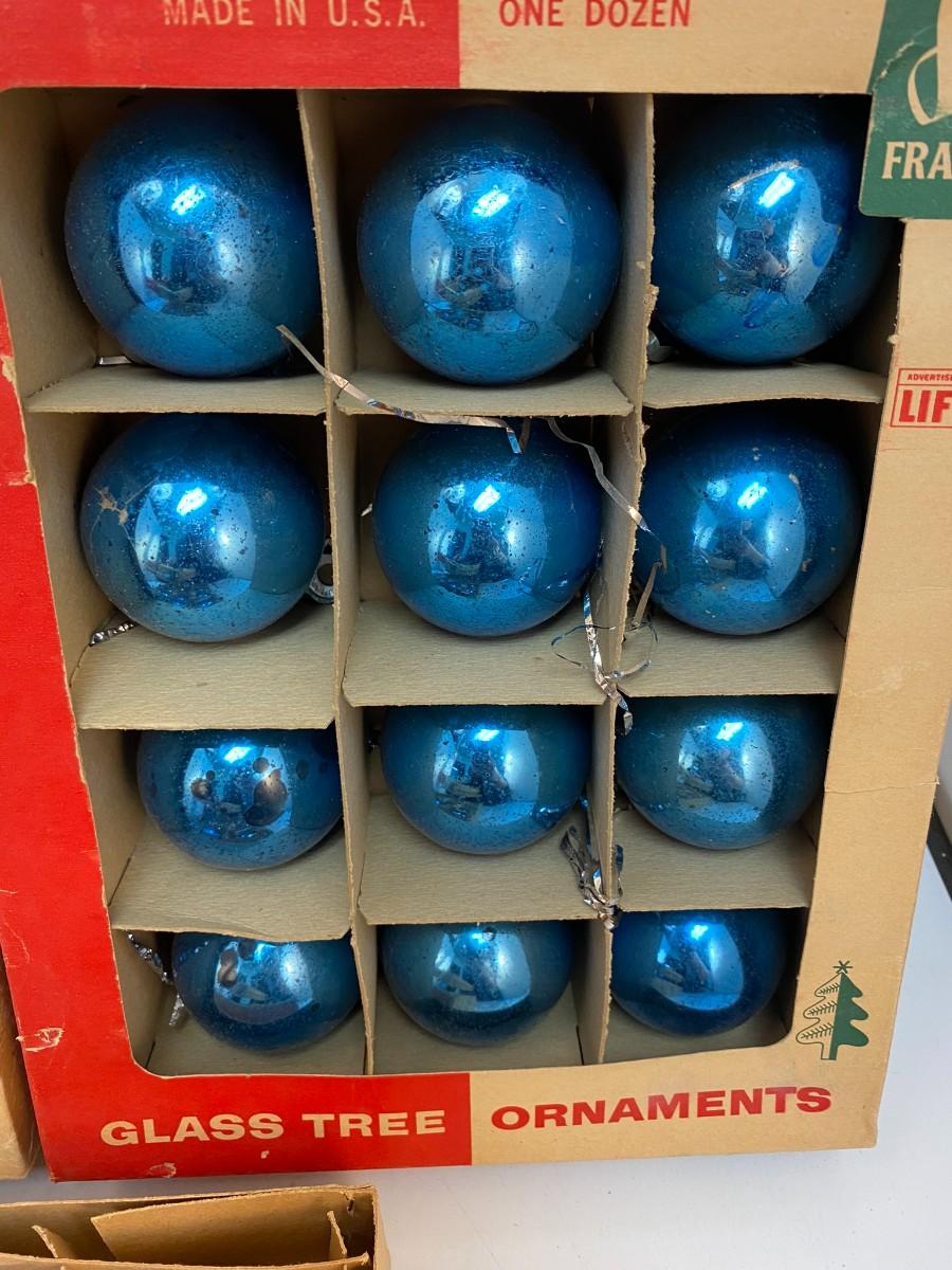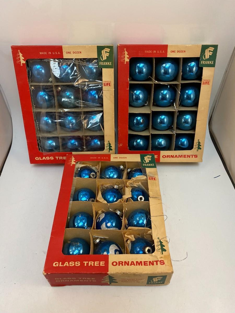 Vintage Three Boxes of Blue Shiny Brite Franke Blown Glass Tree Ball Ornaments. In vintage condition. No broken balls but wear to the finishes. A couple have frosted white patterns. See photos.