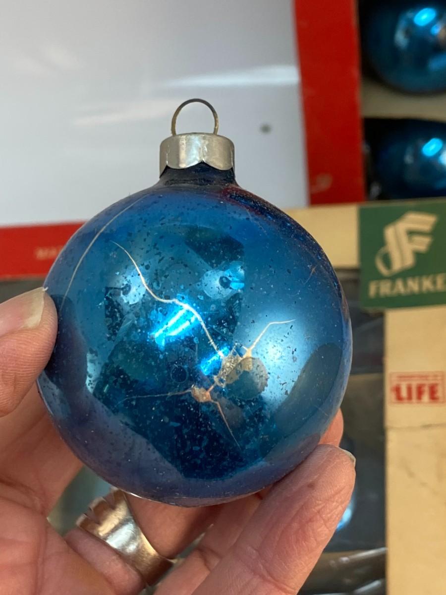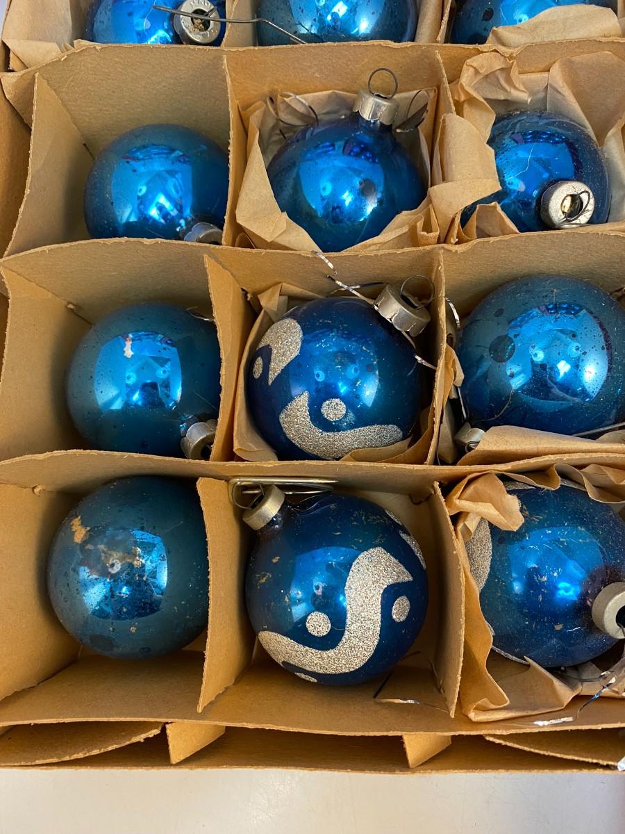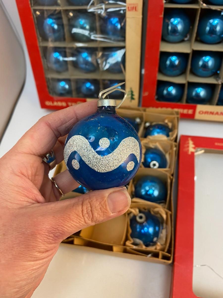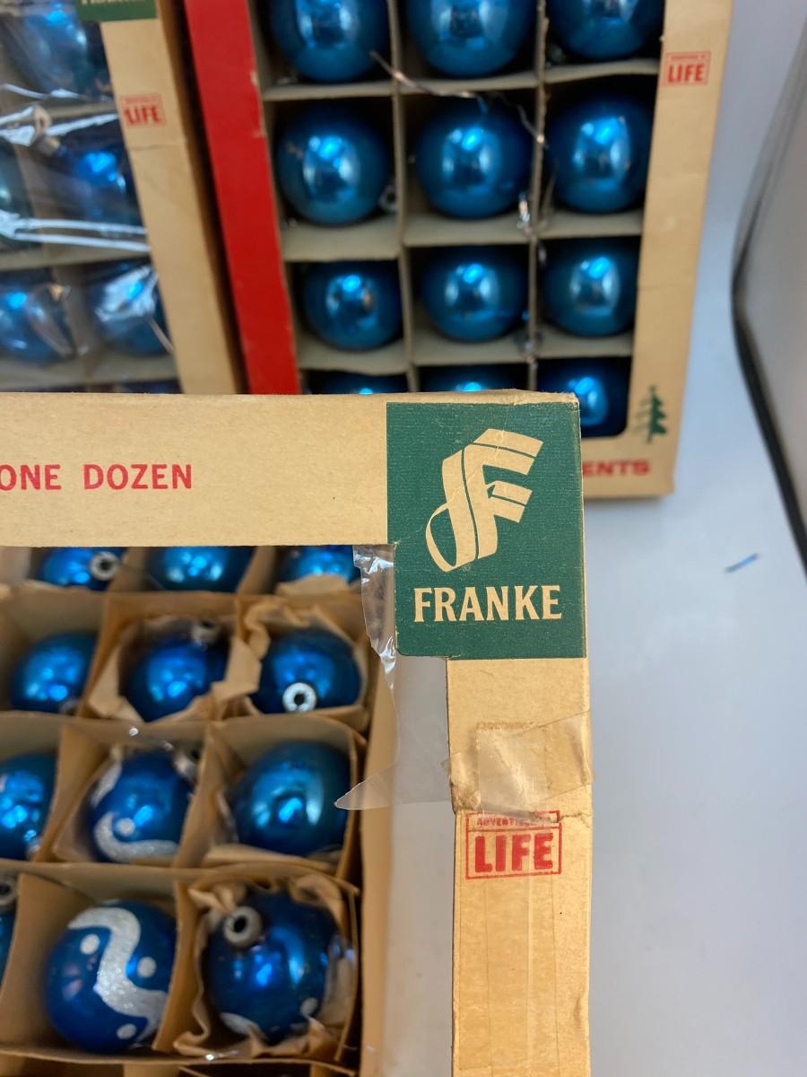 Vintage Three Boxes of Blue Shiny Brite Franke Blown Glass Tree Ball Ornaments. In vintage condition. No broken balls but wear to the finishes. A couple have frosted white patterns. See photos.