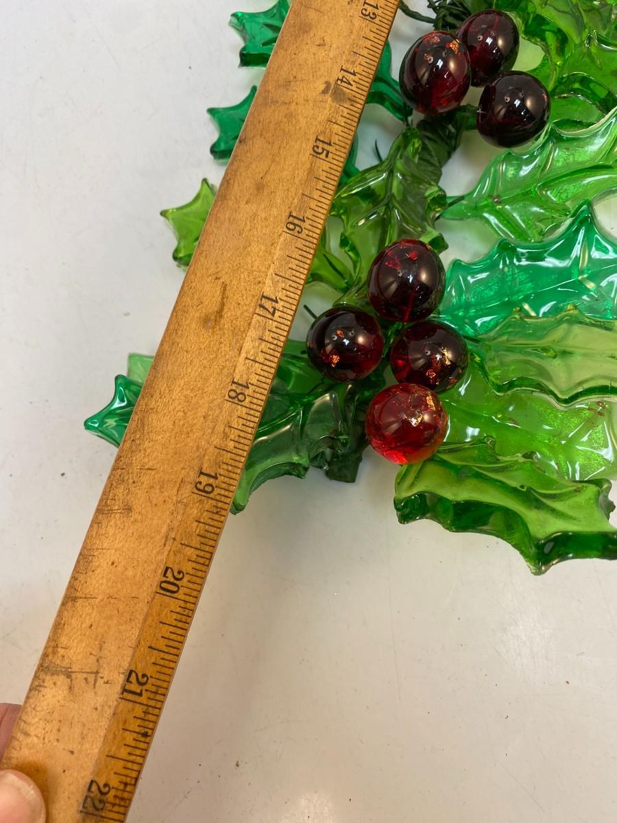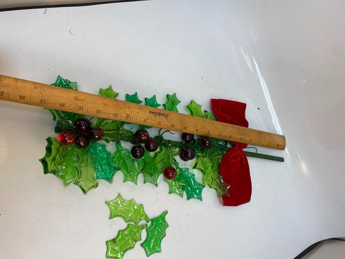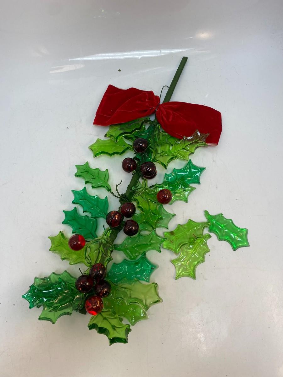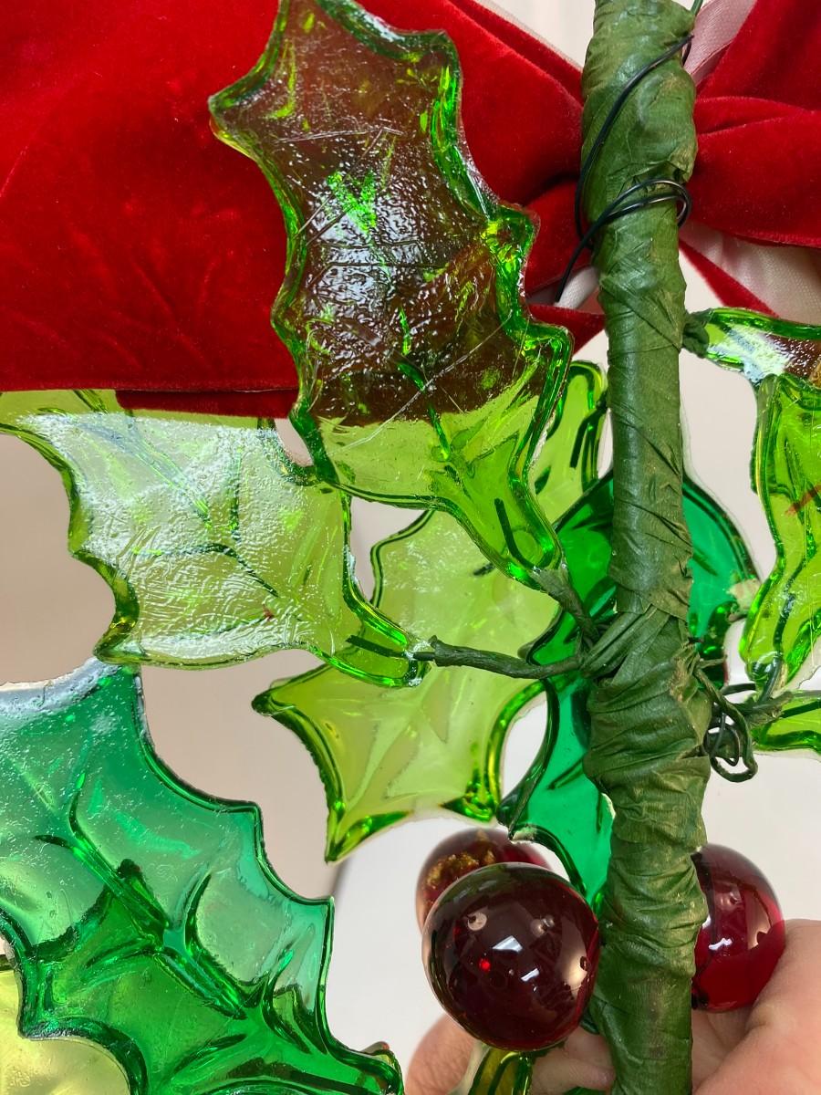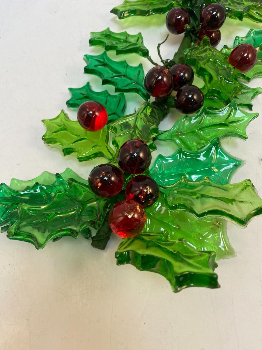Vintage Colored Lucite Plastic Holly Leaf & Berry Christmas Holiday Decor. A few leaves have broken off, may be fixable with glue. Long, about 19". The leaves are on a metal wire, so can be reshaped slightly.