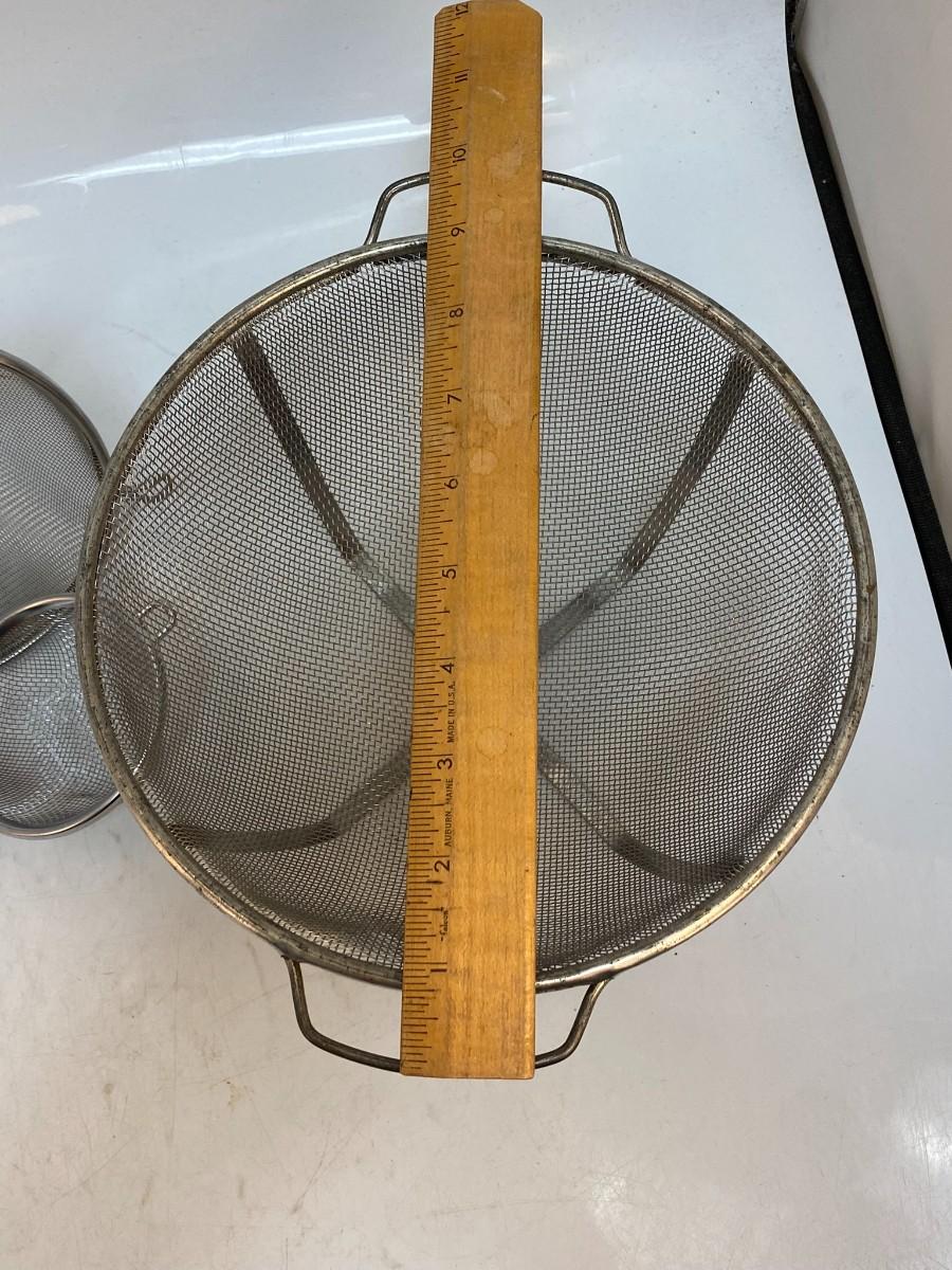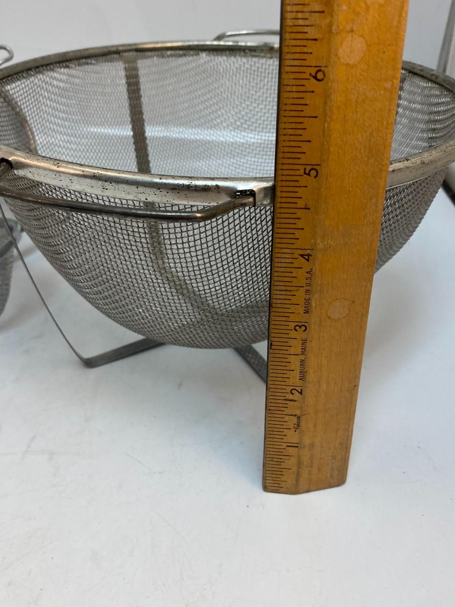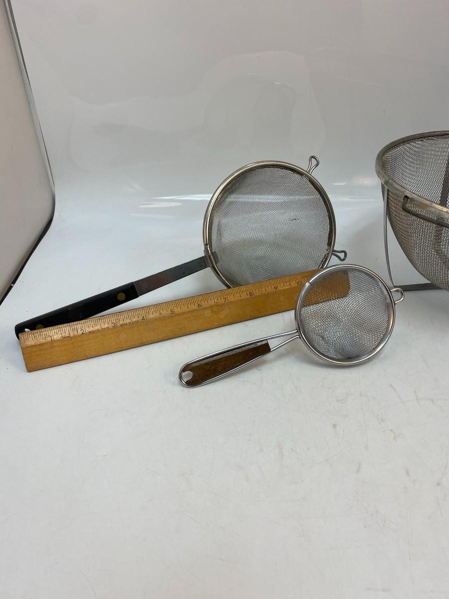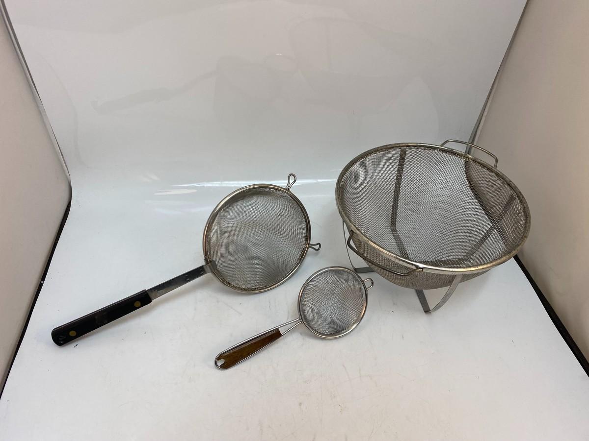 Lot of Three Various Sized Metal Strainer Colander. In good condition.