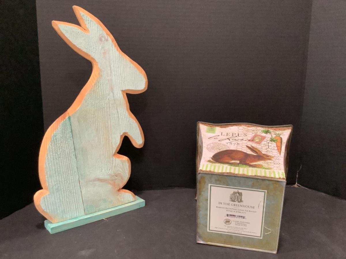 445 Wooden Bunny Stand and Decoupage Bunny Tin