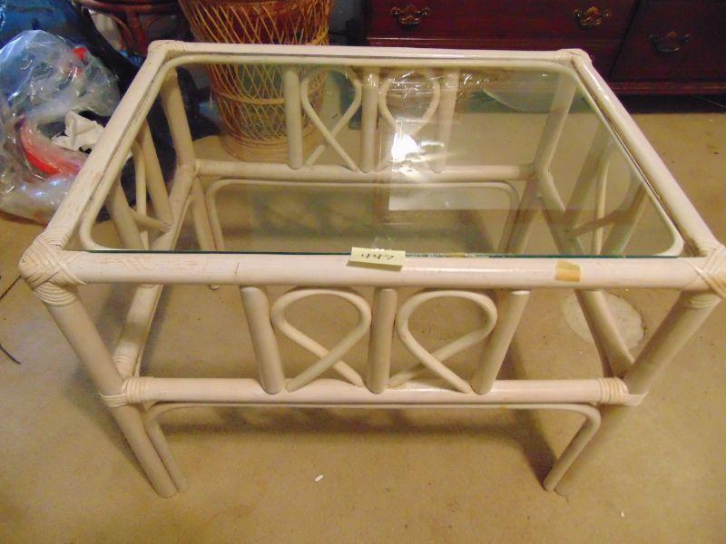 447 - White bamboo table with glass top -- 19 x 27 x 21 inches high
