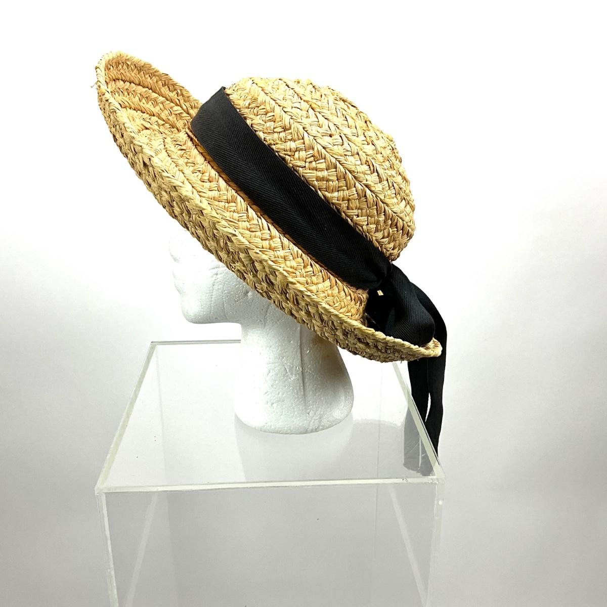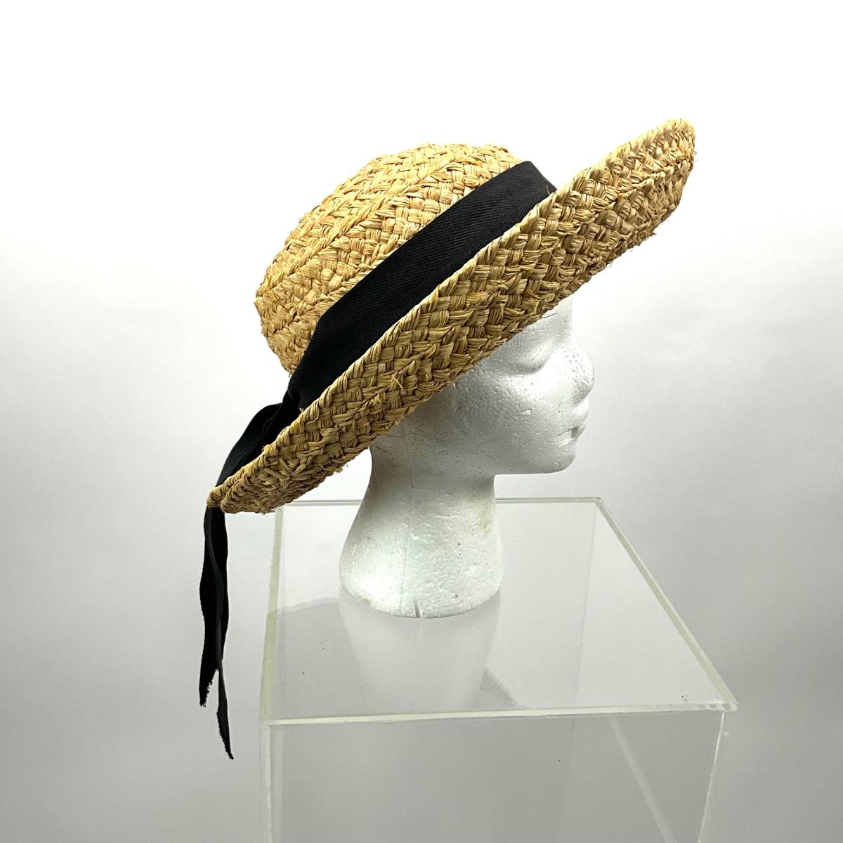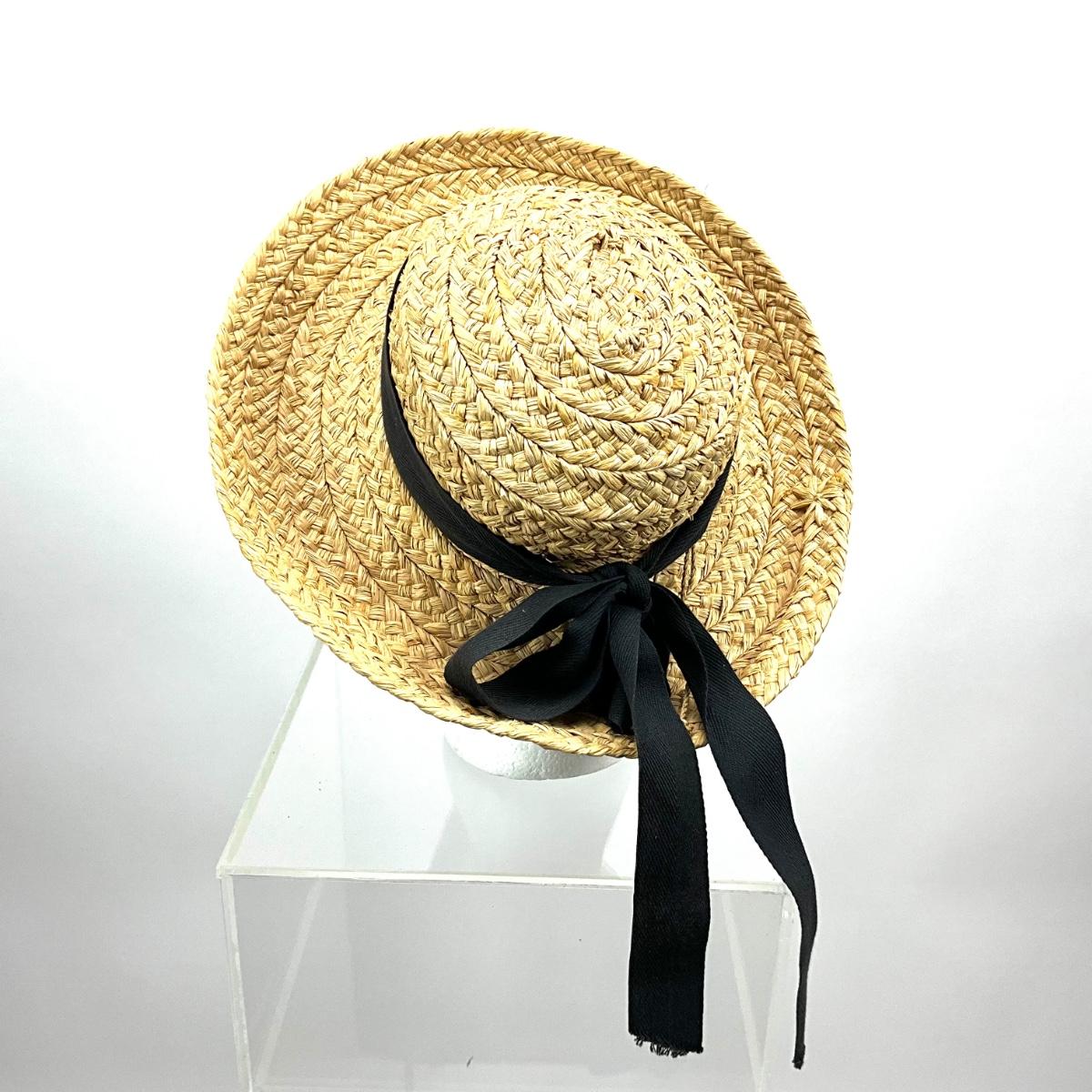 Straw hat with black bow, measures 13" in diameter from brim to brim and 7" in diameter for the head size.