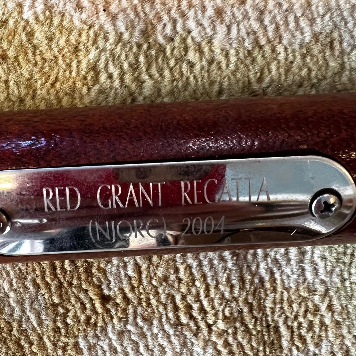 On stainless steel plate of the pole says “Red Grant Regatta (NJORC) 2004”Measures 6 feet.