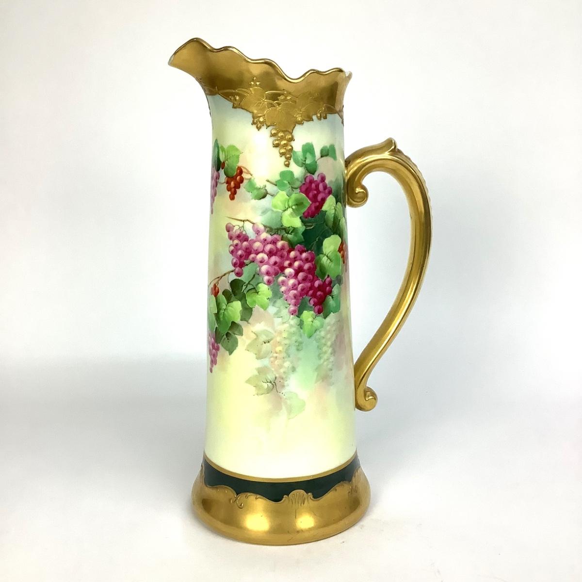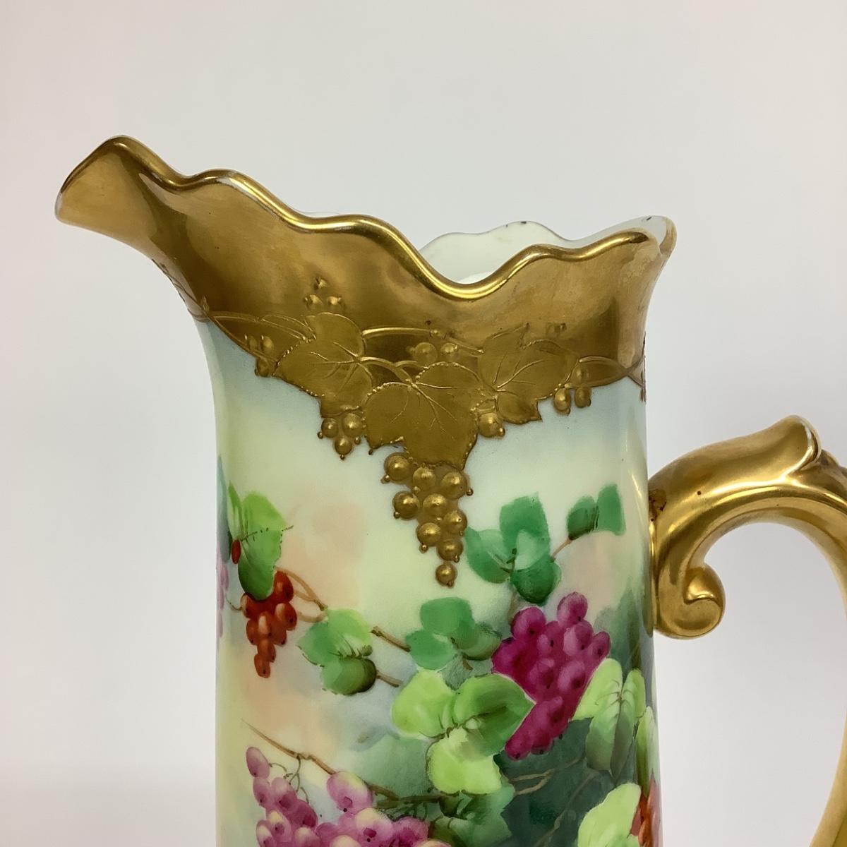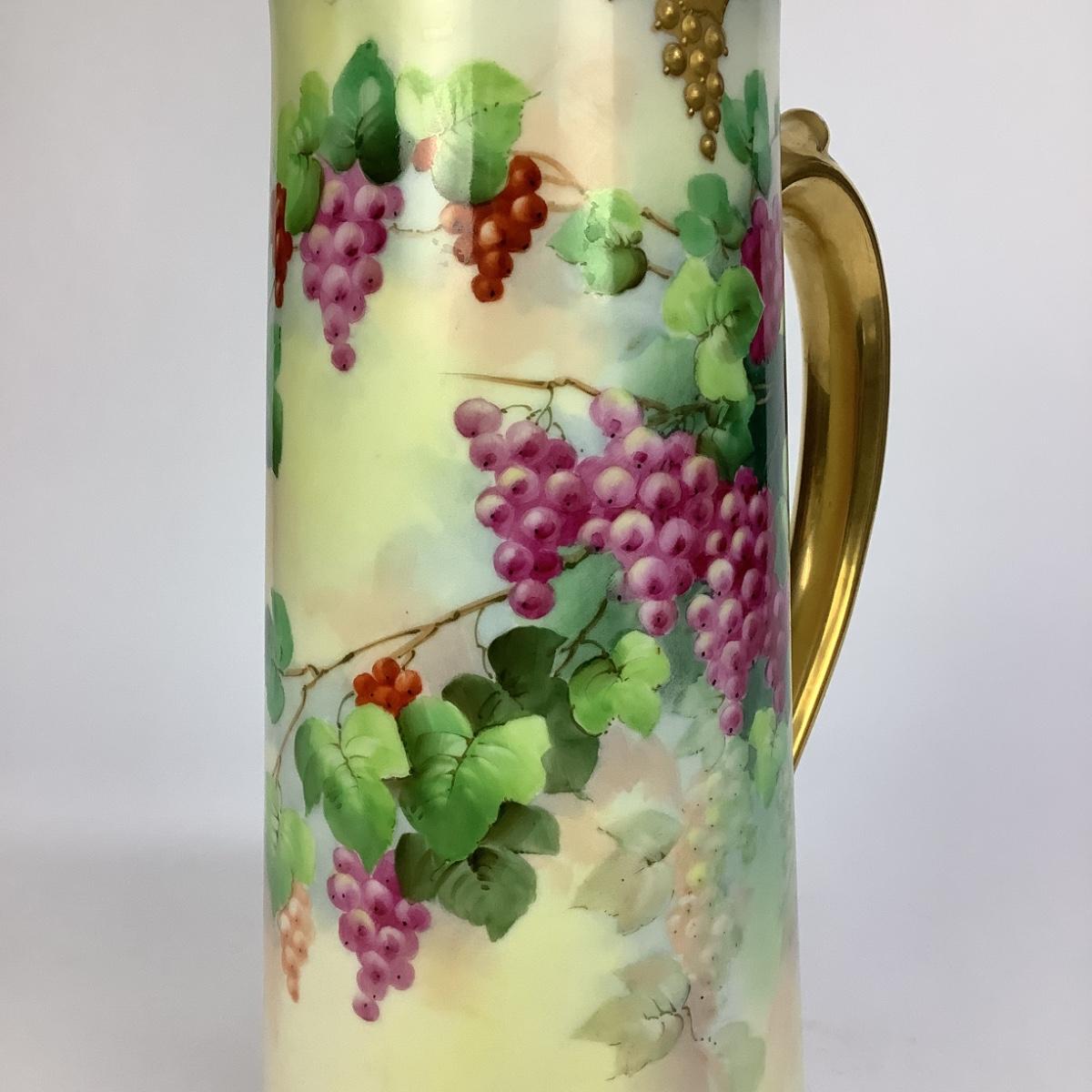 This tall Limoges pitcher is hand-painted decorated with bunches of grapes and gold gilt.