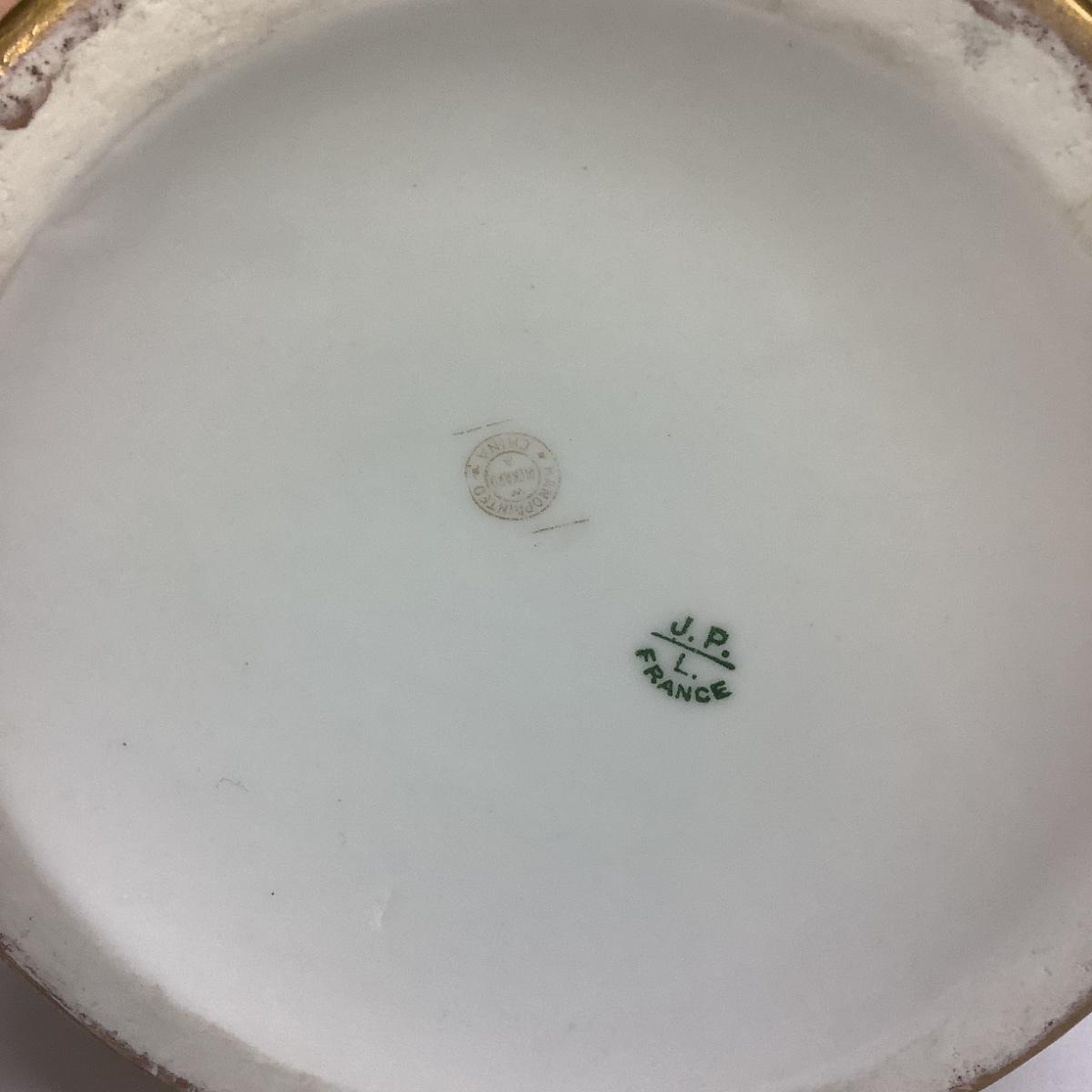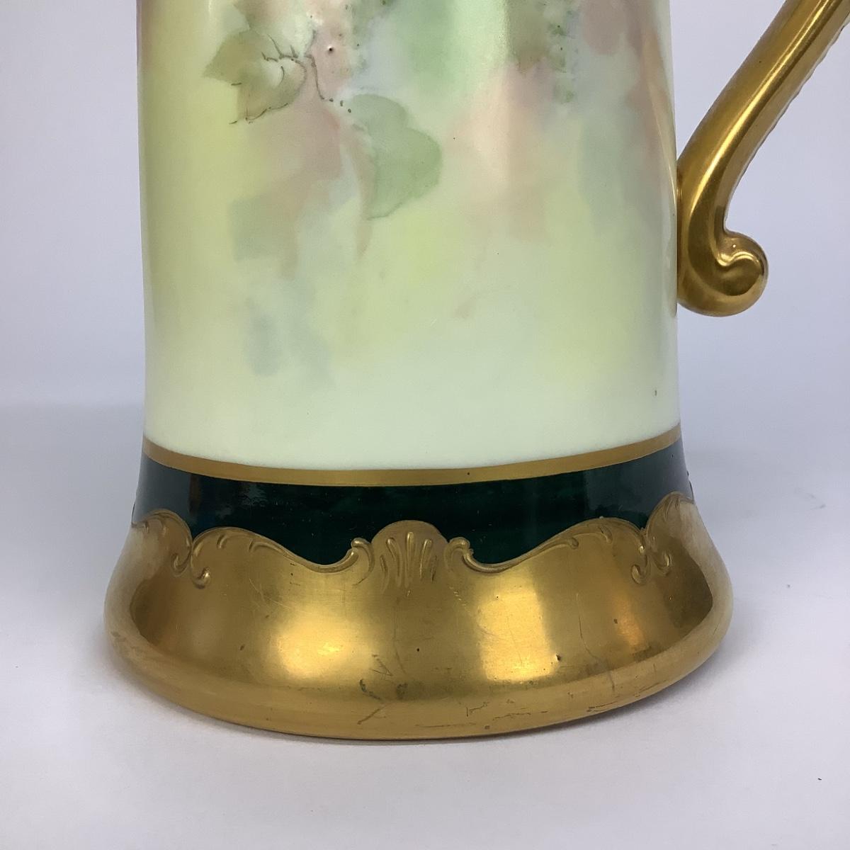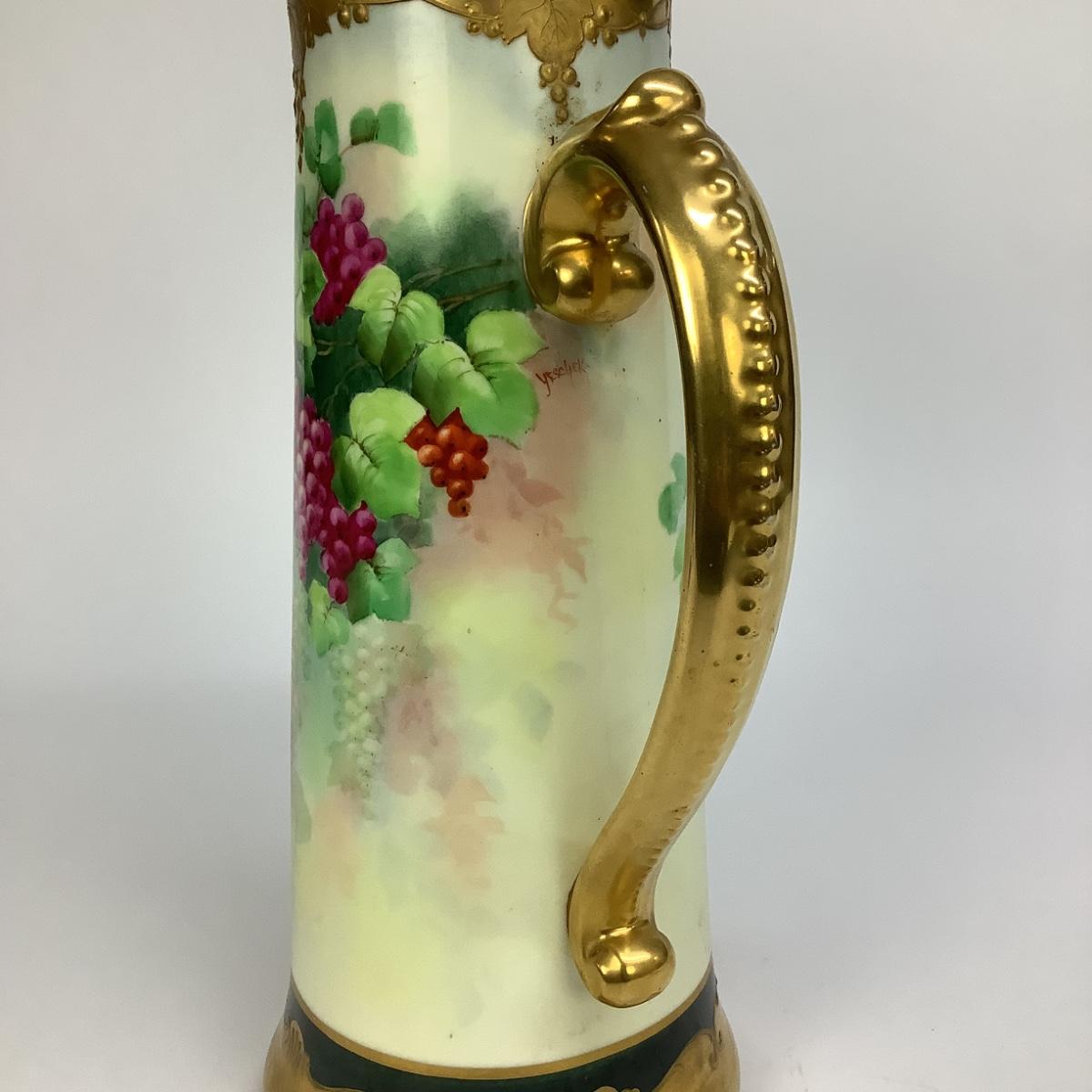 This tall Limoges pitcher is hand-painted decorated with bunches of grapes and gold gilt.