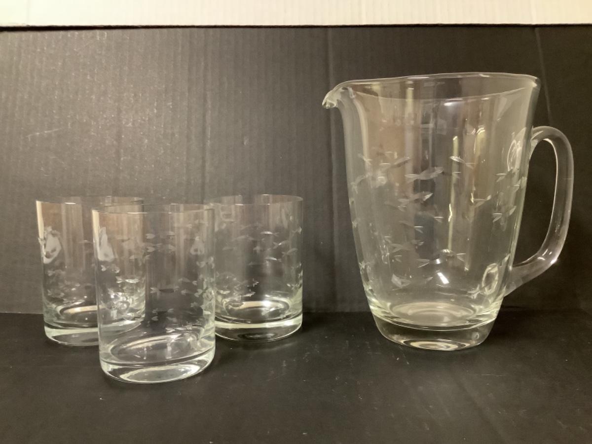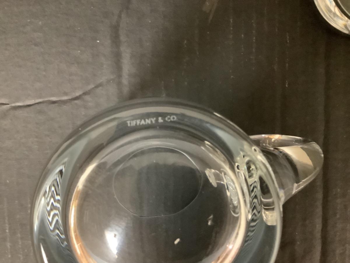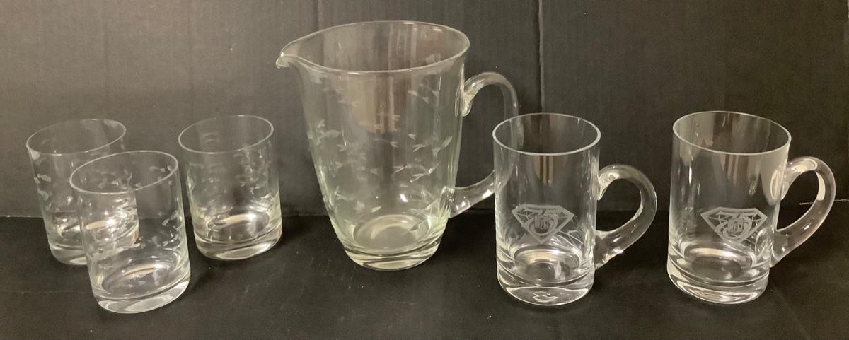 Pair of Tiffany and Co mugs, Etched Glass Swimming Fish Pitcher and three glasses