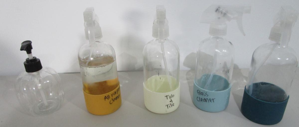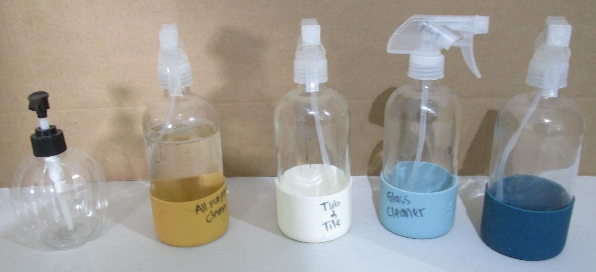 4 Grove cleaning bottles (one with all purpose cleaner in it), one hand soap bottle