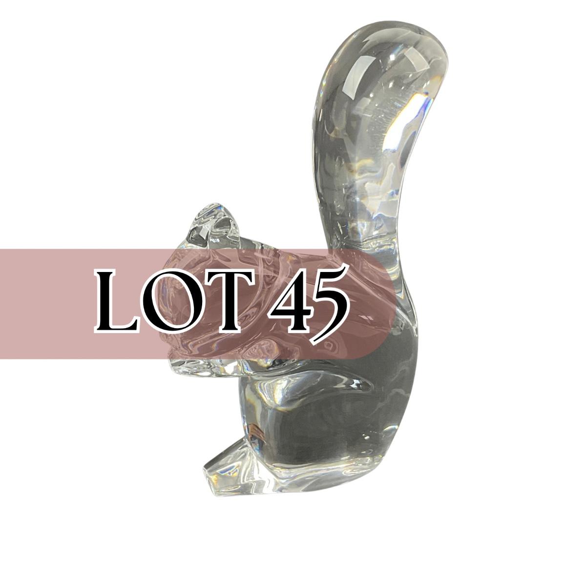 One Baccarat marked crystal squirrel figure. This piece does have a chip or slight damage on its face. Otherwise in good shape. Please see photos for details and condition. Any condition statement is given as a courtesy to a client, is an opinion, and should not be treated as a statement of fact. Reference to condition written, oral or within a condition report shall not be regarded as a full account of condition and may not include all defects, alterations, or restorations. Absence of a condition report does not imply a lot is flawless or lacking imperfections or damage. Katherine’s Auction & Appraisal Service shall have no responsibility for any error or omission. Returns shall not be accepted on the basis of condition. ::: Shipping is available on this lot. If you require shipping you must let us know at the close of the auction. We will coordinate with you after the item has been won. Shipping fees will include insurance up to or exceeding the value of all items being mailed. If you have any questions regarding this lot please contact the auctioneer either via this website, by direct email or by phone. PICK UP TIMES and other important information can be found in the TERMS and DESCRIPTION of the auction. Please take a look for pertinent information. Thanks!