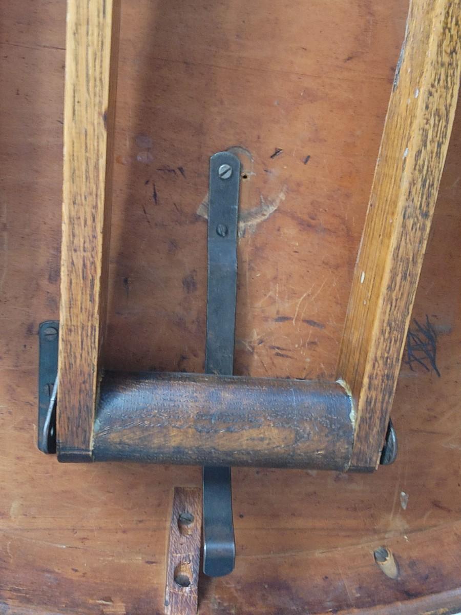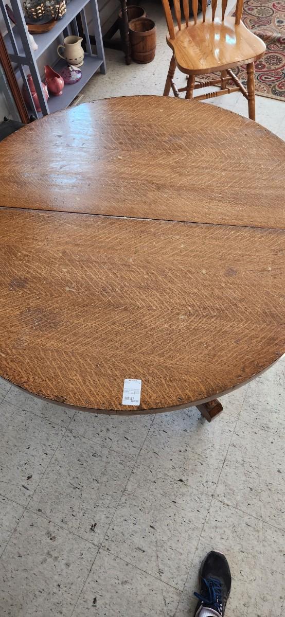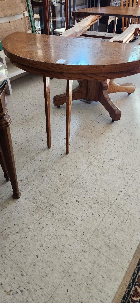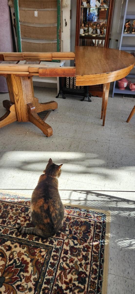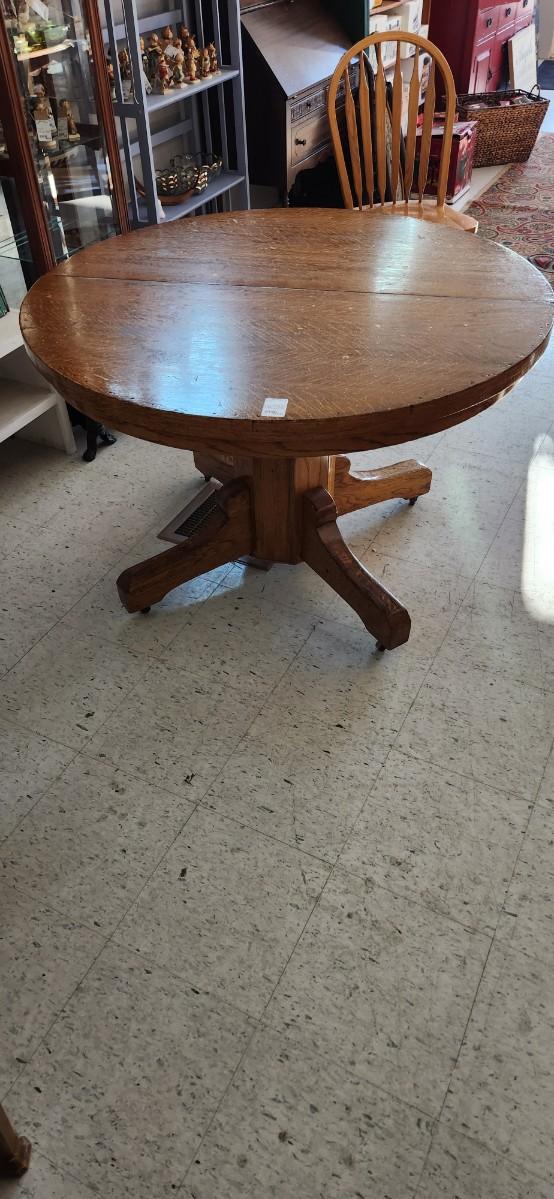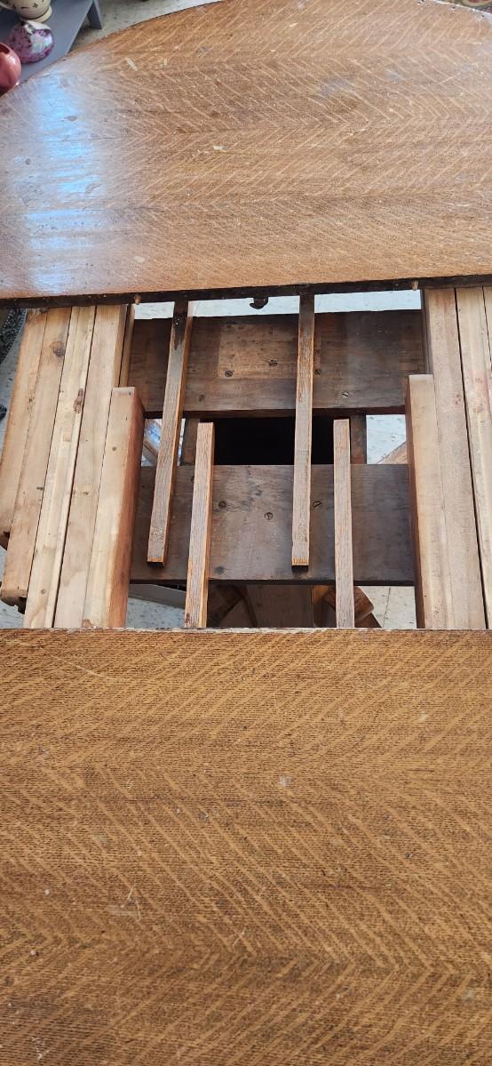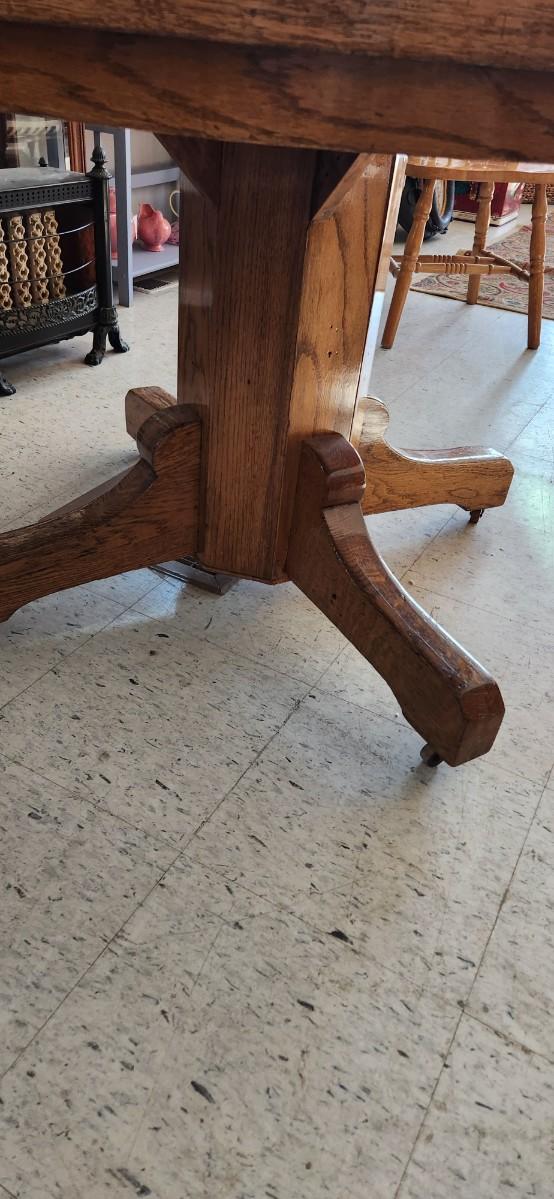 This has very interesting mechanisms that allow legs to drop down for stability as you extend this table. It can pull out to 102"!!! I have 2 leaves for it as well. Neat antique piece.