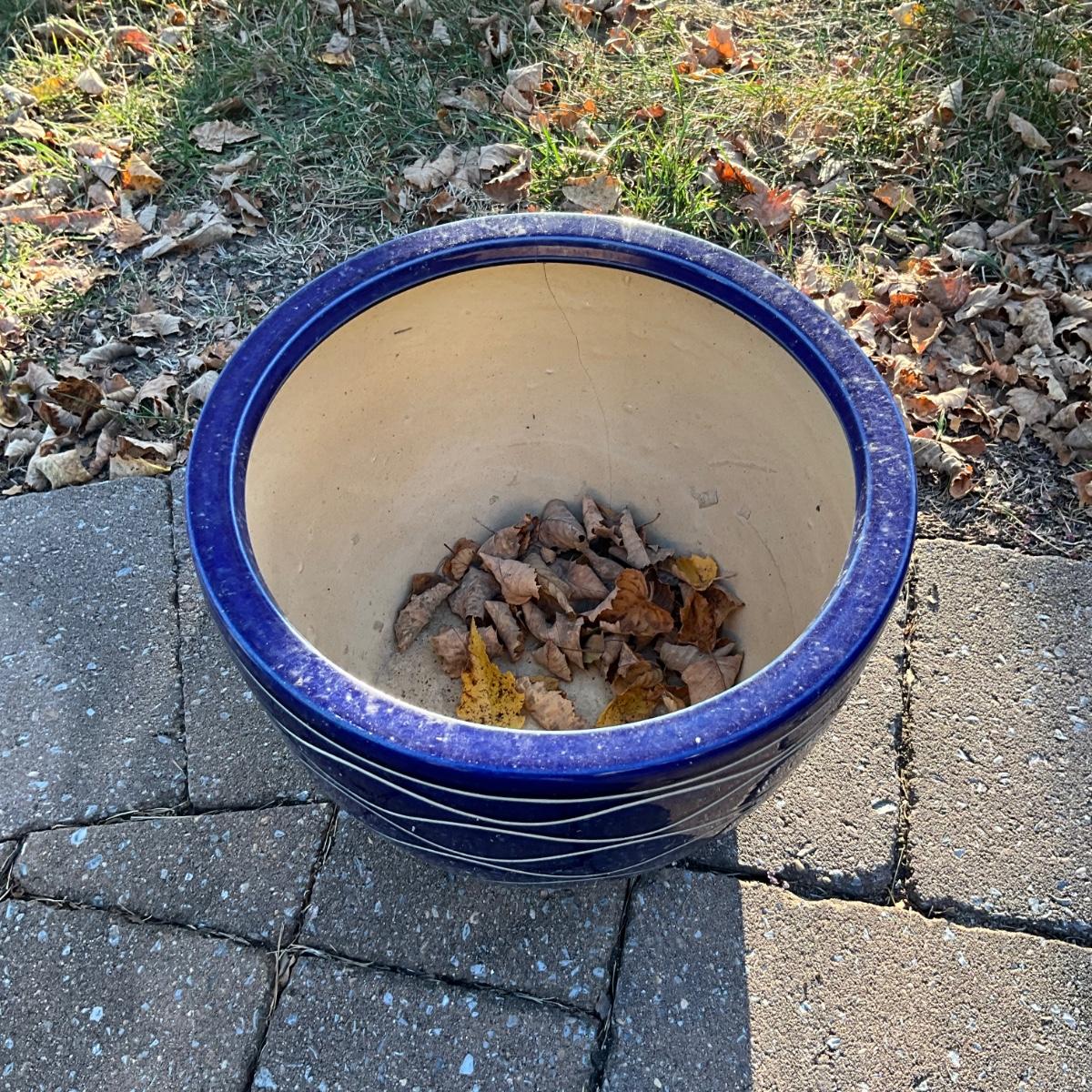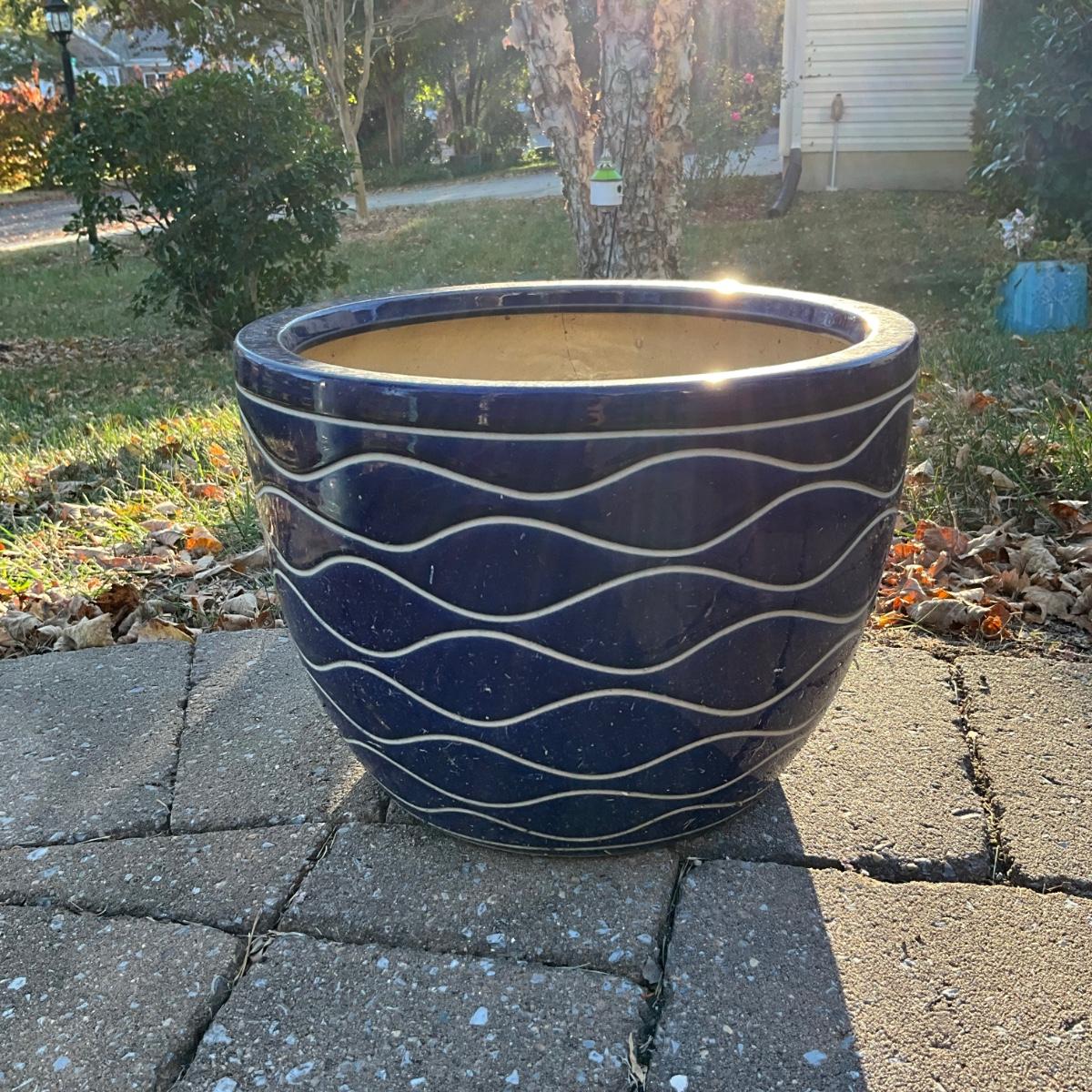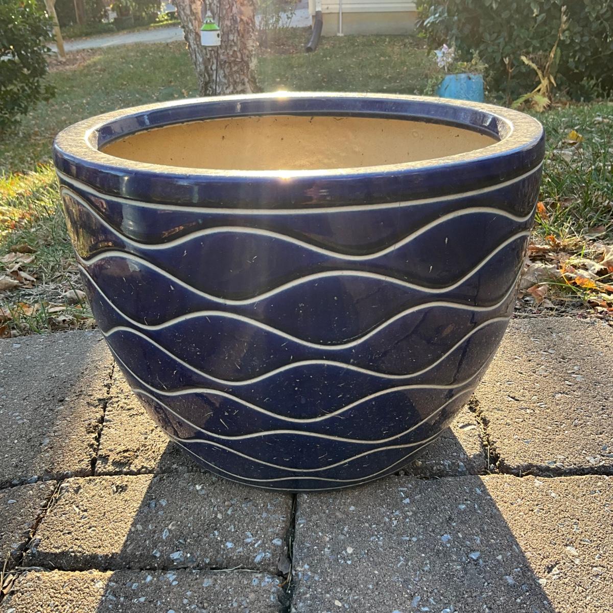 one planter with white pattern has crack from top to bottom.