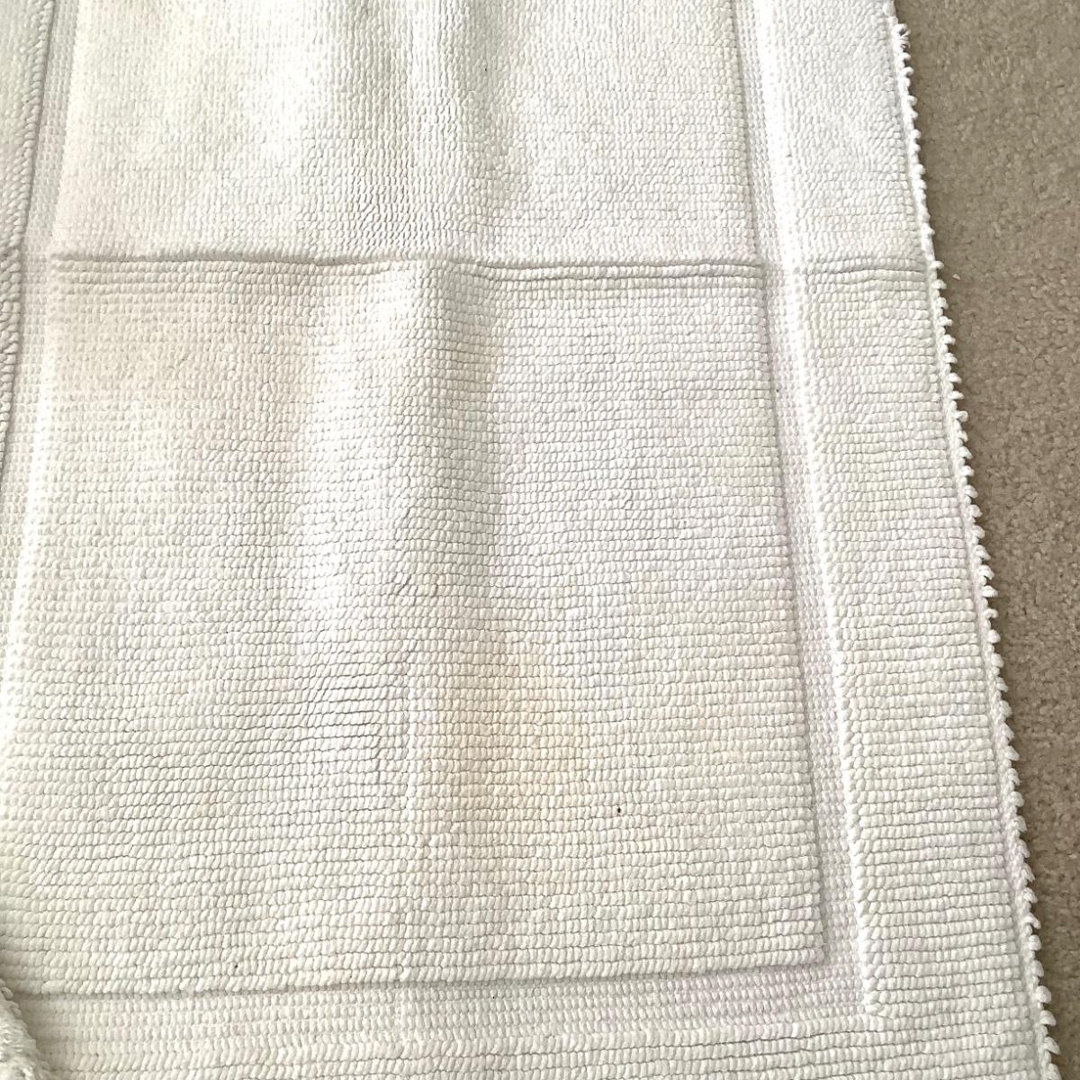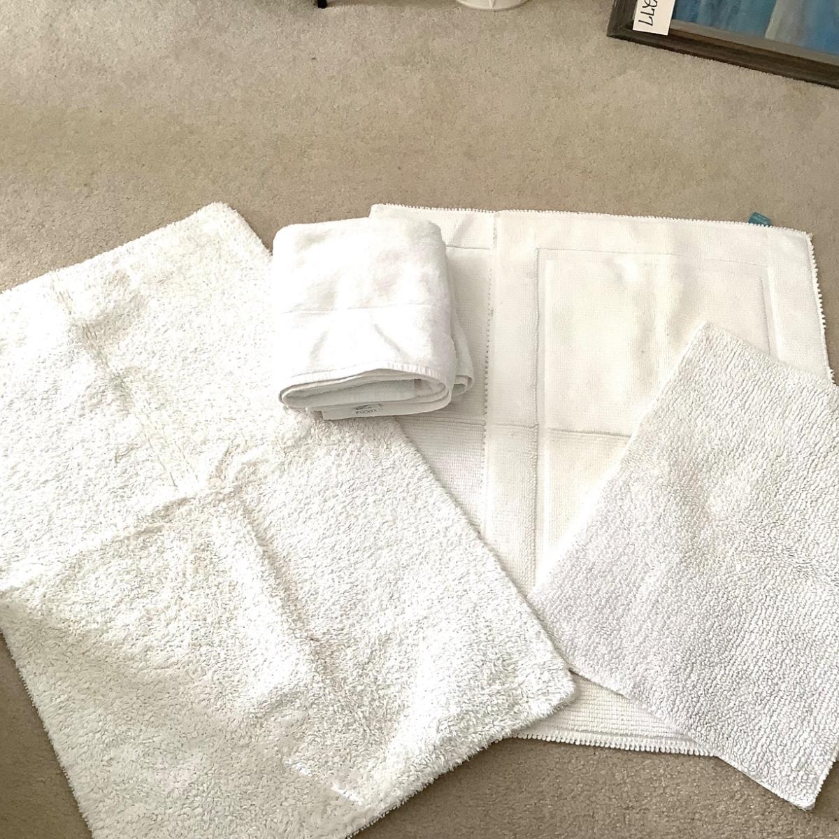 Two white body towels with two white bath rugs measuring 35" x 21" (one has spot)