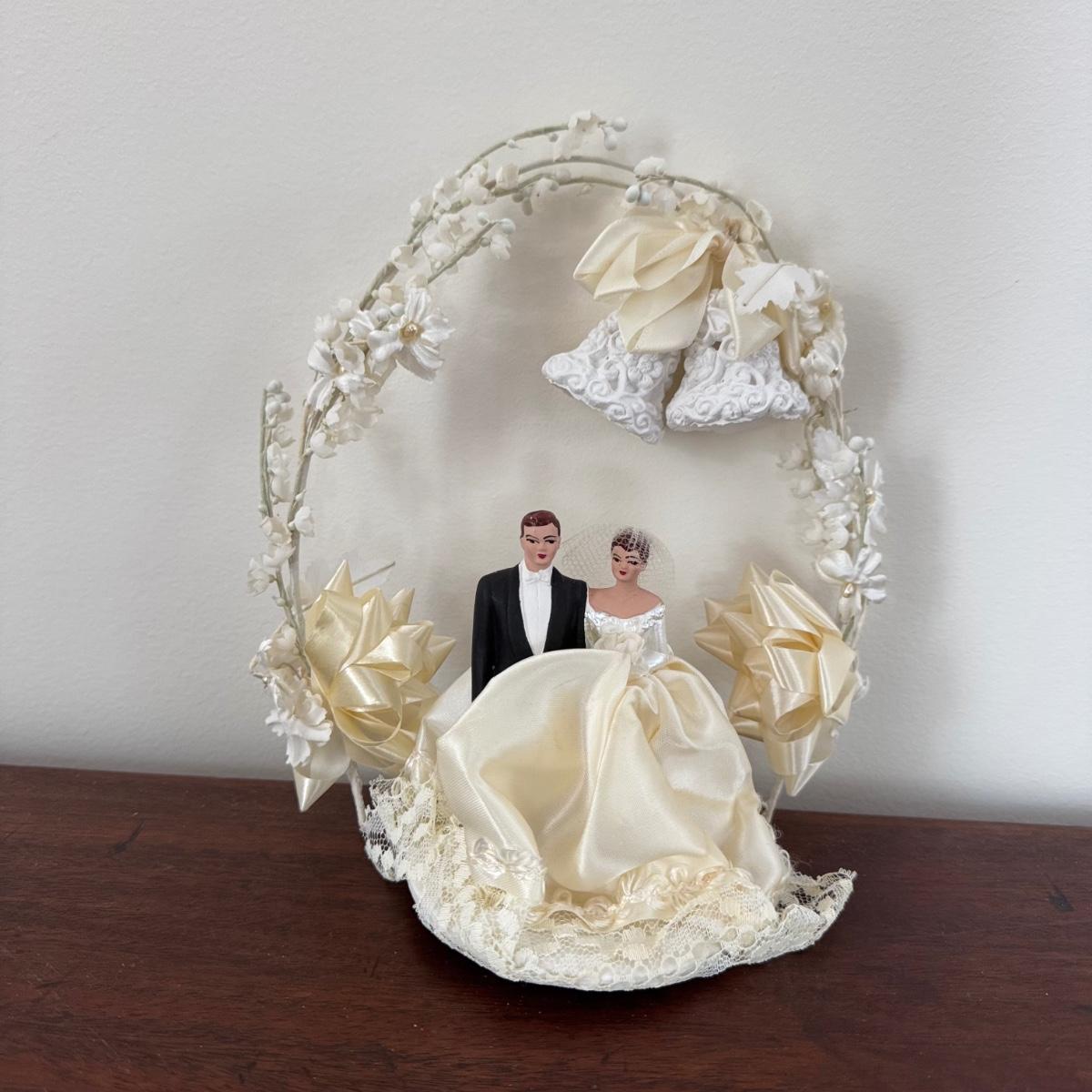 452 Vintage 1950’s Plaster Wedding Cake Topper. Bride and Groom with Arch