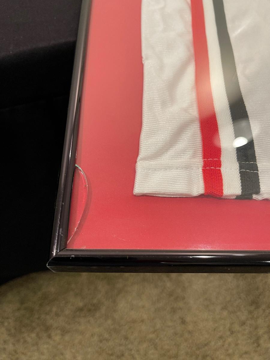 Signed and Framed we will ship but not the frame! Jersey only. Frame is Cracked soooo.