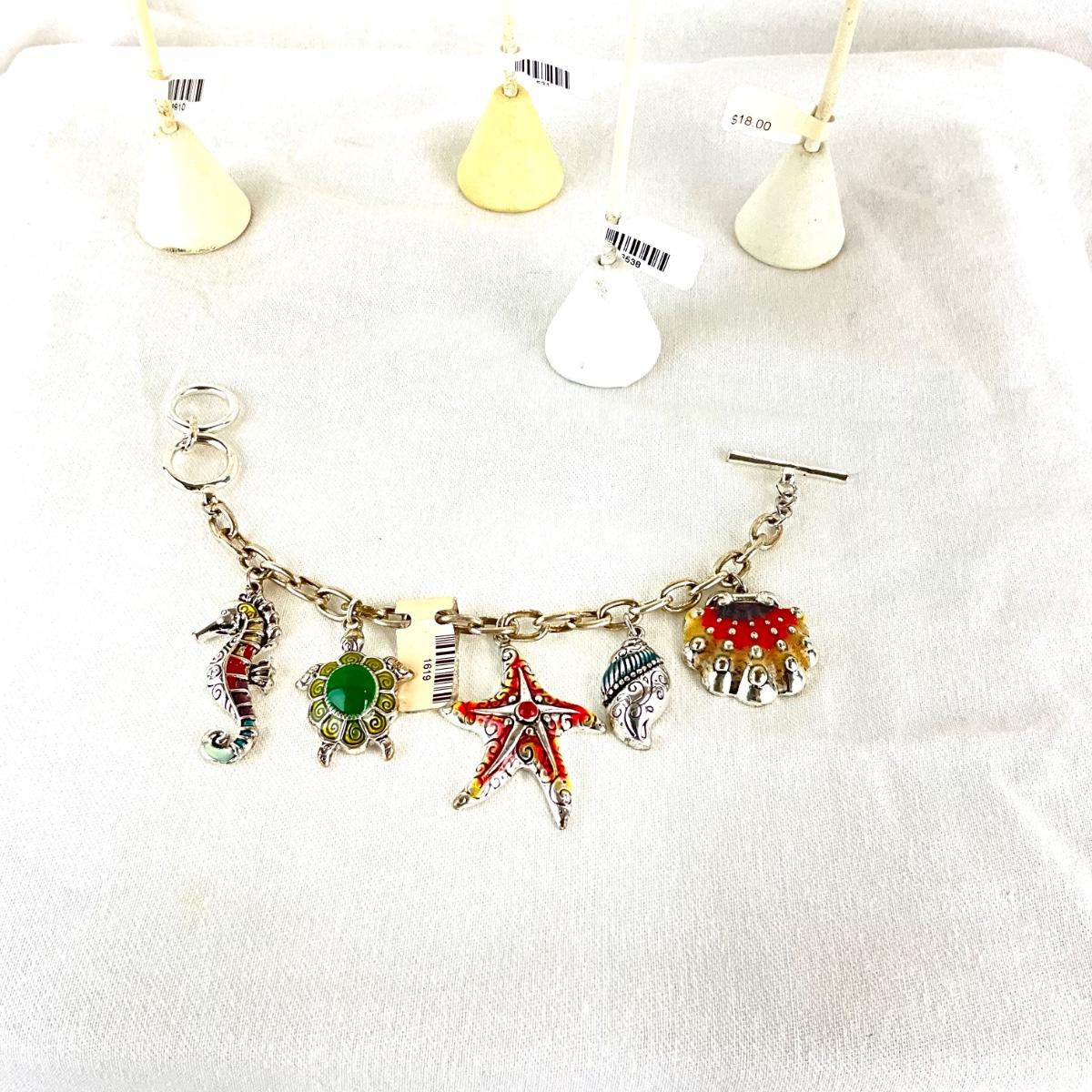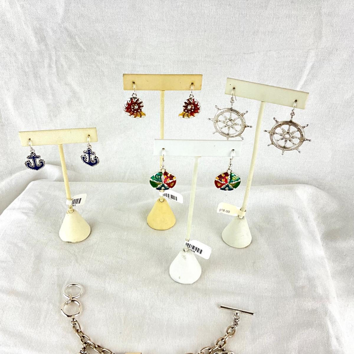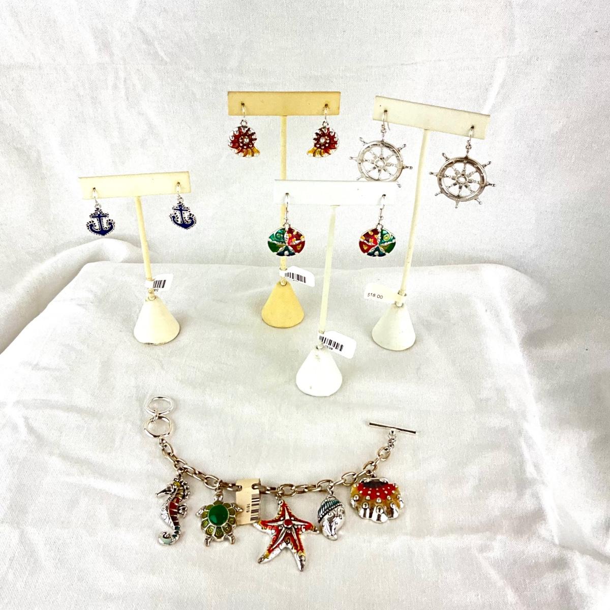 Four pairs of earrings , three which are enameled, one enameled starfish, crabs, seashell bracelet