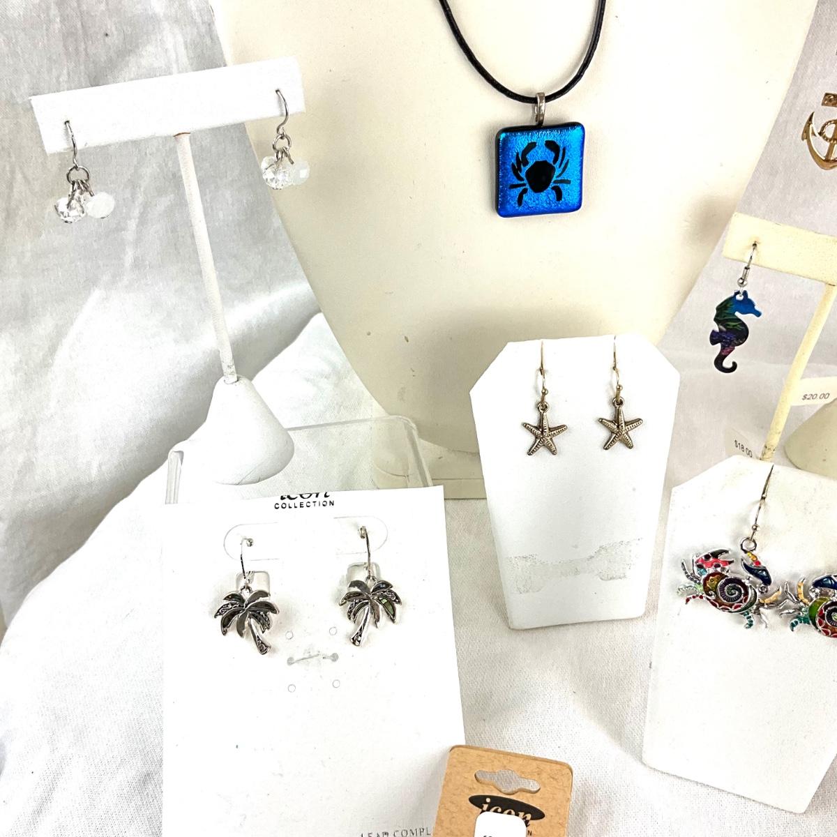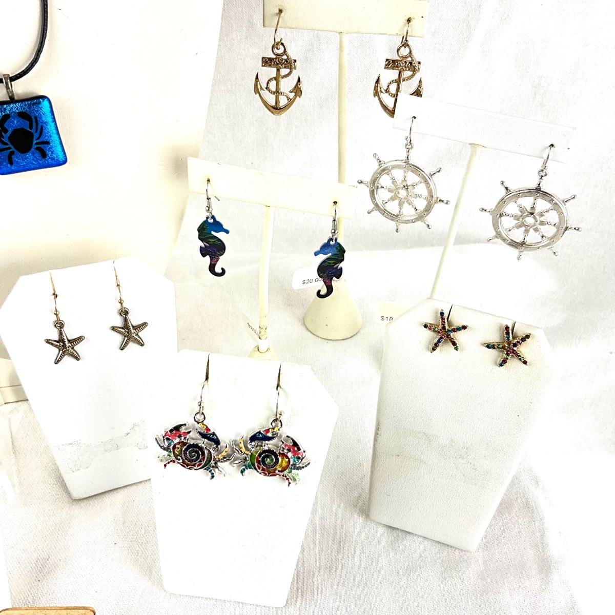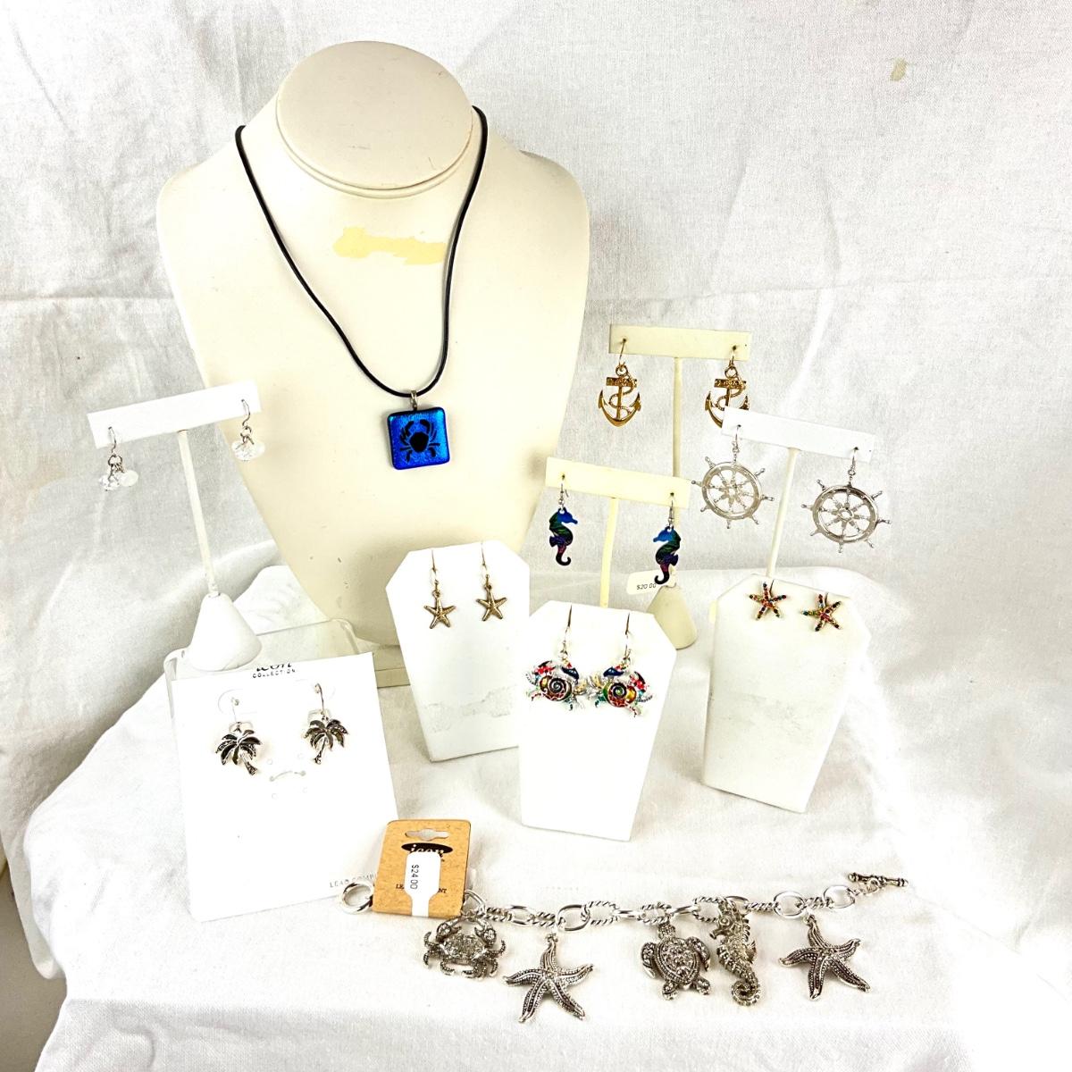 Fused crab necklace on leather , nautical anchor, starfish, ship's wheel earrings with Silvertone nautical bracelet