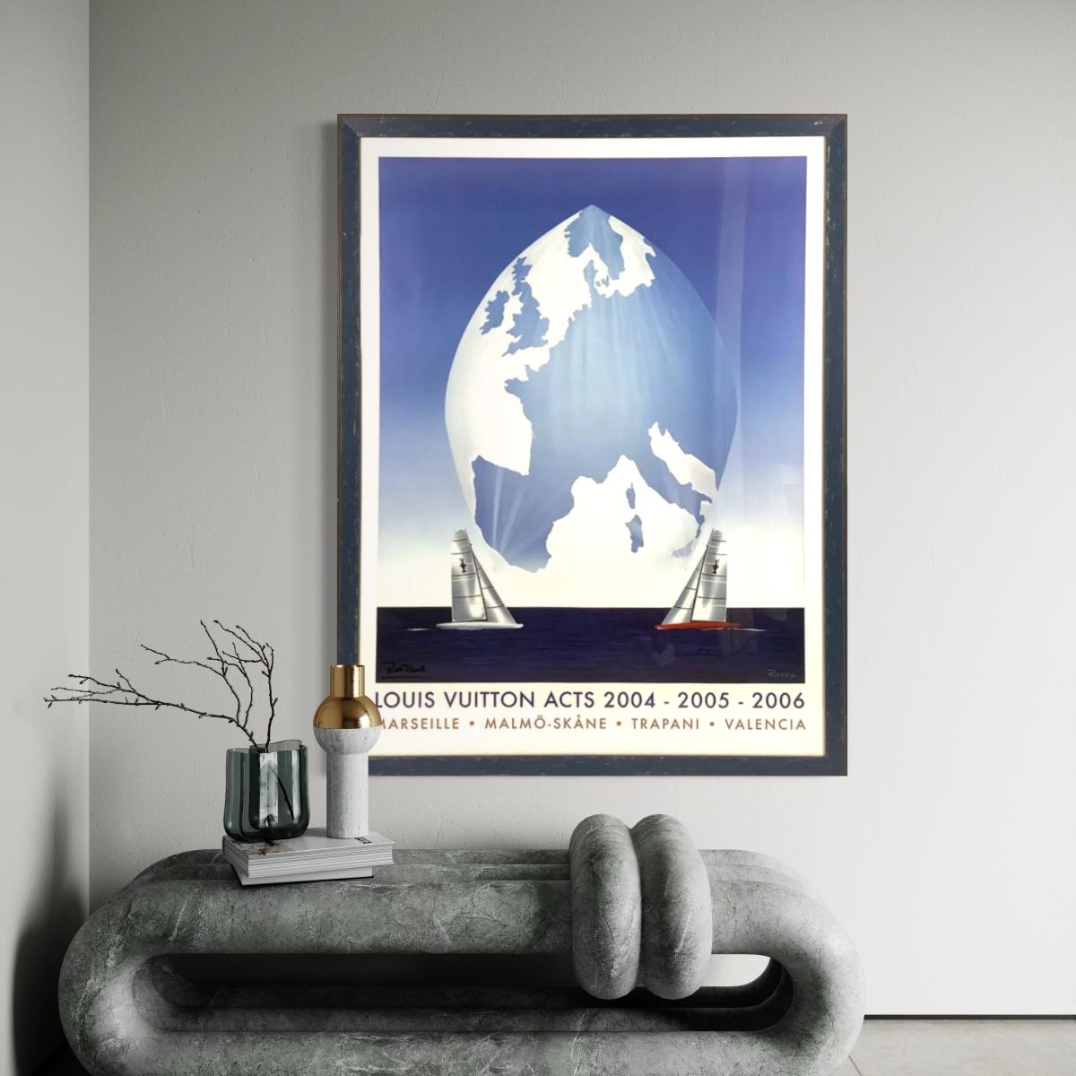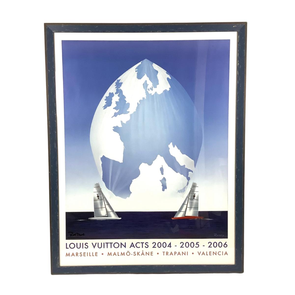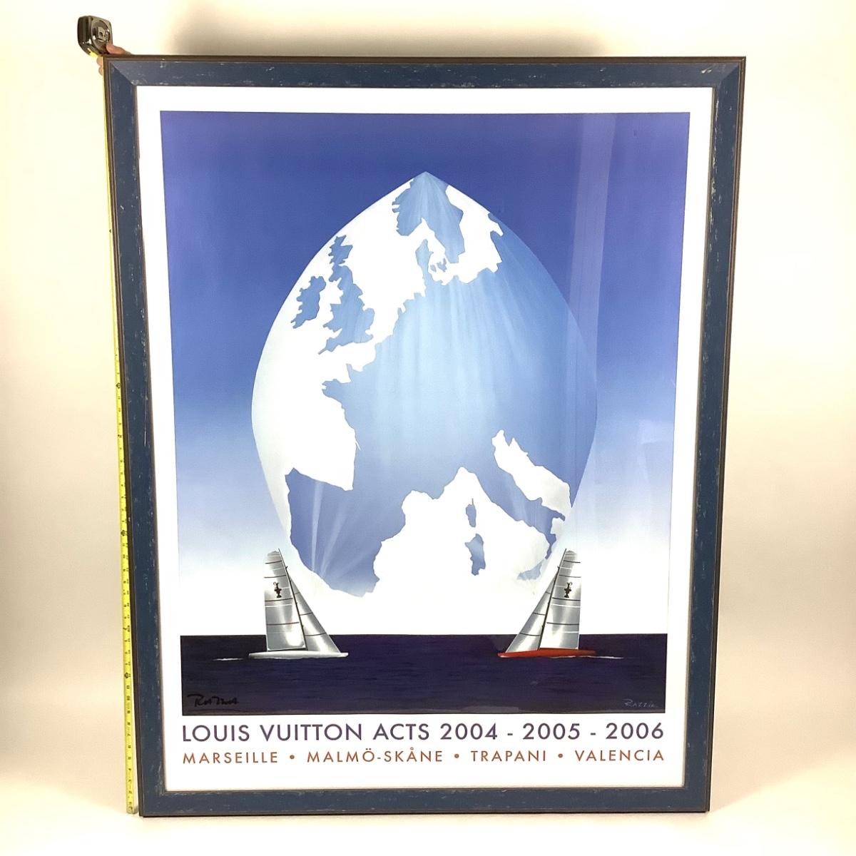 Beautifully illustrated by the iconic Razzia during the long collaboration between the artist and the fashion house, this serigraph lithograph poster is hand signed.Framed Louis Vuitton Acts 2004-2005-2006 "MARSEILLE, MALMÖ-SKÅNE, TRAPINI, VALENCIA" in pained blue wood frame. Glass is UV protected.