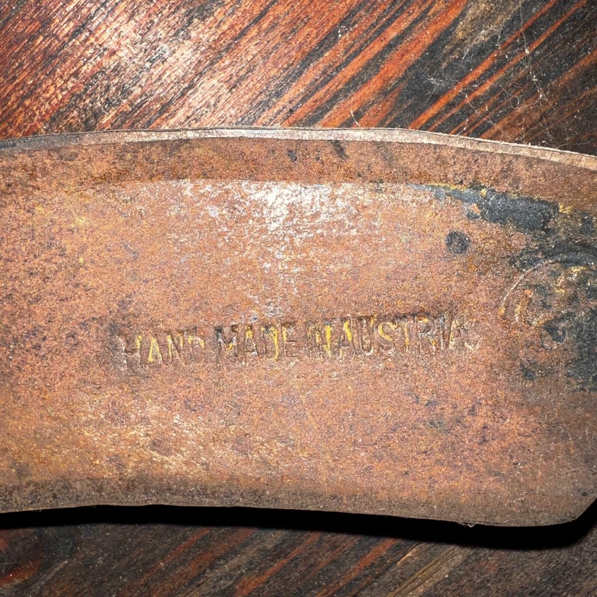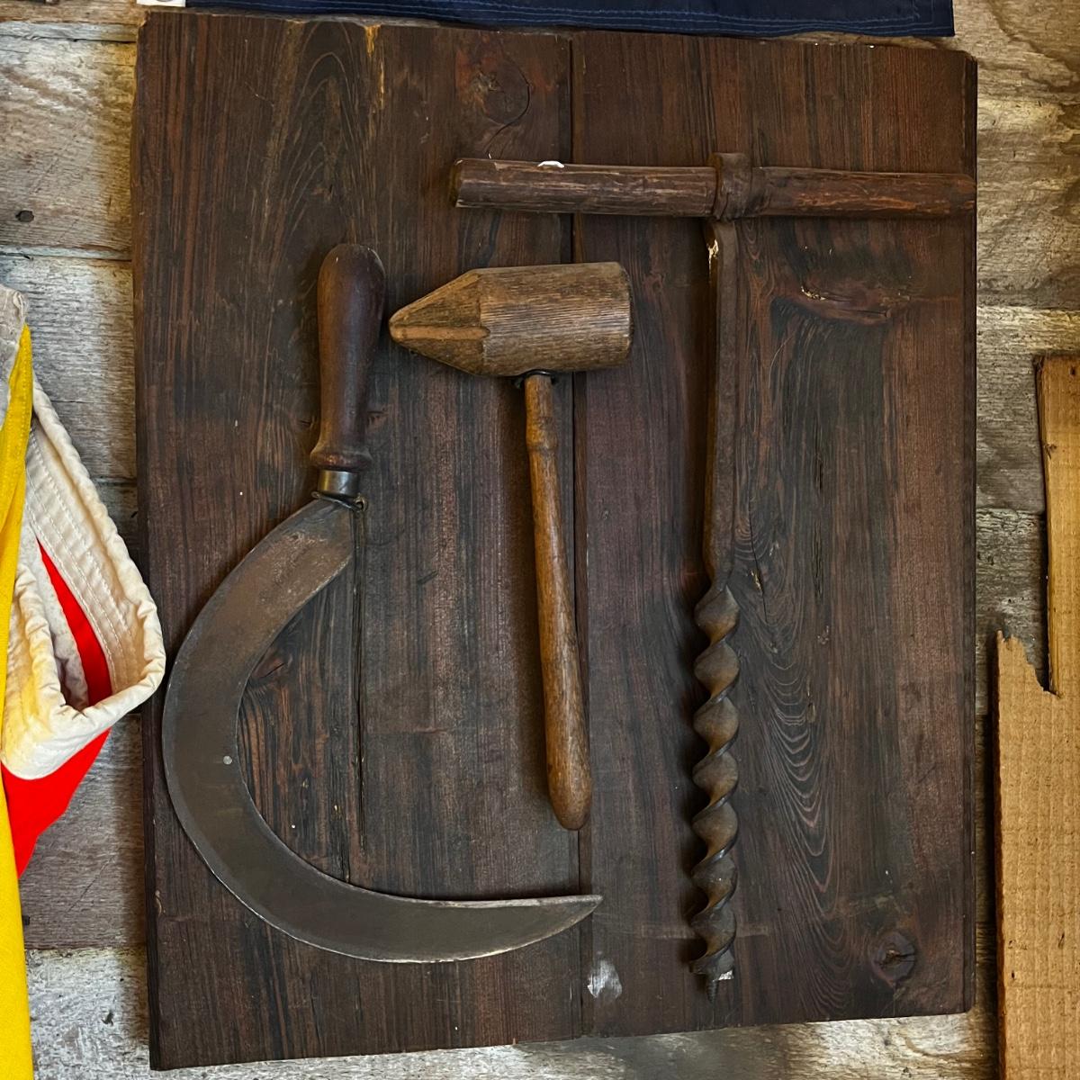 Featuring various tools mounted on boards. Hand auger, wood coned furniture mallet, hand sickle hand made in Austria.