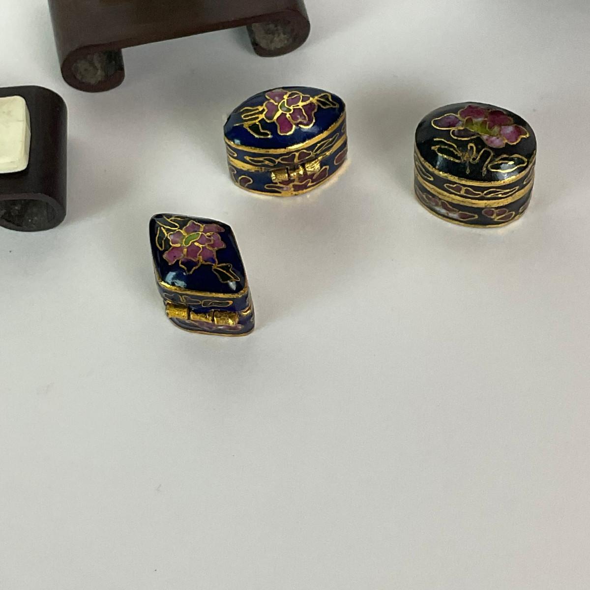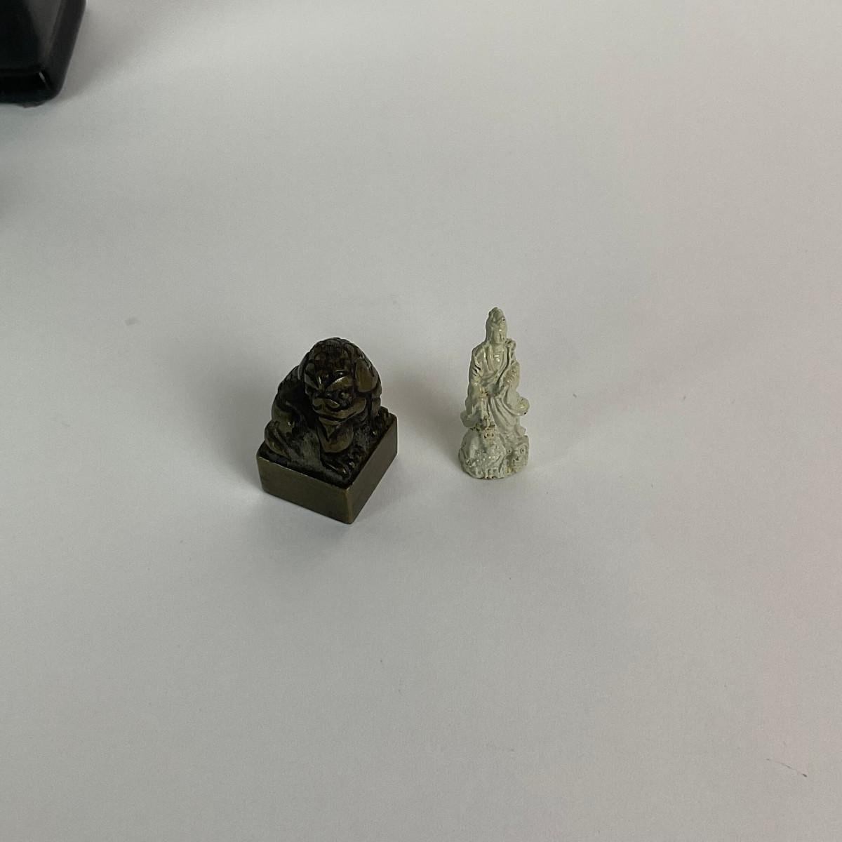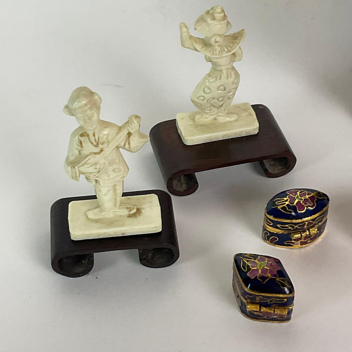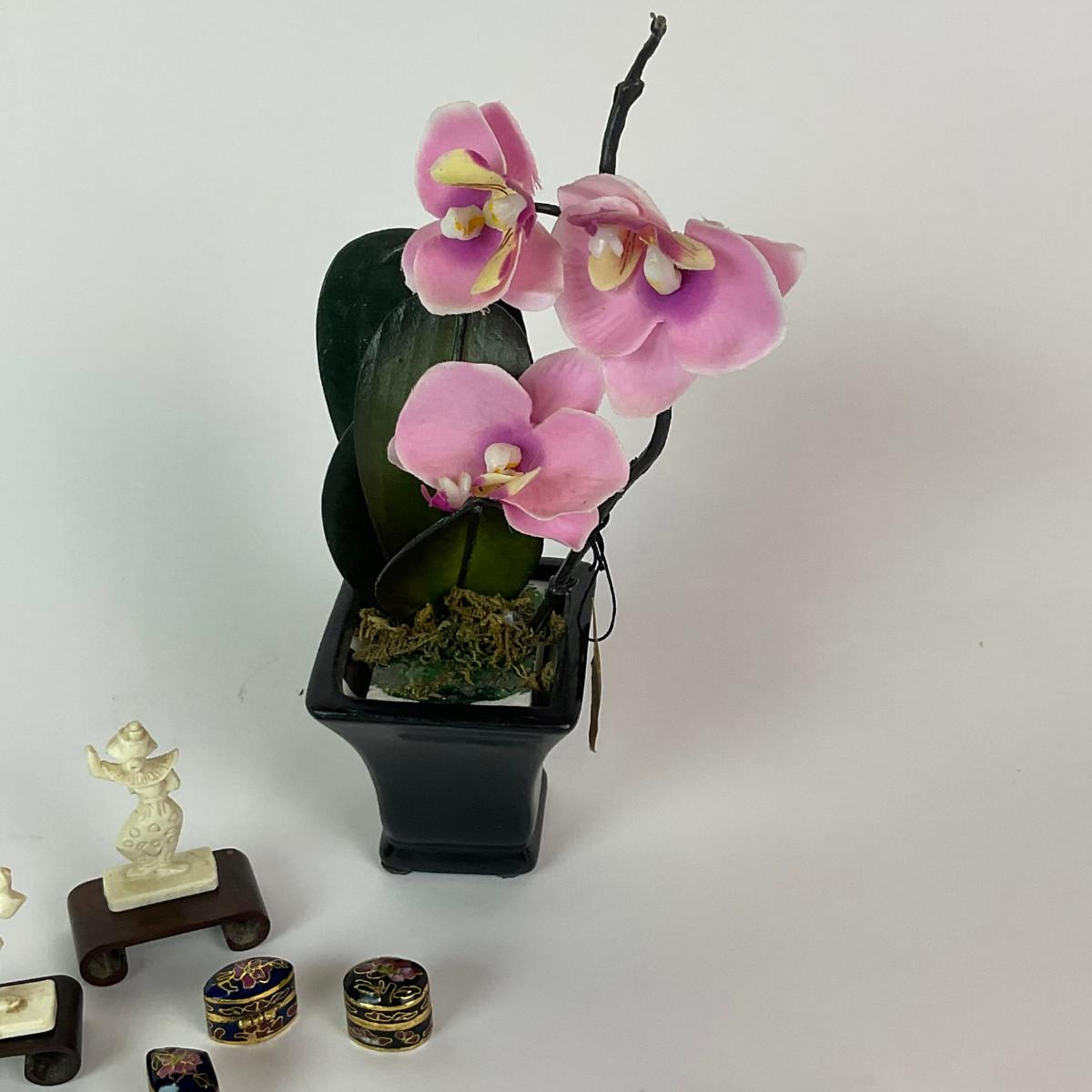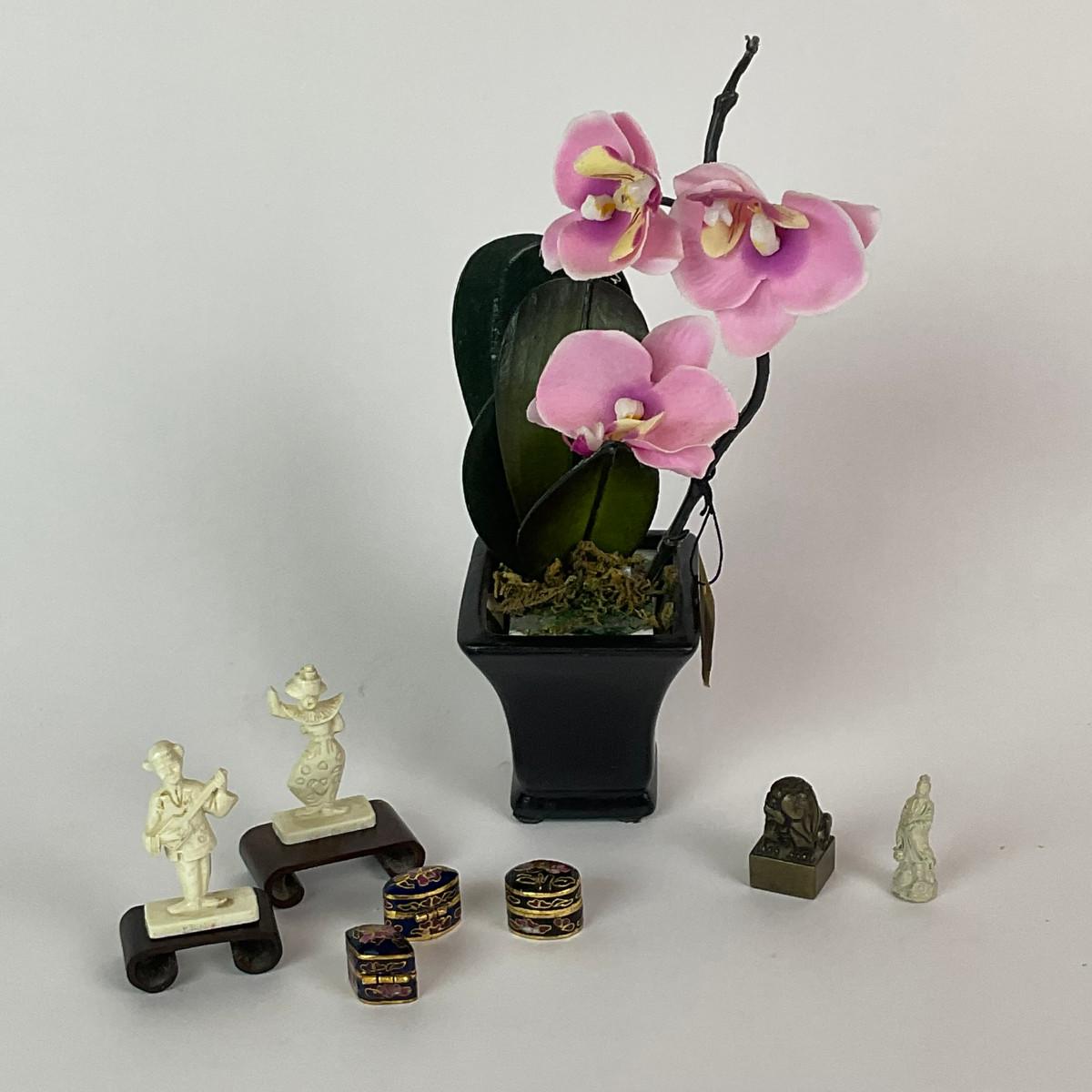 Small trinket boxes, foodog bronze paperweight, faux orchid (8" high)