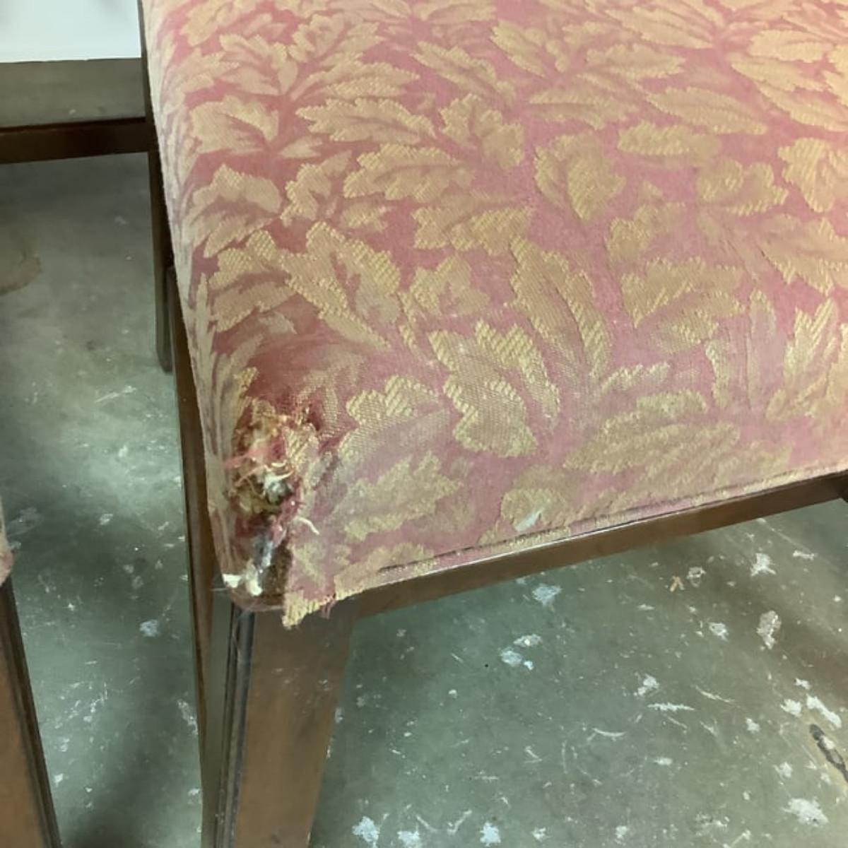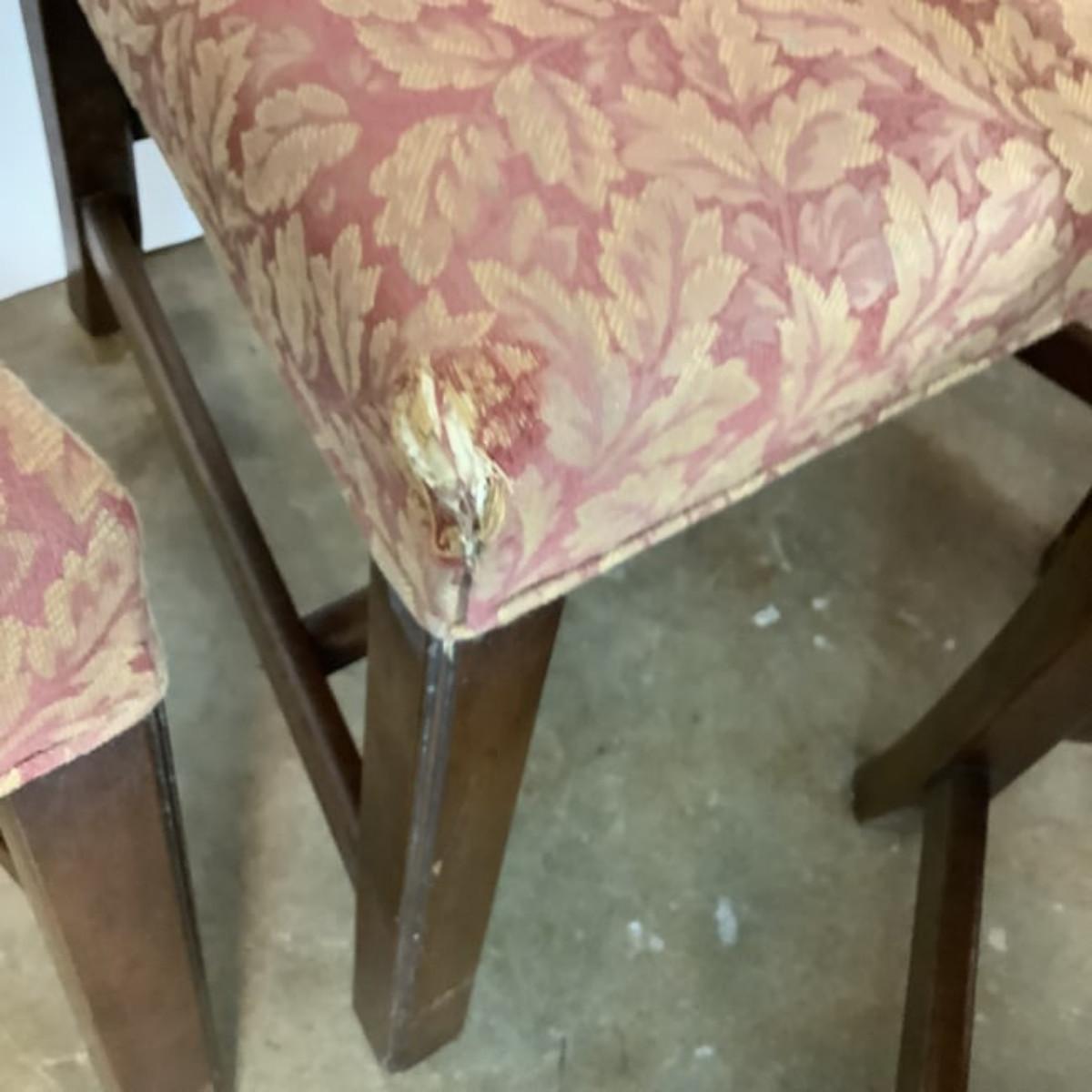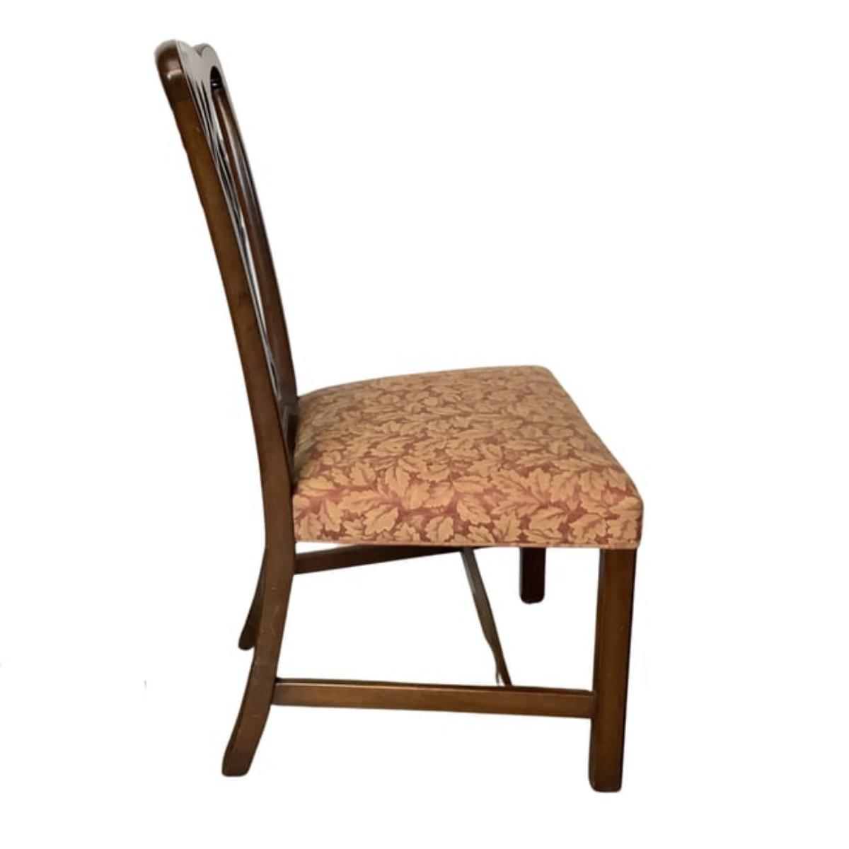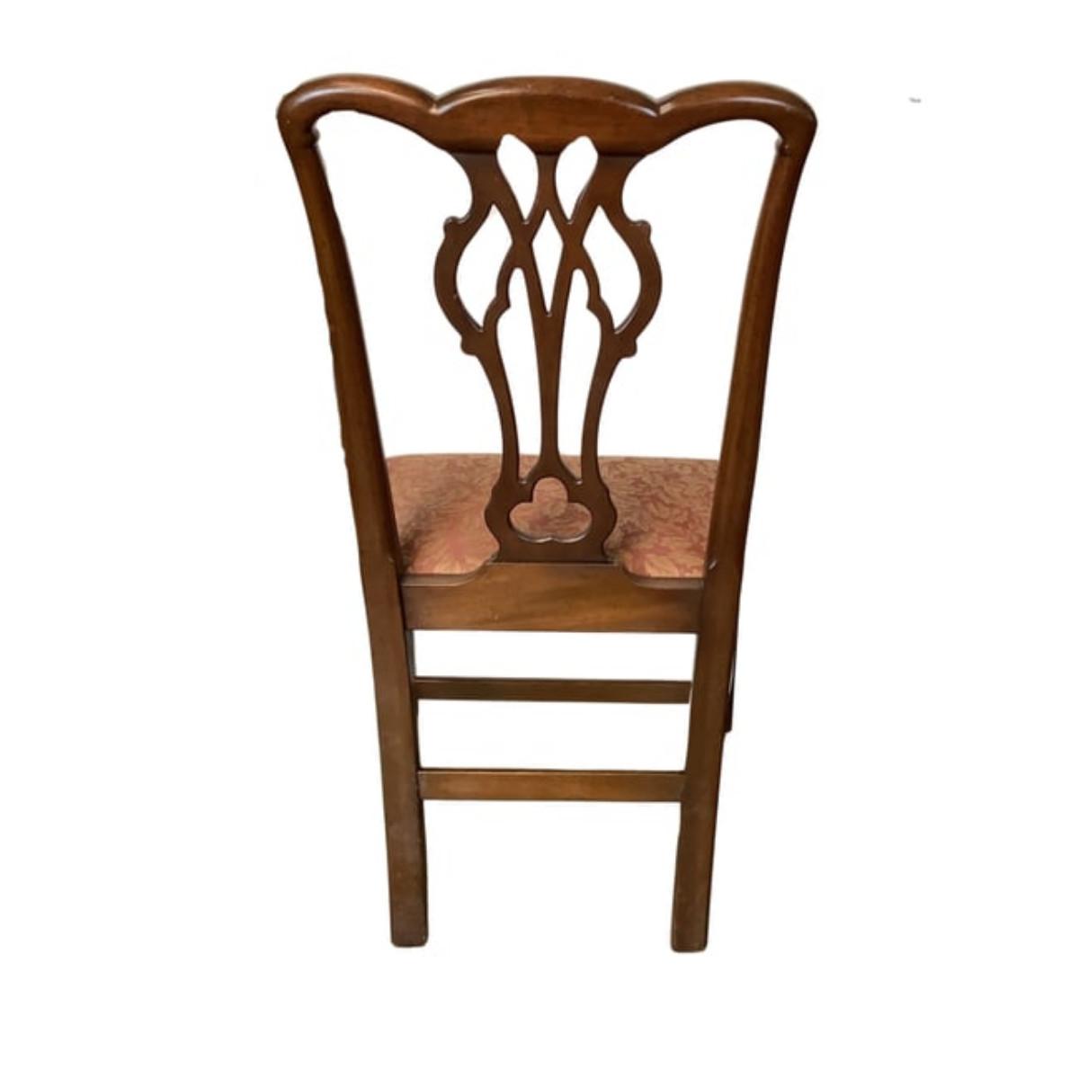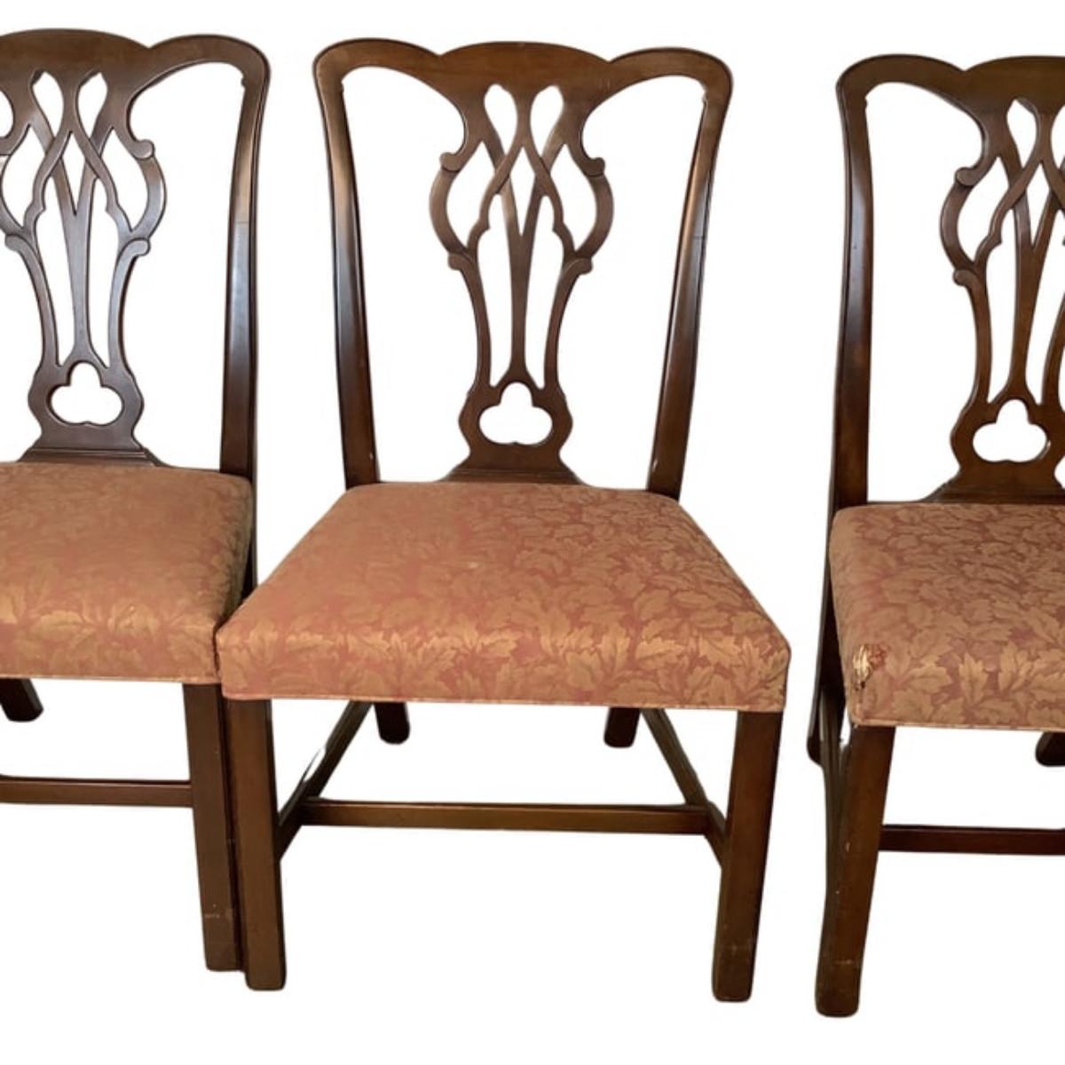 Kittinger Chippendale chairs are high-quality reproductions of 18th-century Chippendale furniture, known for their elegance and craftsmanship. These chairs are made by the Kittinger Furniture Company, which has a long history of producing fine furniture in the United States.Key features.Kittinger Chippendale chairs are a beautiful and timeless addition to any home. With their classic designs and high-quality craftsmanship, these chairs are sure to be treasured for generations to come.2 chairs upholstery have damage to front seat corners which are located in photos.All chairs measure 22"W x 38"H x 17"D x seat height is 18"H