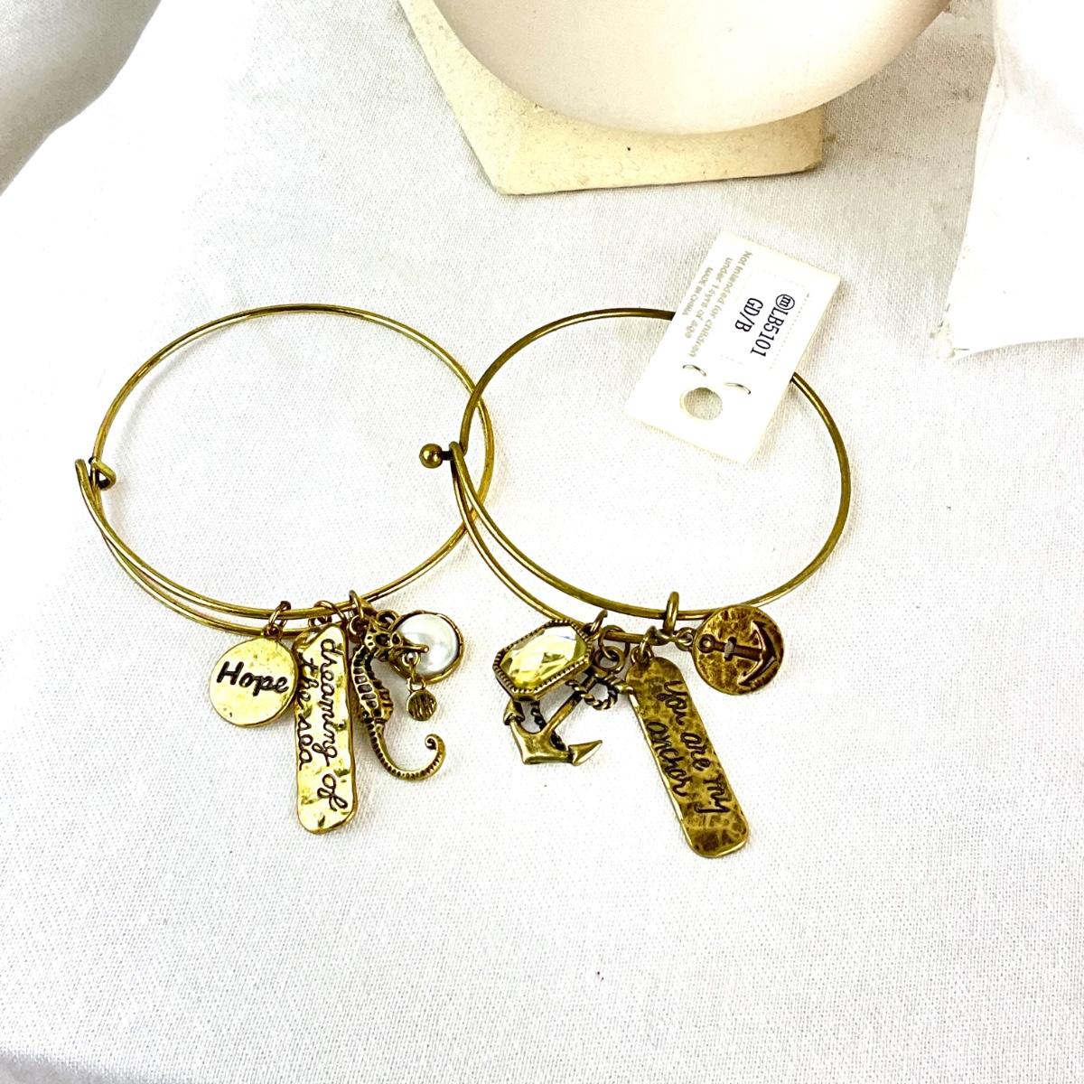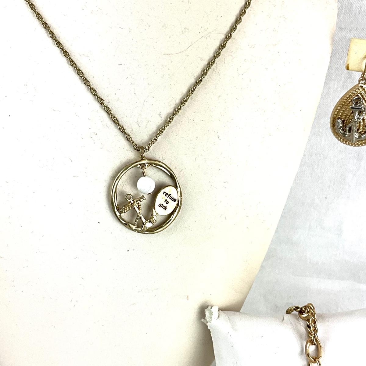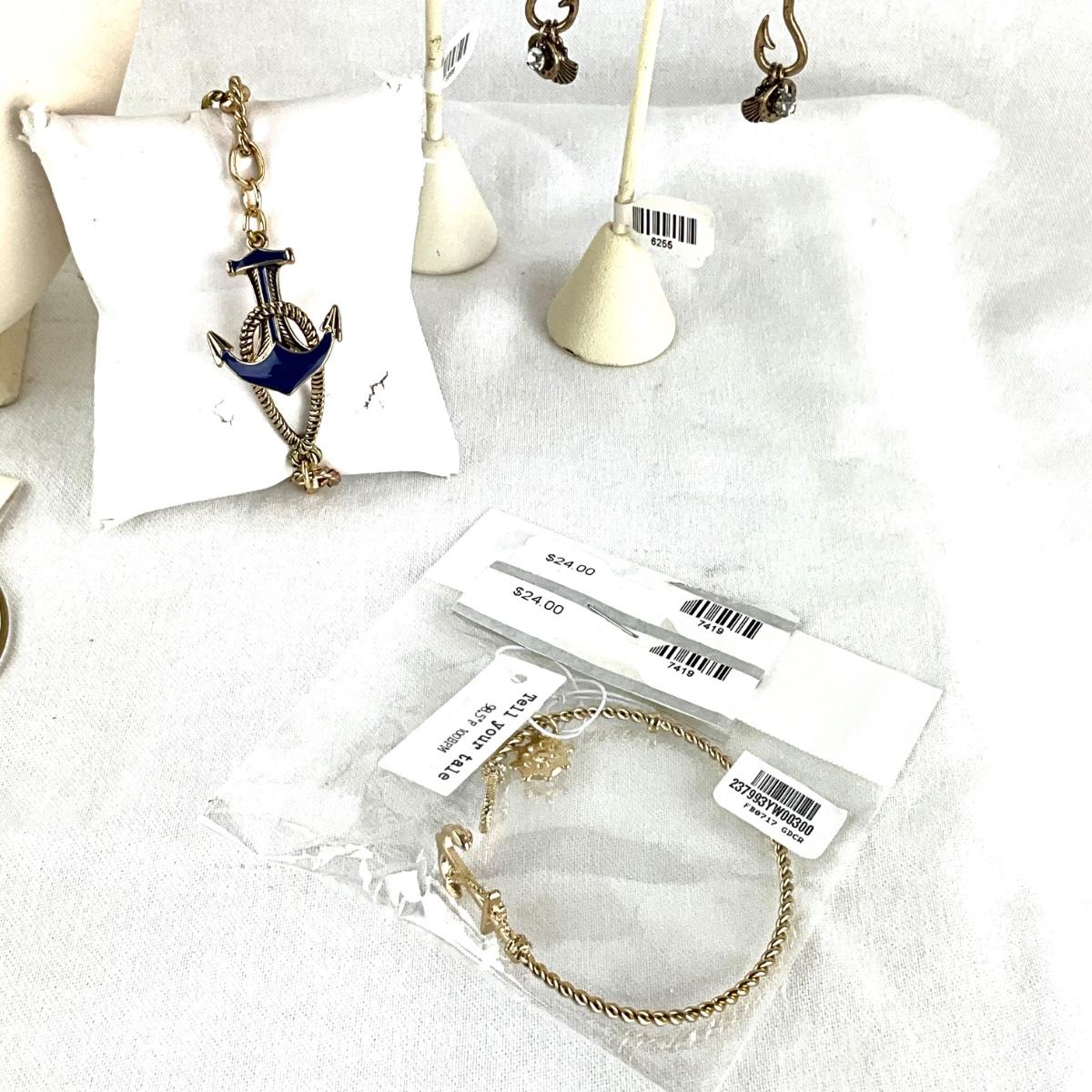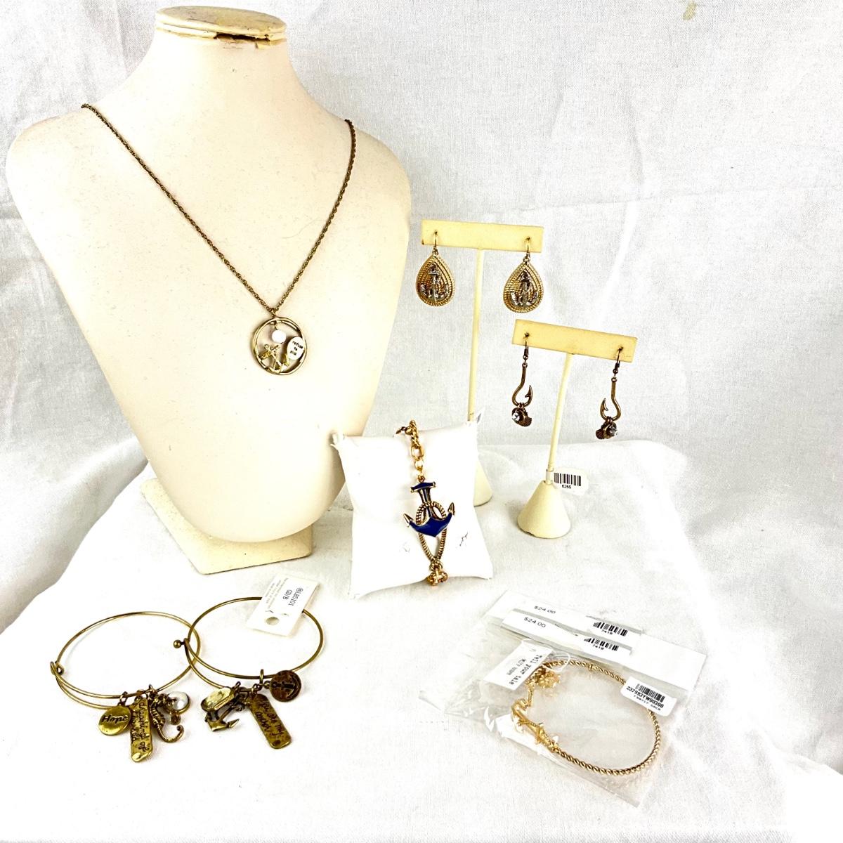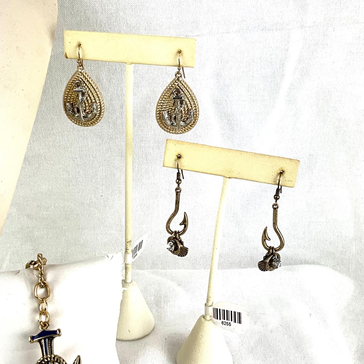 Gold tone refuse to sink necklace with anchor two toned earrings, fish hook earrings with two new in package anchor bracelet and two goldtone charm bangle bracelets