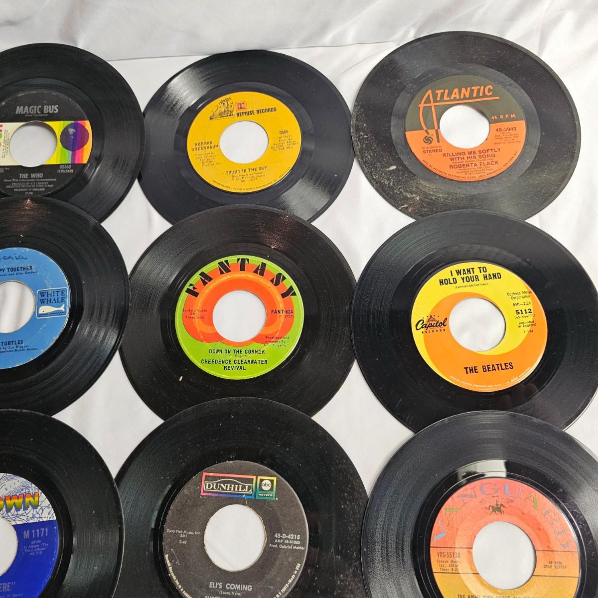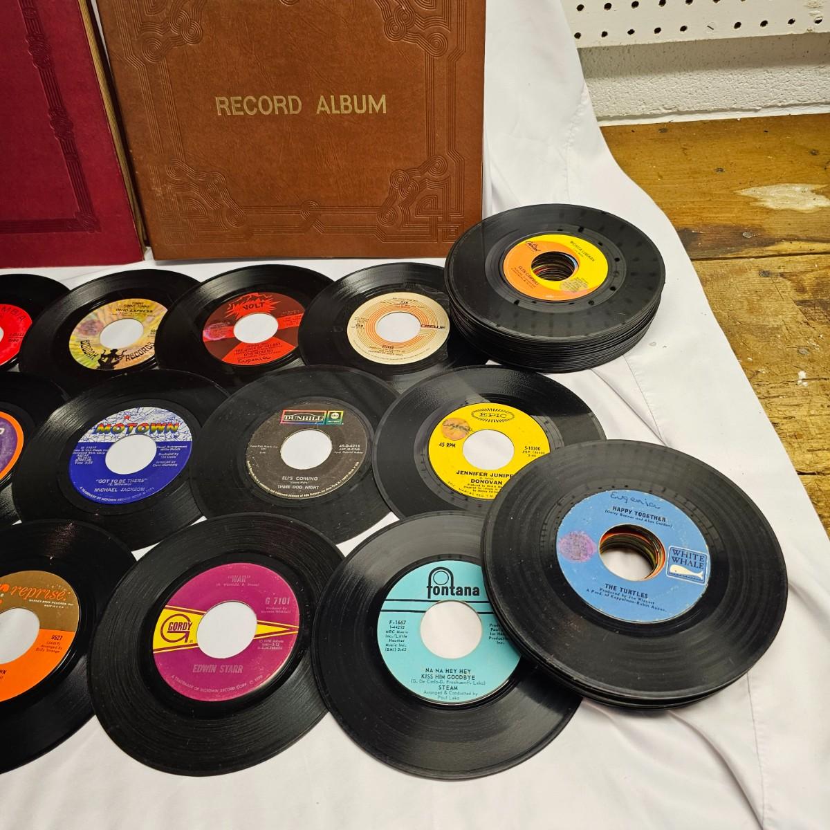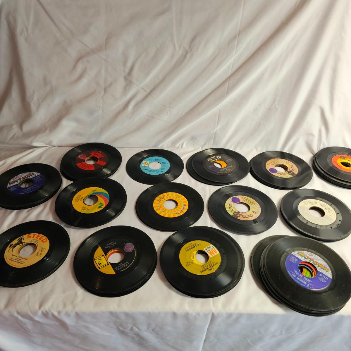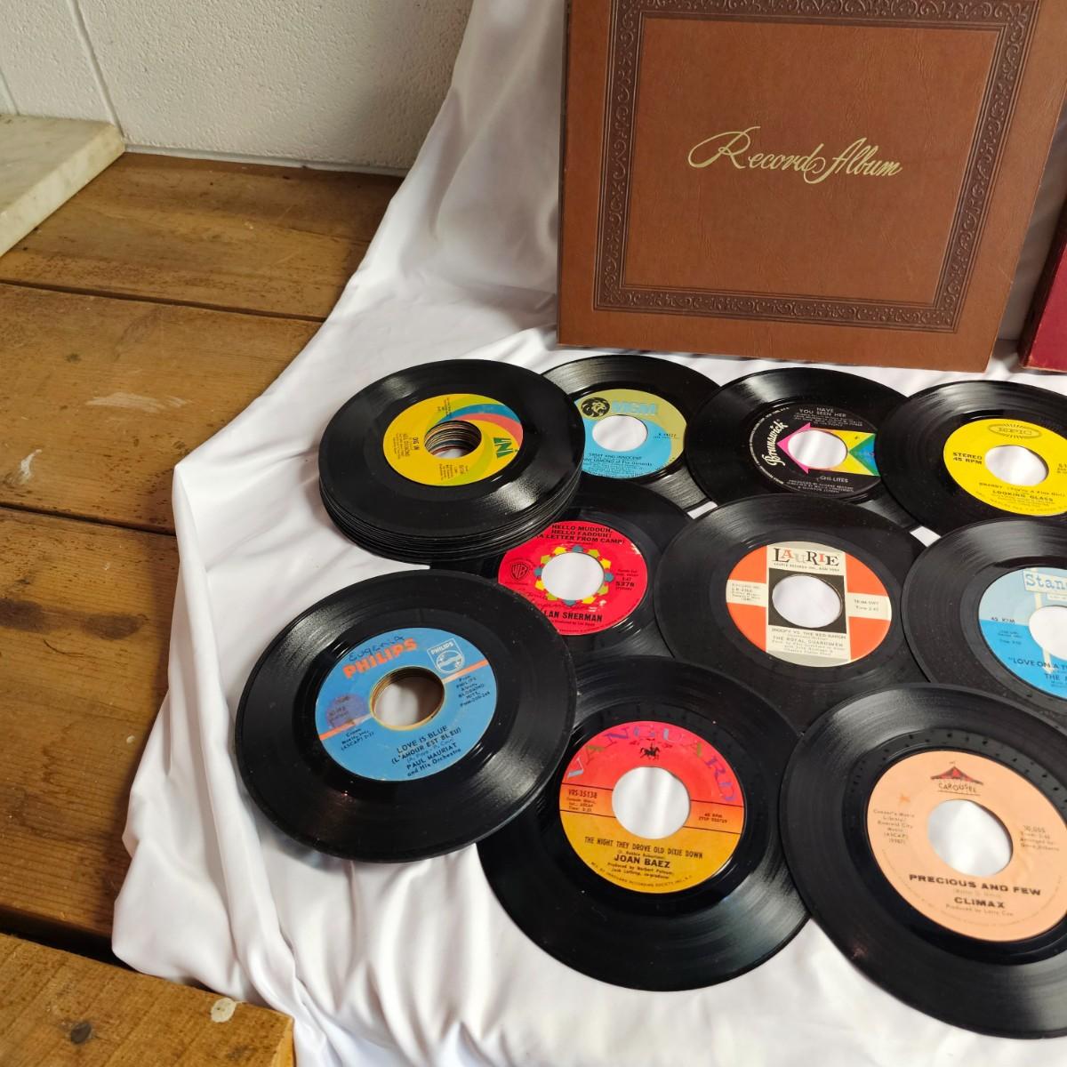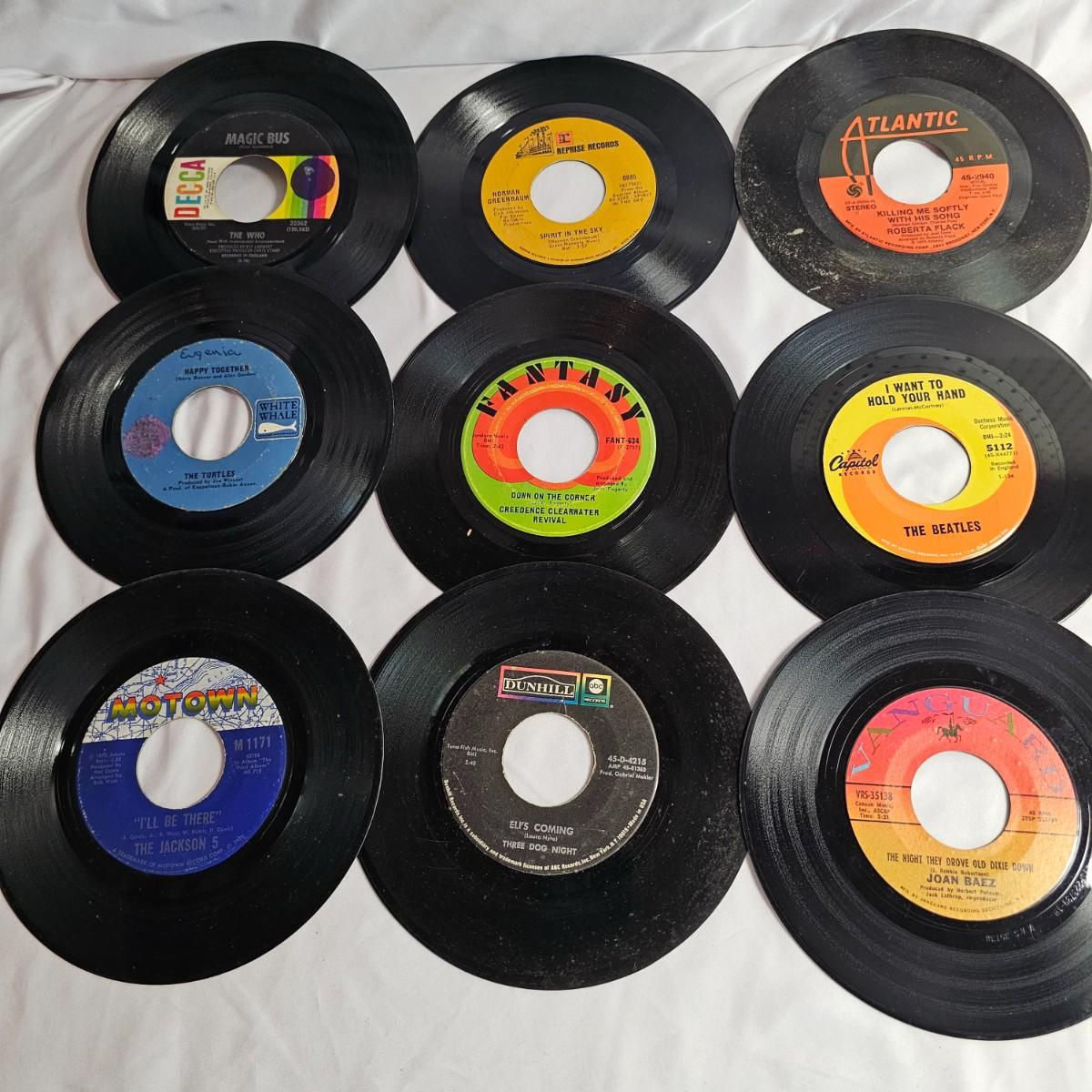 10" and 12" 78 rpm records in album holders. Eight of the 12" and 12 of the 8" discs. Also includes one extra album case. Perry Como, Fats Domino, Dean Martin, others. Also over seventy-five 45 rpm records from the 60's, 70's and 80's. Beatles, The Who, Three Dog Night, CCR, Michael Jackson, more. Too many to list all but a great selection. See photos for details. Shipping available.