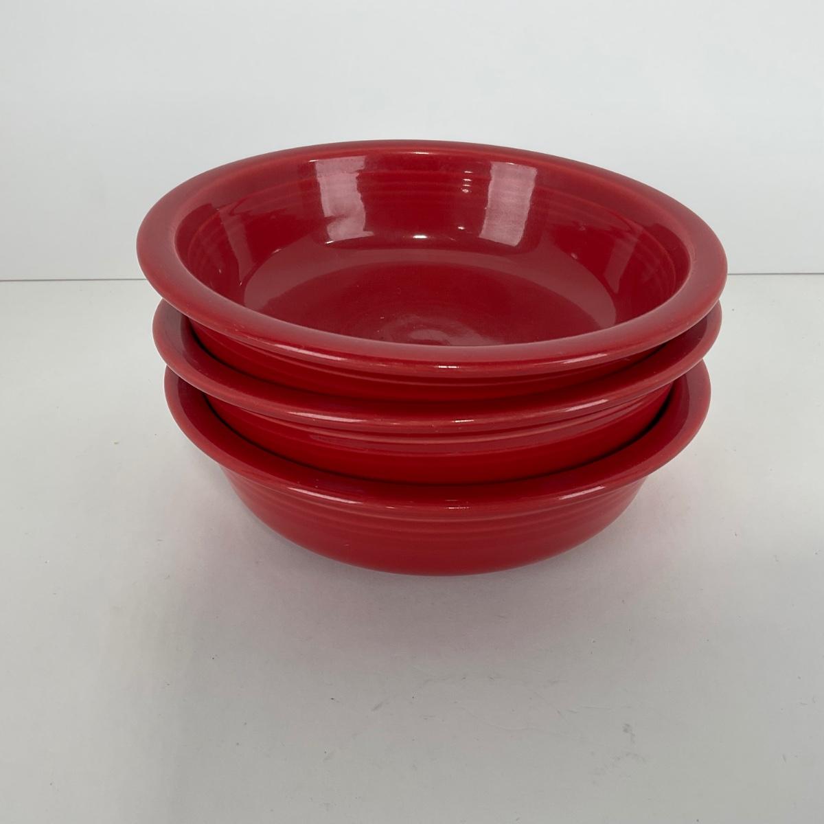 Three Fiesta Homer Laughlin red bowls in worn condition. Please see photos for details and condition. ::: Shipping is available on this lot. If you require shipping you must let us know at the close of the auction. We will coordinate with you after the item has been won. Shipping fees will include insurance up to or exceeding the value of all items being mailed. If you have any questions regarding this lot please contact the auctioneer either via this website, by direct email or by phone. PICK UP TIMES and other important information can be found in the TERMS and DESCRIPTION of the auction. Please take a look for pertinent information. Thanks!