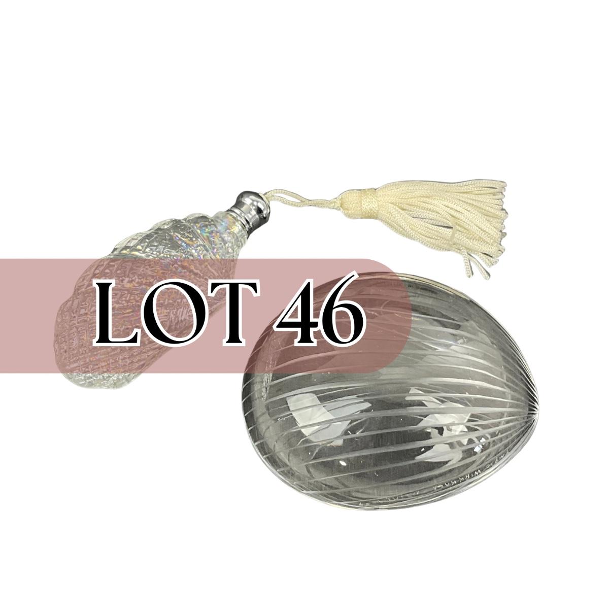 Two pieces including one artist signed sterling clear glass shell. And one iridescent shell perfume bottle. Please see photos for details and condition. Any condition statement is given as a courtesy to a client, is an opinion, and should not be treated as a statement of fact. Reference to condition written, oral or within a condition report shall not be regarded as a full account of condition and may not include all defects, alterations, or restorations. Absence of a condition report does not imply a lot is flawless or lacking imperfections or damage. Katherine’s Auction & Appraisal Service shall have no responsibility for any error or omission. Returns shall not be accepted on the basis of condition. ::: Shipping is available on this lot. If you require shipping you must let us know at the close of the auction. We will coordinate with you after the item has been won. Shipping fees will include insurance up to or exceeding the value of all items being mailed. If you have any questions regarding this lot please contact the auctioneer either via this website, by direct email or by phone. PICK UP TIMES and other important information can be found in the TERMS and DESCRIPTION of the auction. Please take a look for pertinent information. Thanks!