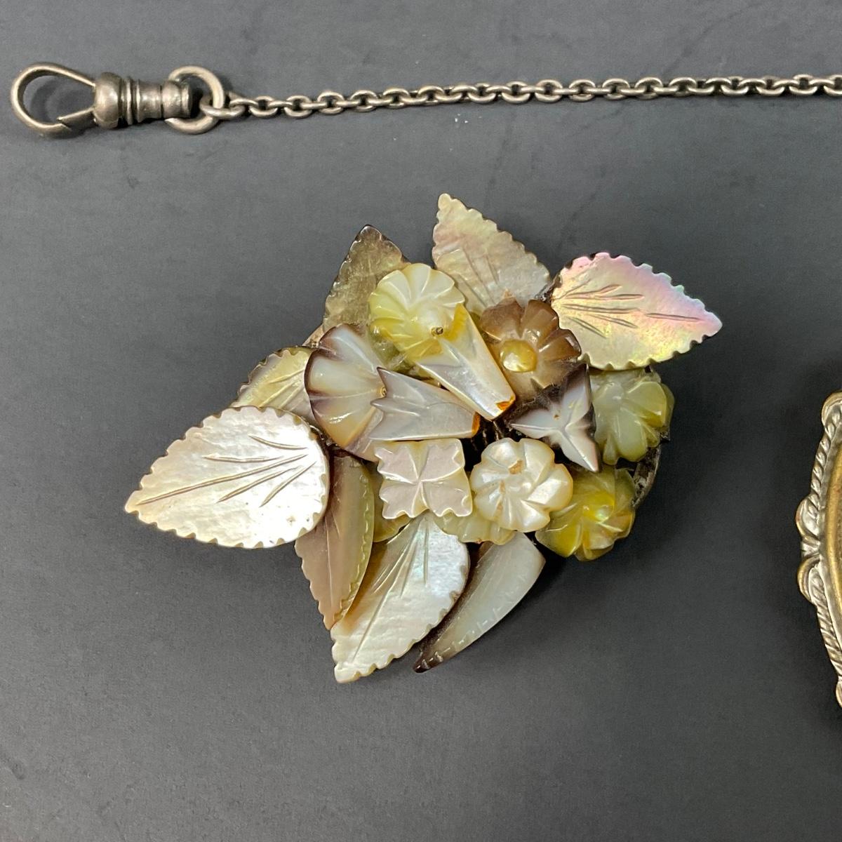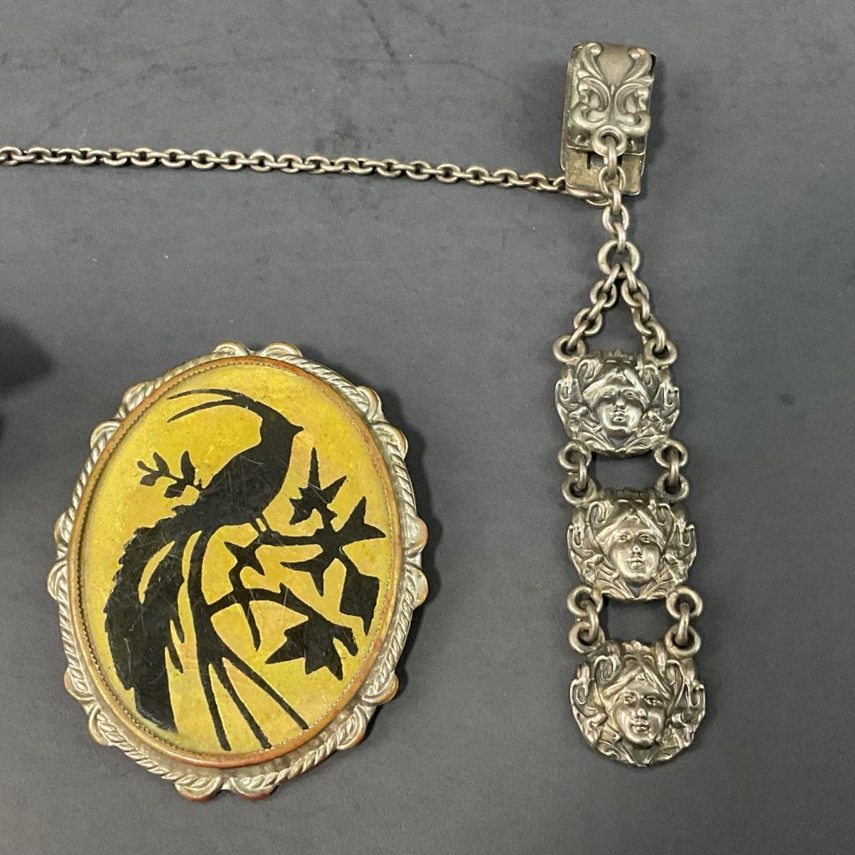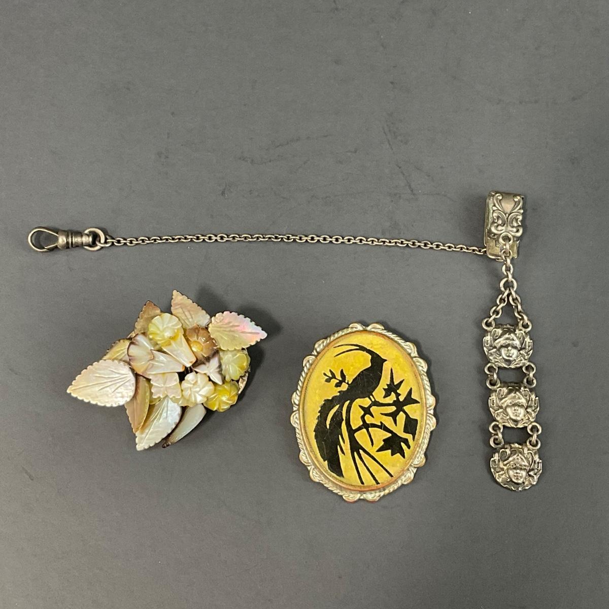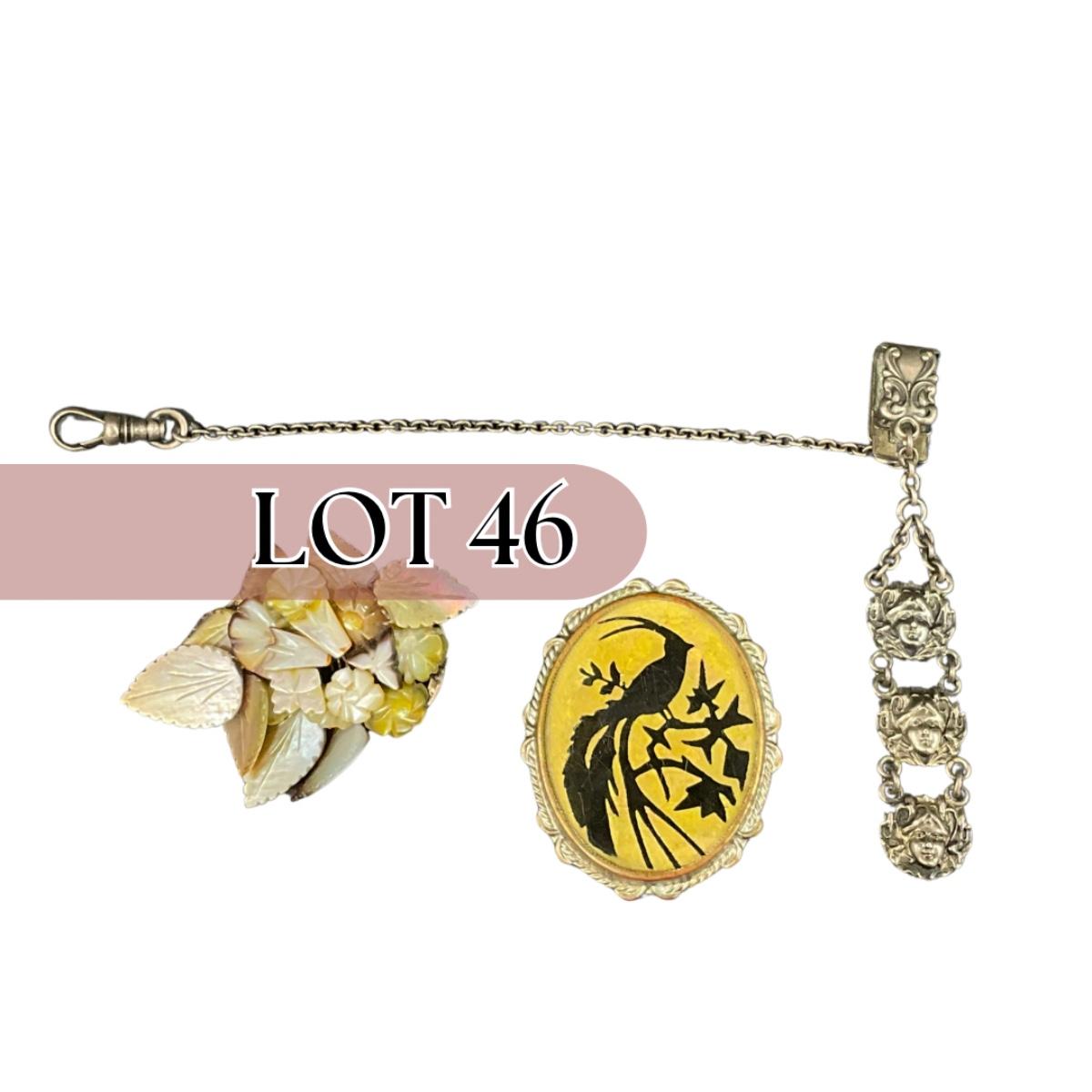 Three Victorian pieces including one mother of pearl sterling brooch, one antique silhouette brooch, and one watch clip. This piece does have some scuffs, scratches, marks, or slight damage, but otherwise appears to be in great shape. Please see photos for details and condition. Any condition statement is given as a courtesy to a client, is an opinion, and should not be treated as a statement of fact. Reference to condition written, oral or within a condition report shall not be regarded as a full account of condition and may not include all defects, alterations, or restorations. Absence of a condition report does not imply a lot is flawless or lacking imperfections or damage. Katherine’s Auction & Appraisal Service shall have no responsibility for any error or omission. Returns shall not be accepted on the basis of condition. ::: Shipping is available on this lot. If you require shipping you must let us know at the close of the auction. We will coordinate with you after the item has been won. Shipping fees will include insurance up to or exceeding the value of all items being mailed. If you have any questions regarding this lot please contact the auctioneer either via this website, by direct email or by phone. PICK UP TIMES and other important information can be found in the TERMS and DESCRIPTION of the auction. Please take a look for pertinent information. Thanks!
