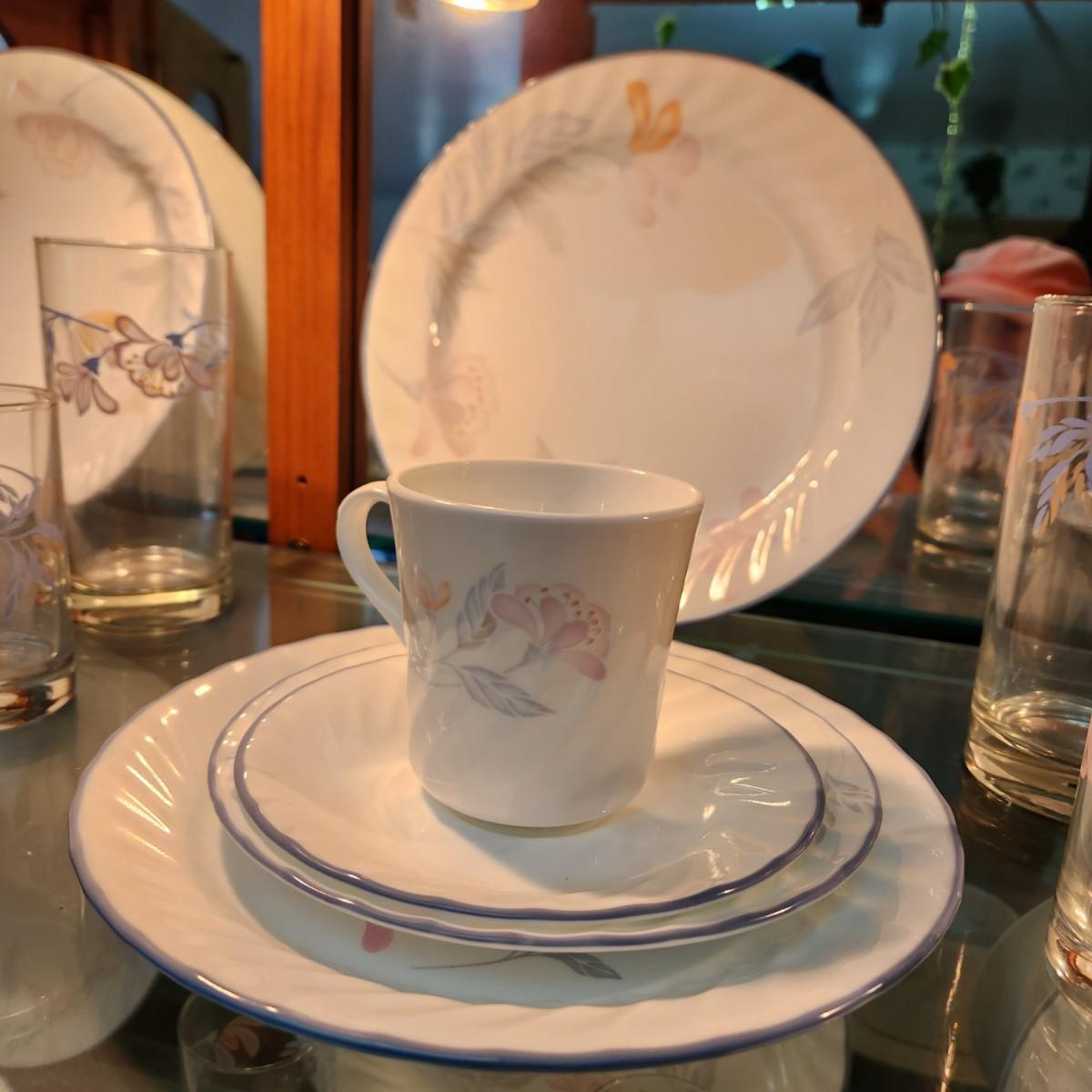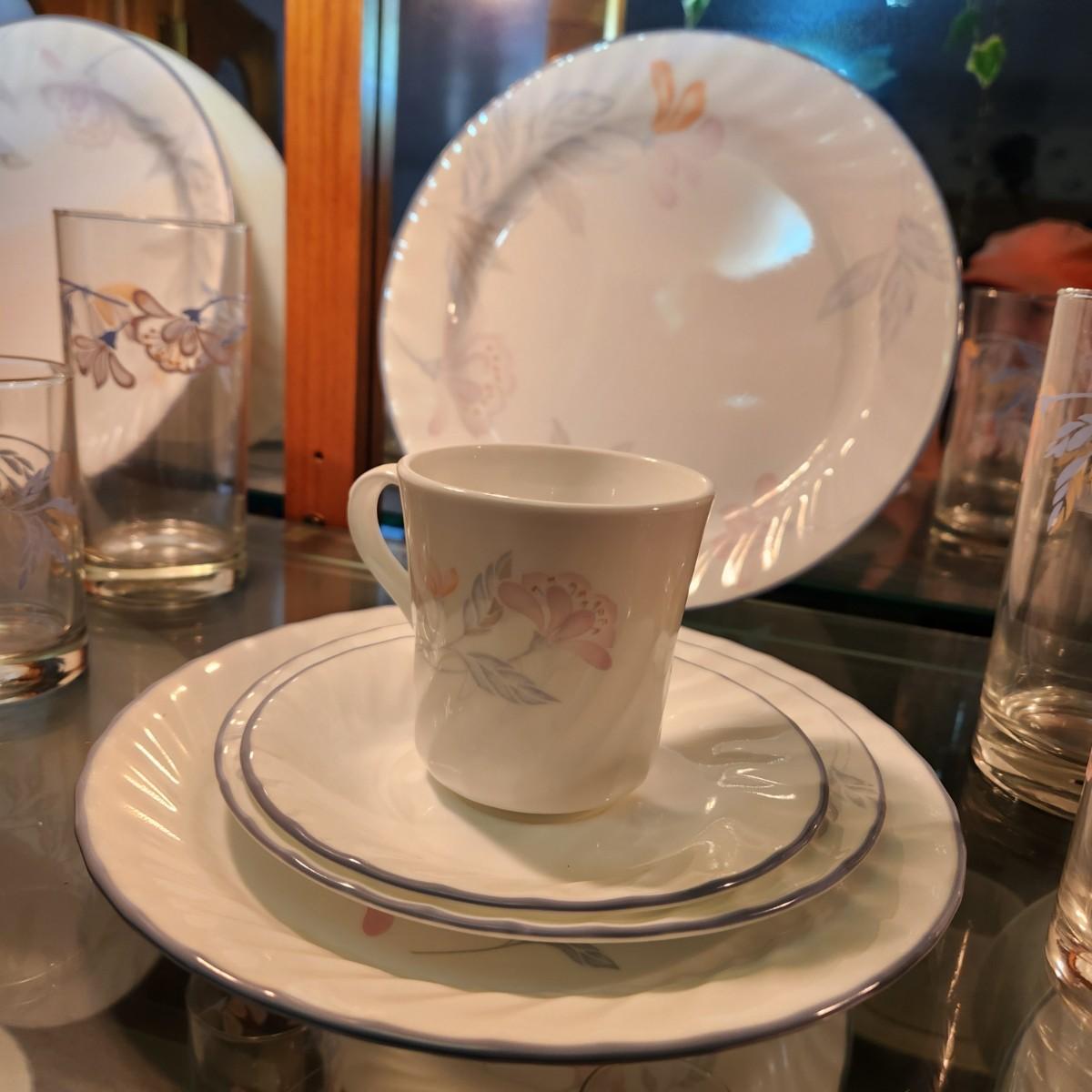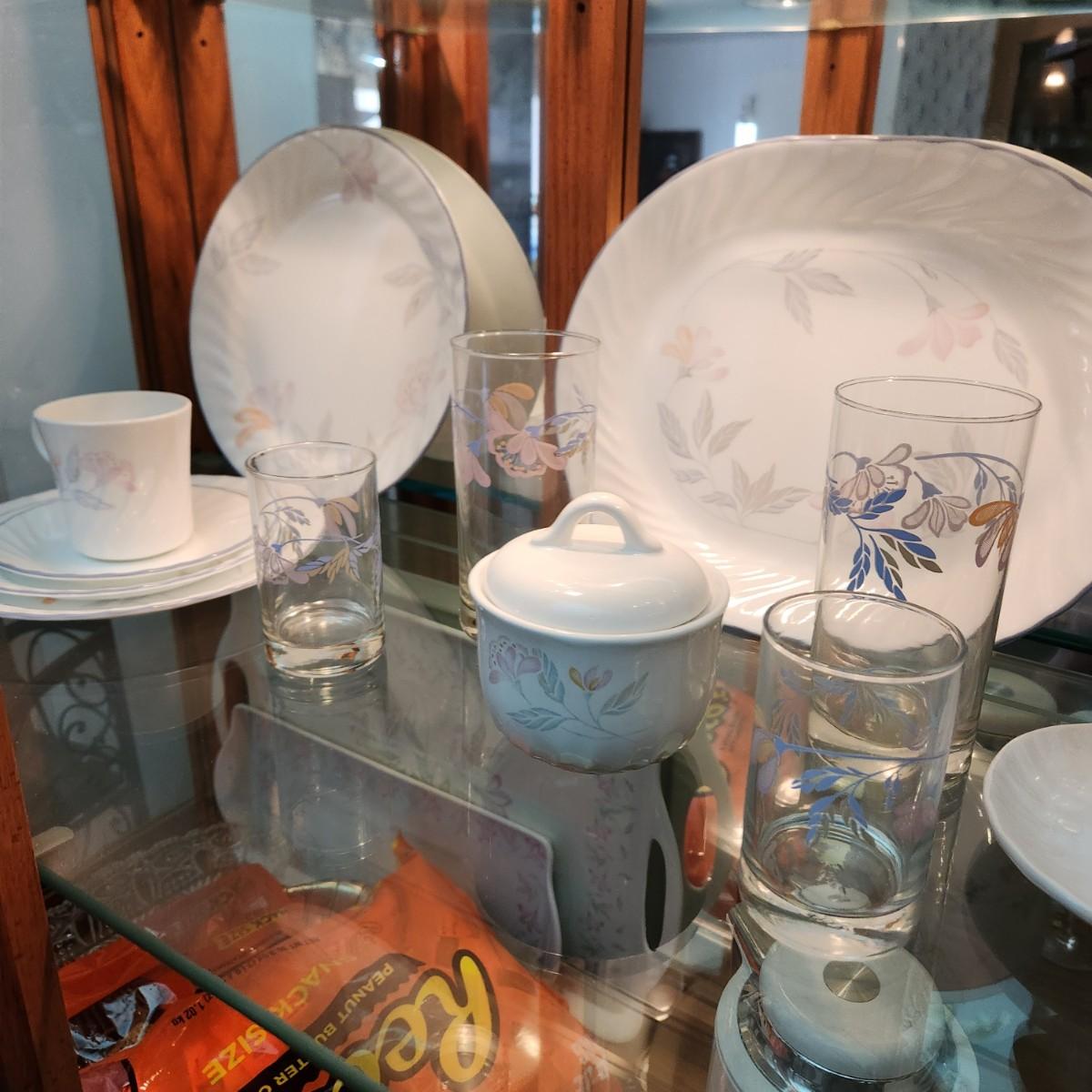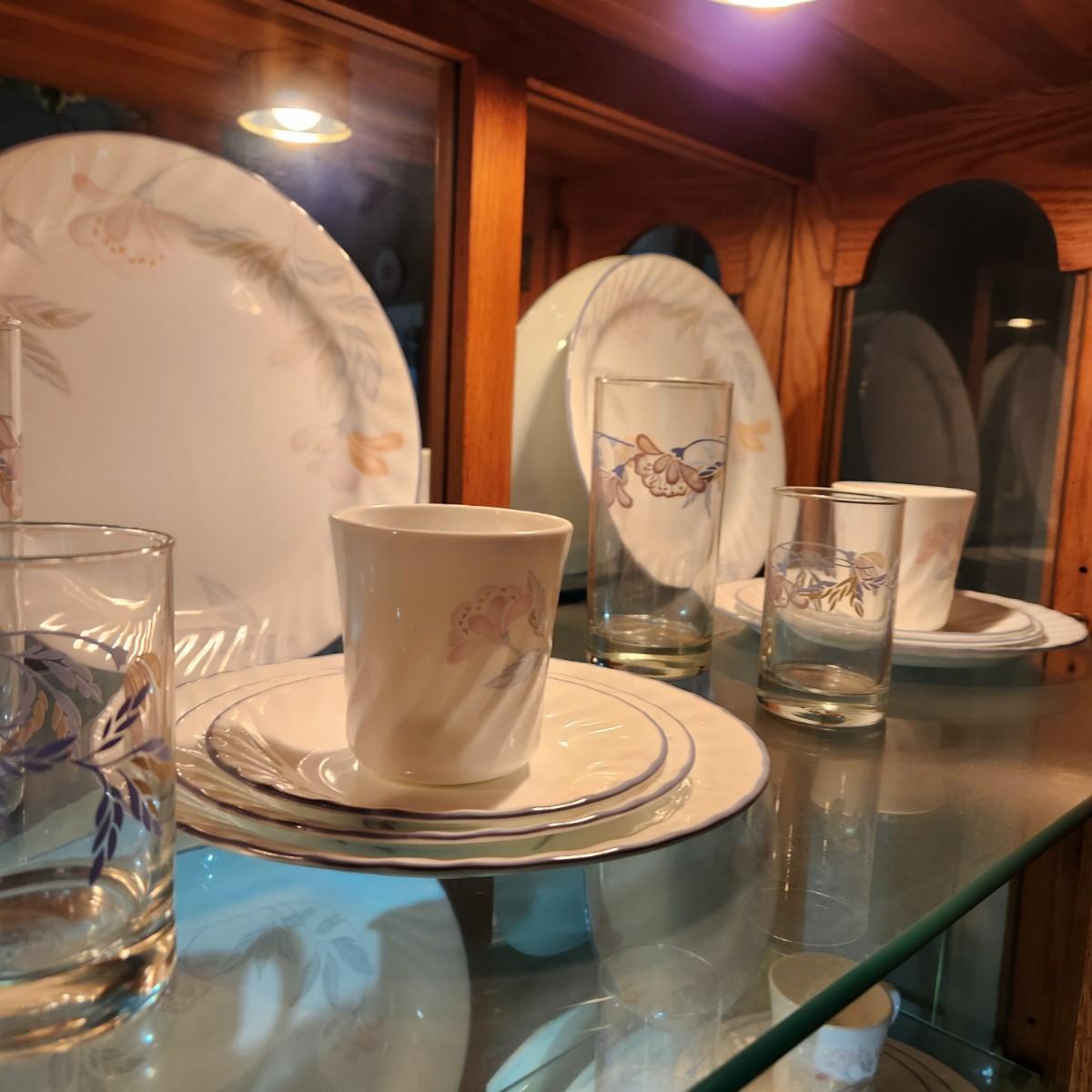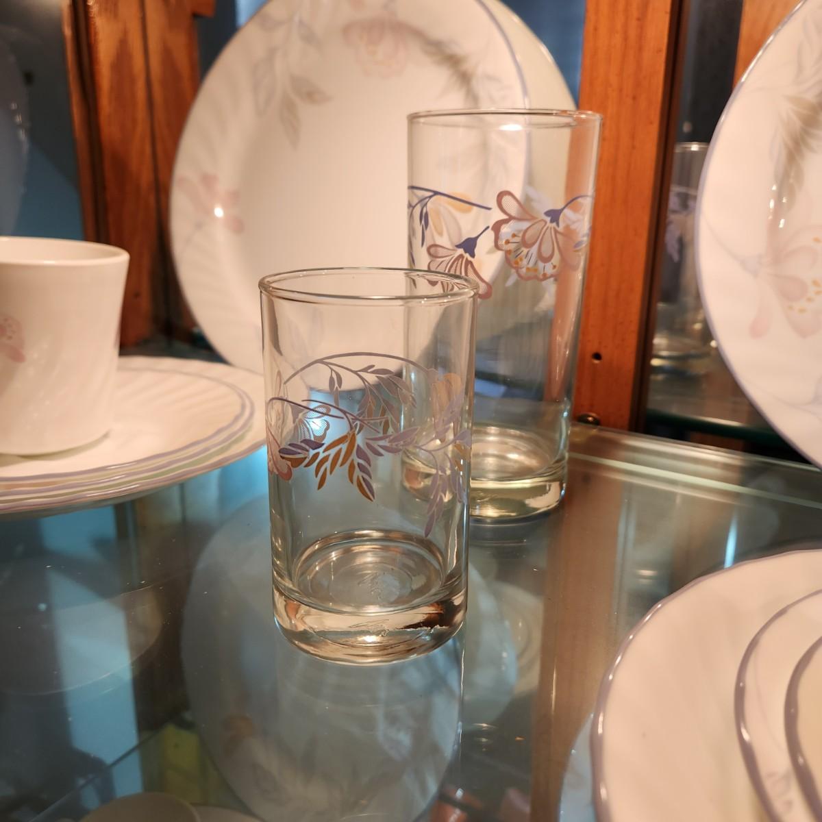 46 pcs Corelle by Corning Pink Trio 5 pc Setting for 6 + Matching Glasses