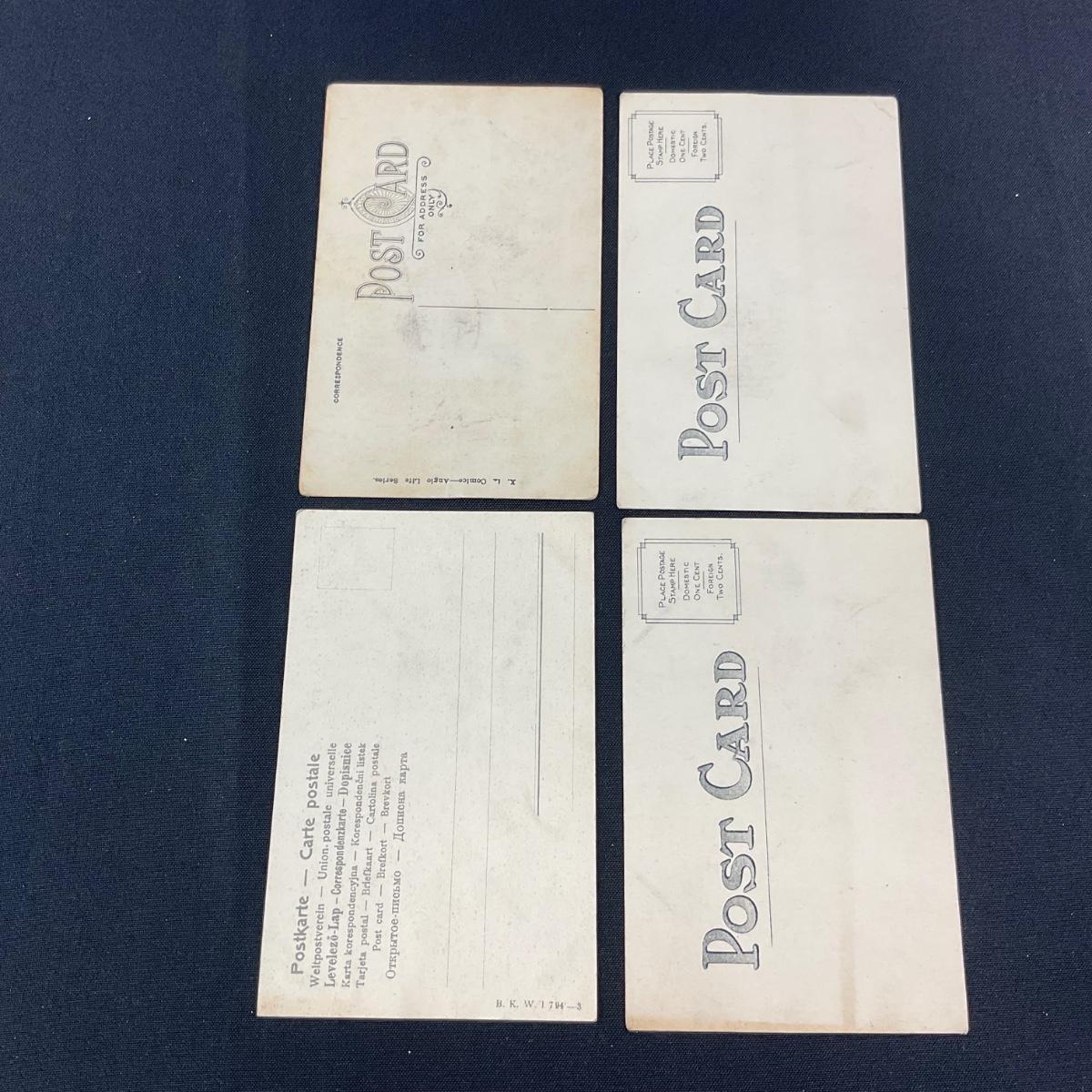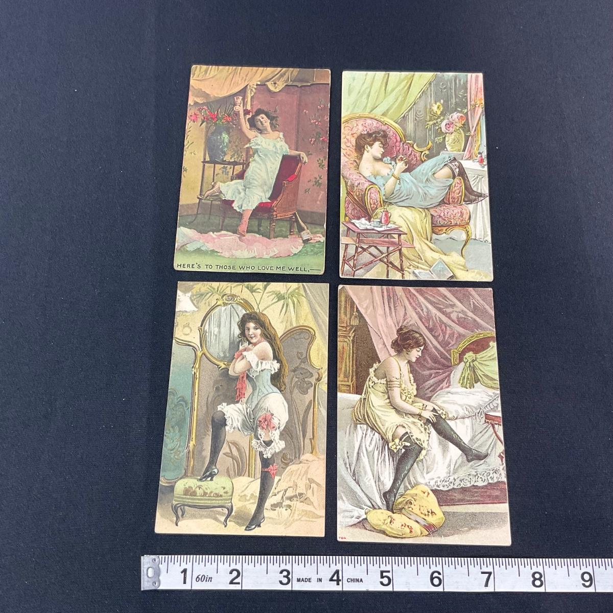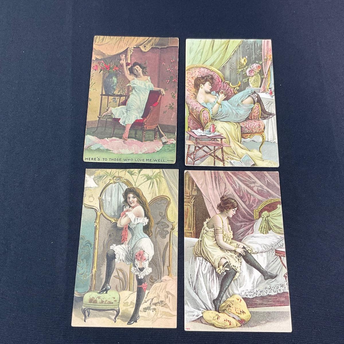 Four vintage risqué boudoir style vintage postcards. Please see photos for details and condition. Any condition statement is given as a courtesy to a client, is an opinion, and should not be treated as a statement of fact. Reference to condition written, oral or within a condition report shall not be regarded as a full account of condition and may not include all defects, alterations, or restorations. Absence of a condition report does not imply a lot is flawless or lacking imperfections or damage. Katherine’s Auction & Appraisal Service shall have no responsibility for any error or omission. Returns shall not be accepted on the basis of condition. ::: Shipping is available on this lot. If you require shipping you must let us know at the close of the auction. We will coordinate with you after the item has been won. Shipping fees will include insurance up to or exceeding the value of all items being mailed. If you have any questions regarding this lot please contact the auctioneer either via this website, by direct email or by phone. PICK UP TIMES and other important information can be found in the TERMS and DESCRIPTION of the auction. Please take a look for pertinent information. Thanks!