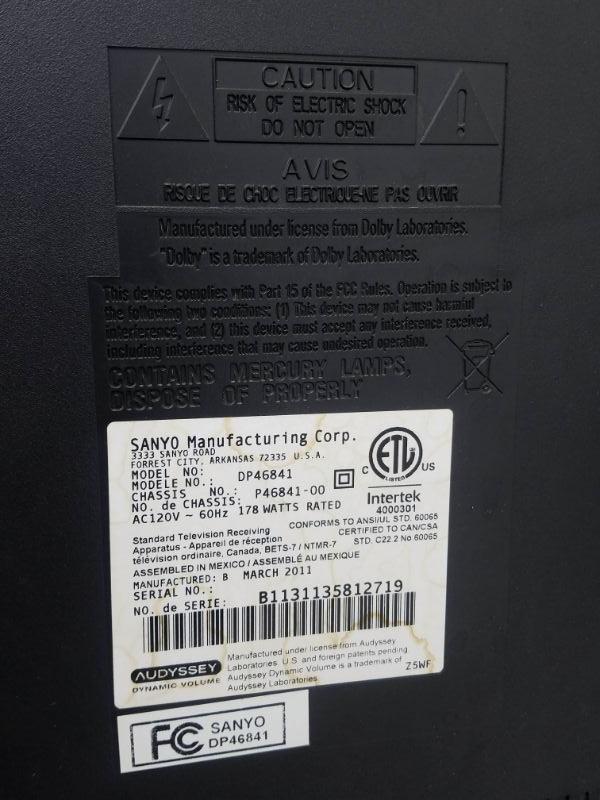 46" Sanyo TV. No Remote. Will need a Base or Bracket Tested, Works