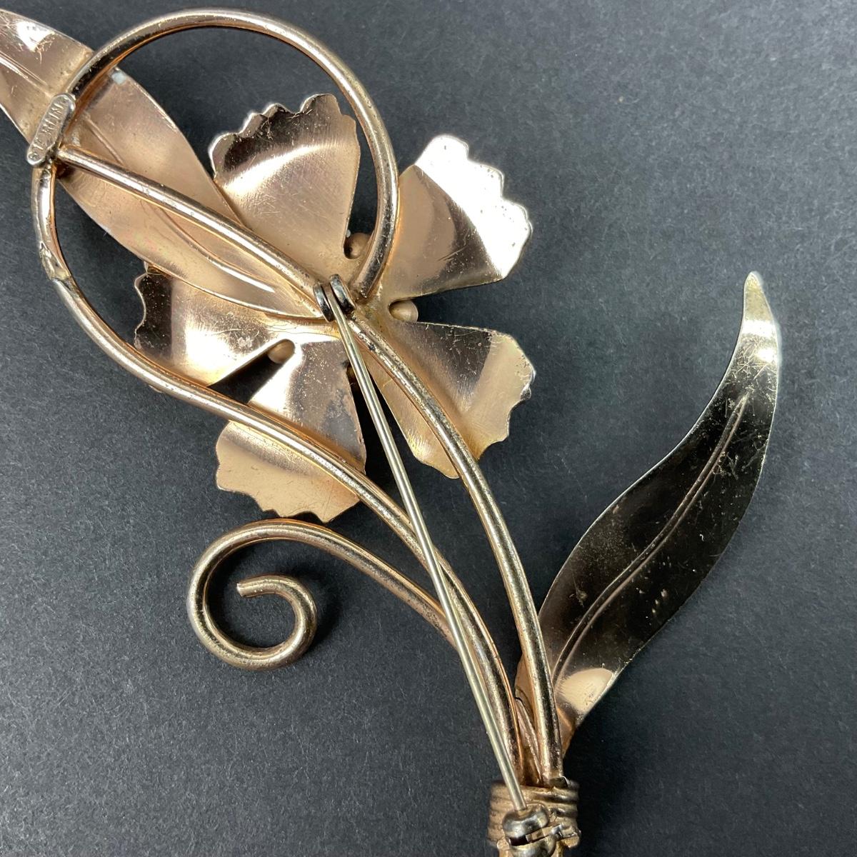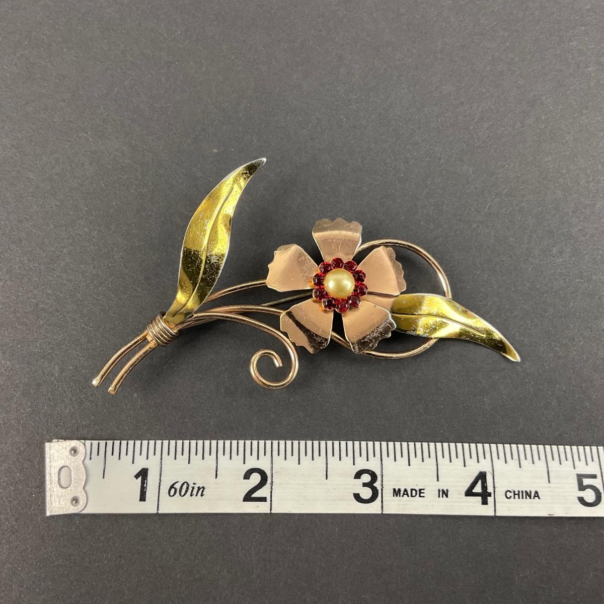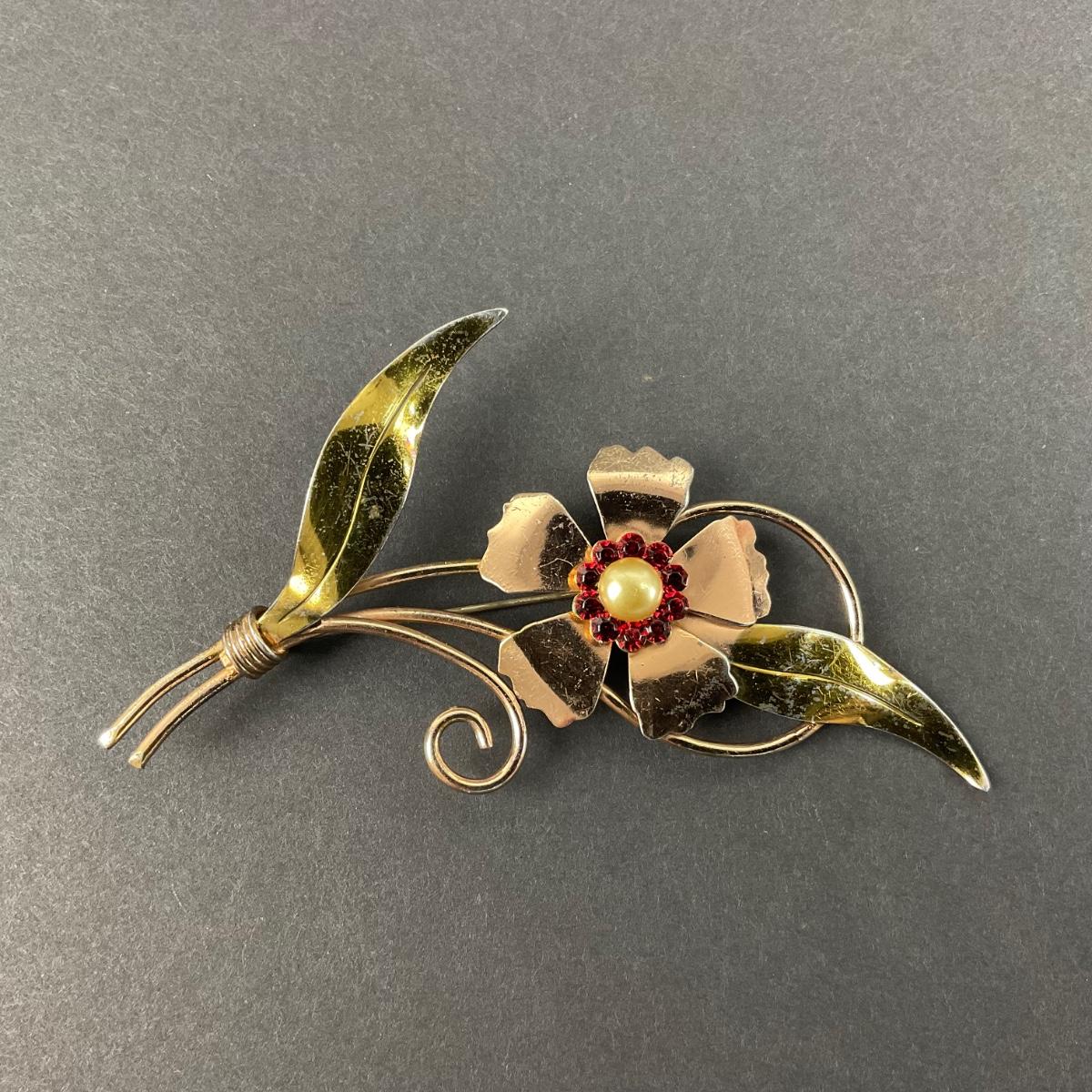 One mid century sterling marked gold washed sun flower brooch. Please see photos for details and condition. Any condition statement is given as a courtesy to a client, is an opinion, and should not be treated as a statement of fact. Reference to condition written, oral or within a condition report shall not be regarded as a full account of condition and may not include all defects, alterations, or restorations. Absence of a condition report does not imply a lot is flawless or lacking imperfections or damage. Katherine’s Auction & Appraisal Service shall have no responsibility for any error or omission. Returns shall not be accepted on the basis of condition. ::: Shipping is available on this lot. If you require shipping you must let us know at the close of the auction. We will coordinate with you after the item has been won. Shipping fees will include insurance up to or exceeding the value of all items being mailed. If you have any questions regarding this lot please contact the auctioneer either via this website, by direct email or by phone. PICK UP TIMES and other important information can be found in the TERMS and DESCRIPTION of the auction. Please take a look for pertinent information. Thanks!