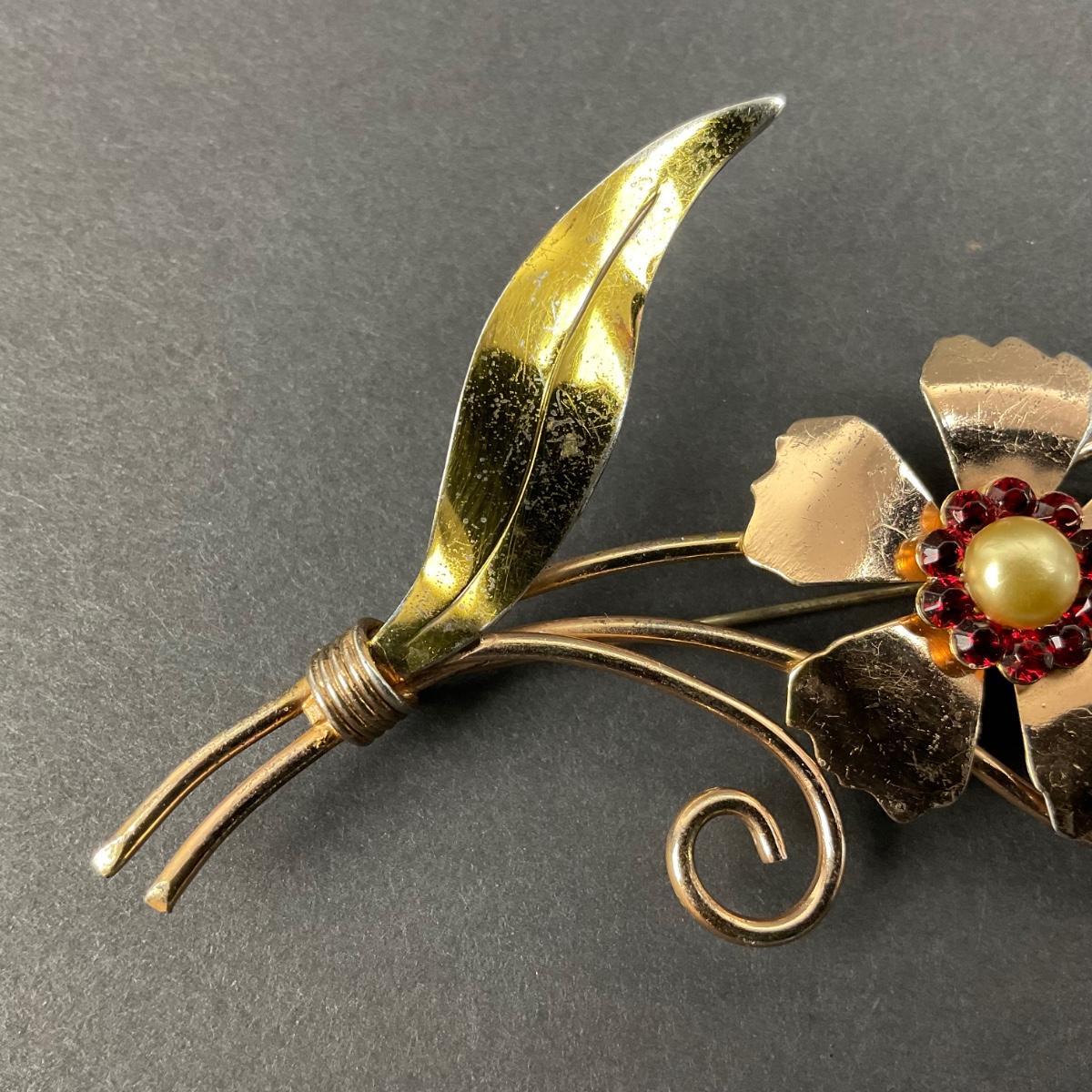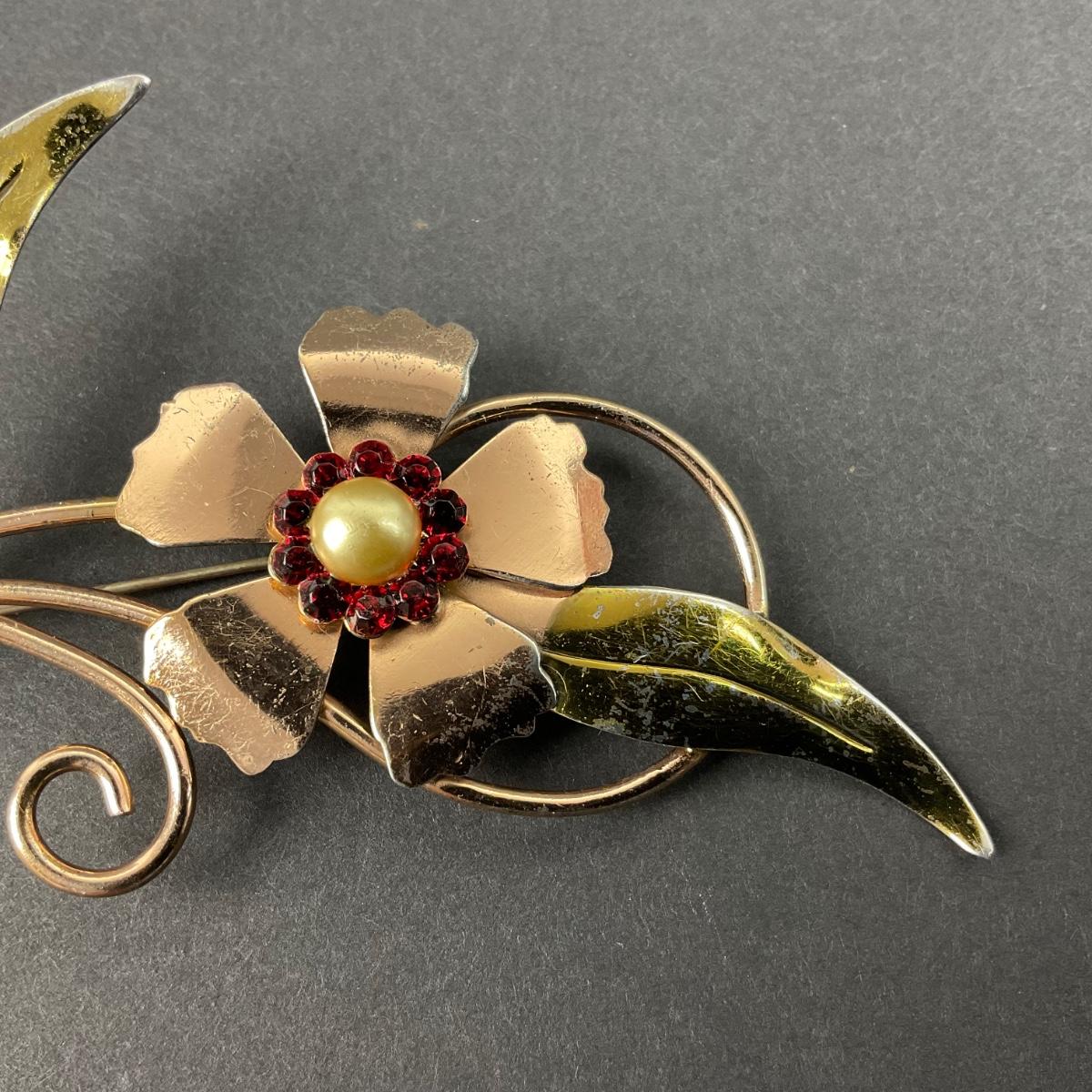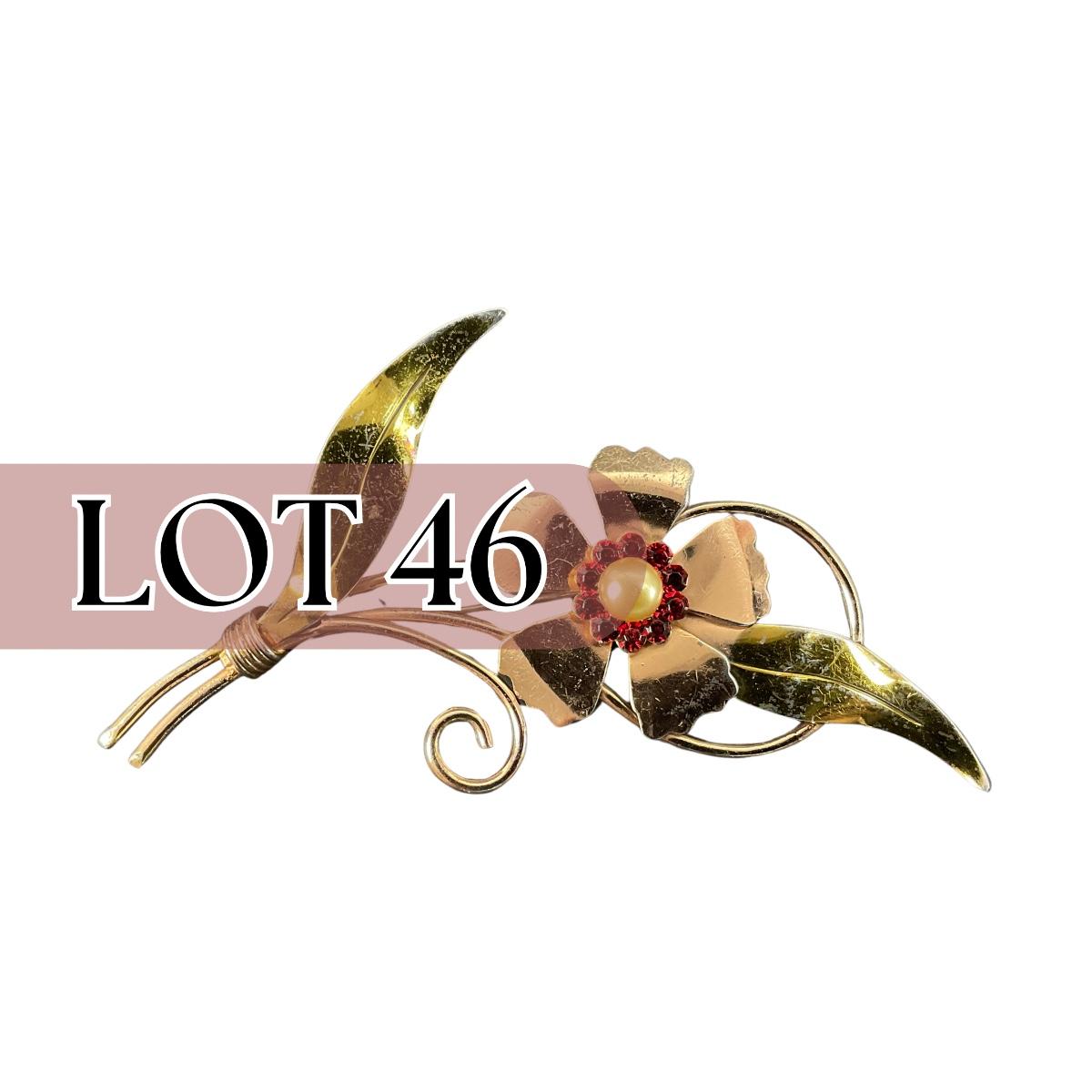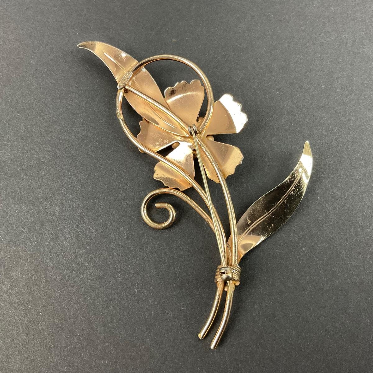 One mid century sterling marked gold washed sun flower brooch. Please see photos for details and condition. Any condition statement is given as a courtesy to a client, is an opinion, and should not be treated as a statement of fact. Reference to condition written, oral or within a condition report shall not be regarded as a full account of condition and may not include all defects, alterations, or restorations. Absence of a condition report does not imply a lot is flawless or lacking imperfections or damage. Katherine’s Auction & Appraisal Service shall have no responsibility for any error or omission. Returns shall not be accepted on the basis of condition. ::: Shipping is available on this lot. If you require shipping you must let us know at the close of the auction. We will coordinate with you after the item has been won. Shipping fees will include insurance up to or exceeding the value of all items being mailed. If you have any questions regarding this lot please contact the auctioneer either via this website, by direct email or by phone. PICK UP TIMES and other important information can be found in the TERMS and DESCRIPTION of the auction. Please take a look for pertinent information. Thanks!