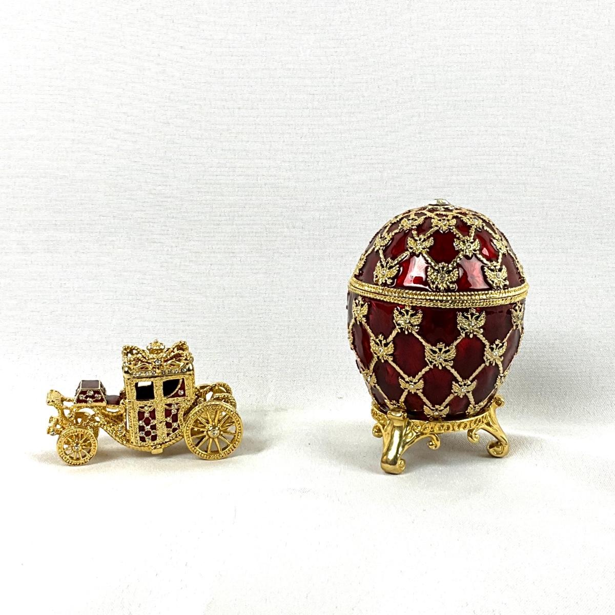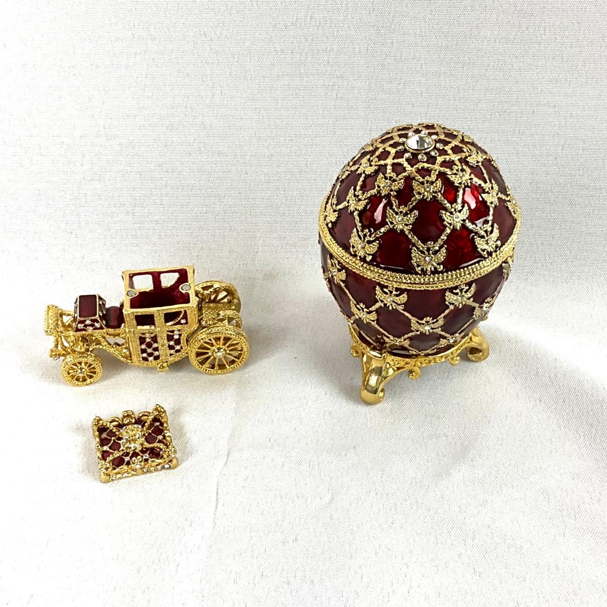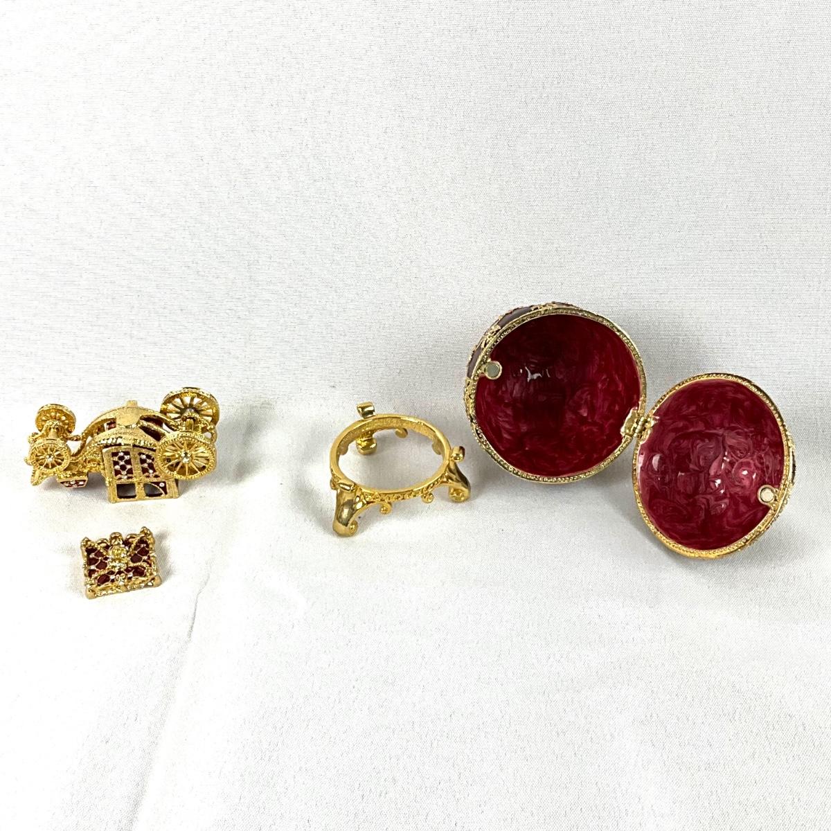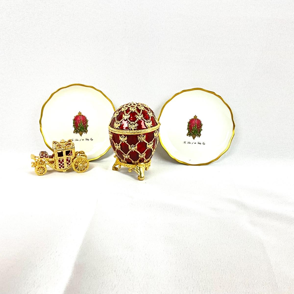 461 Vintage Faberge Style Enameled Egg with Coach Box, Faberge Plates, & Book