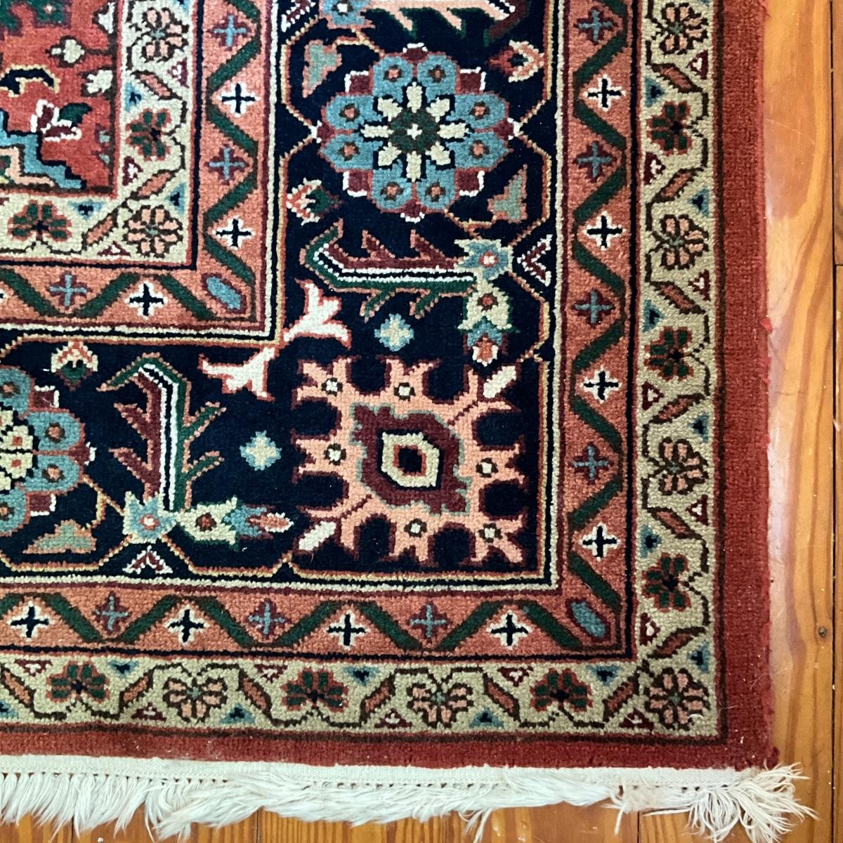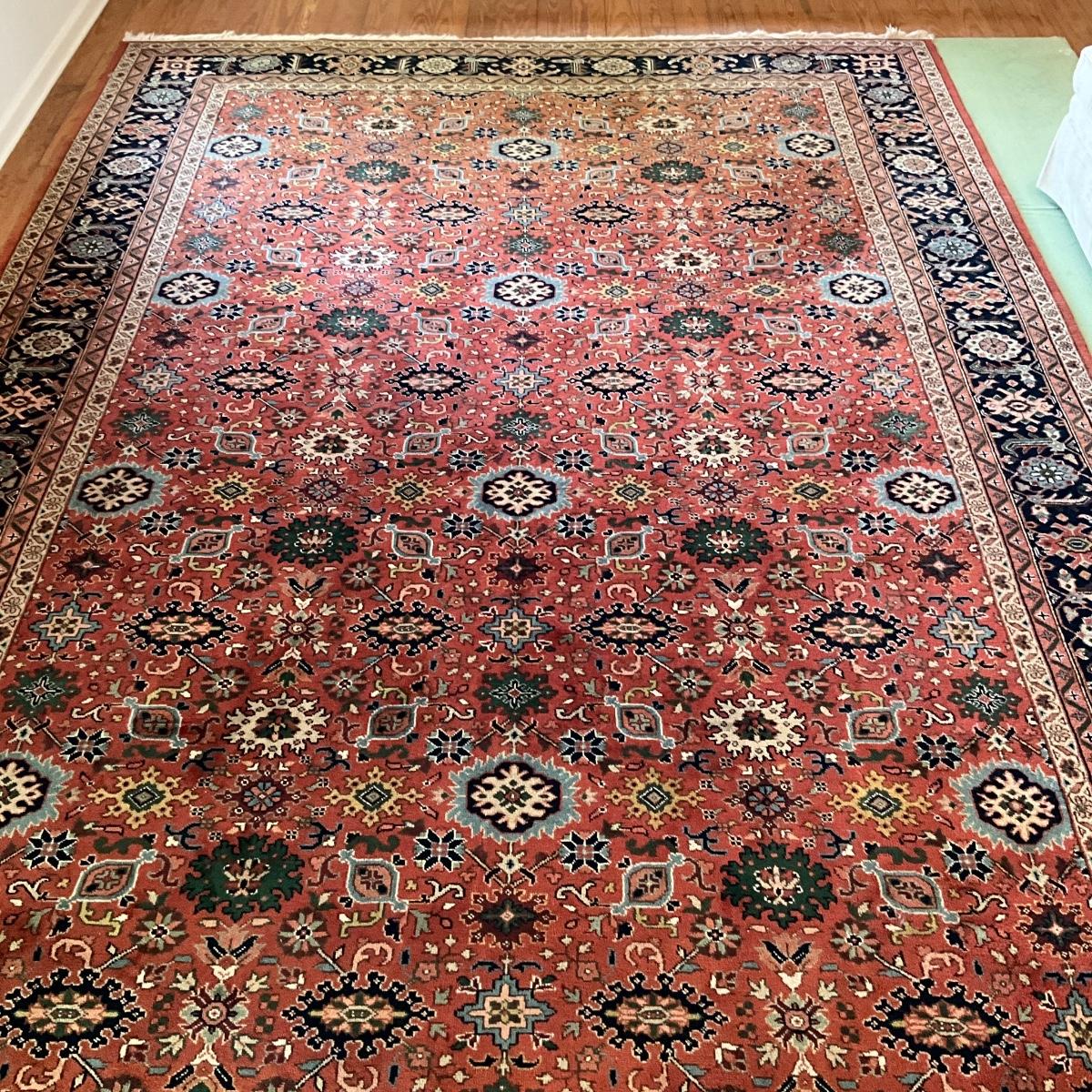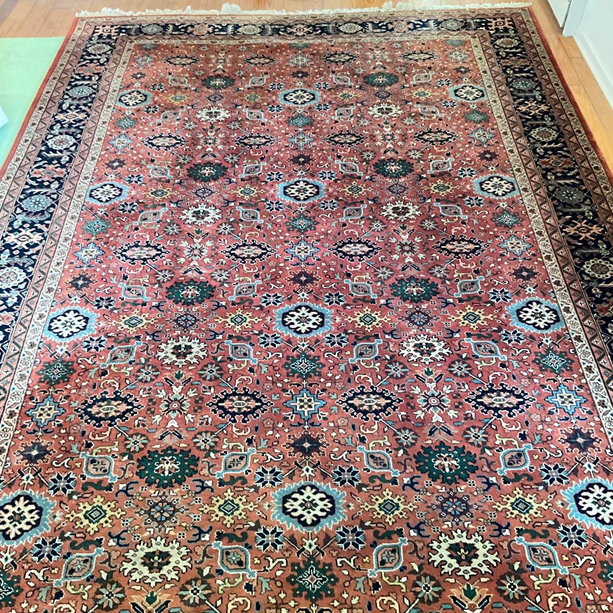 One end of the rug is sun faded. Rug is in over all good condition other than the one side of fading. Measures 14 feet long by 9'10" wide.