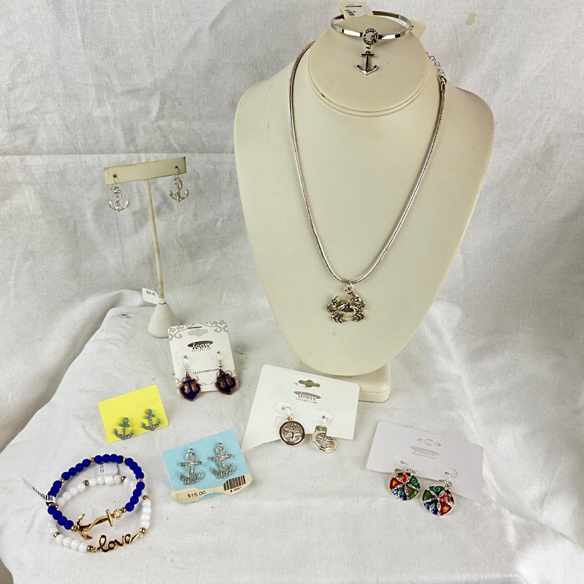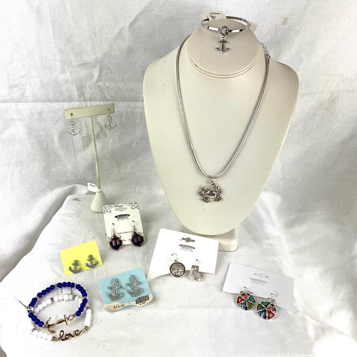 Crab necklace, anchor bangle bracelet with two stretch bracelets and six pairs of earrings