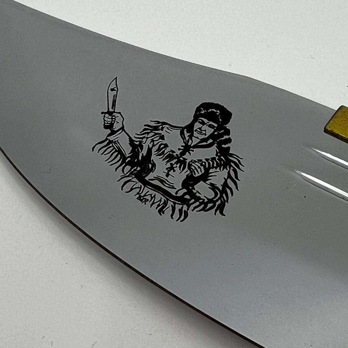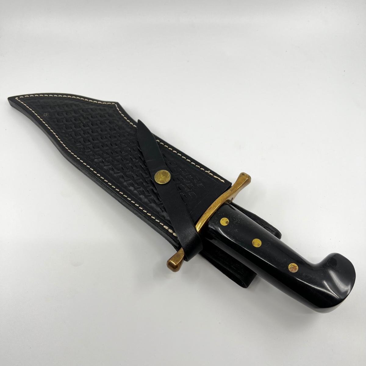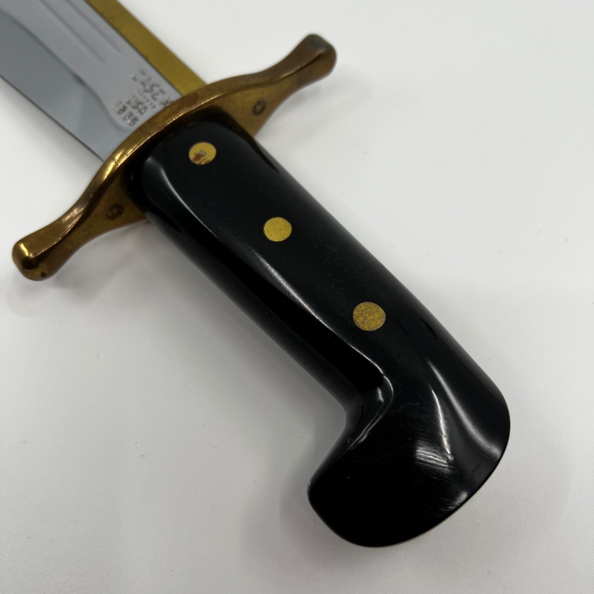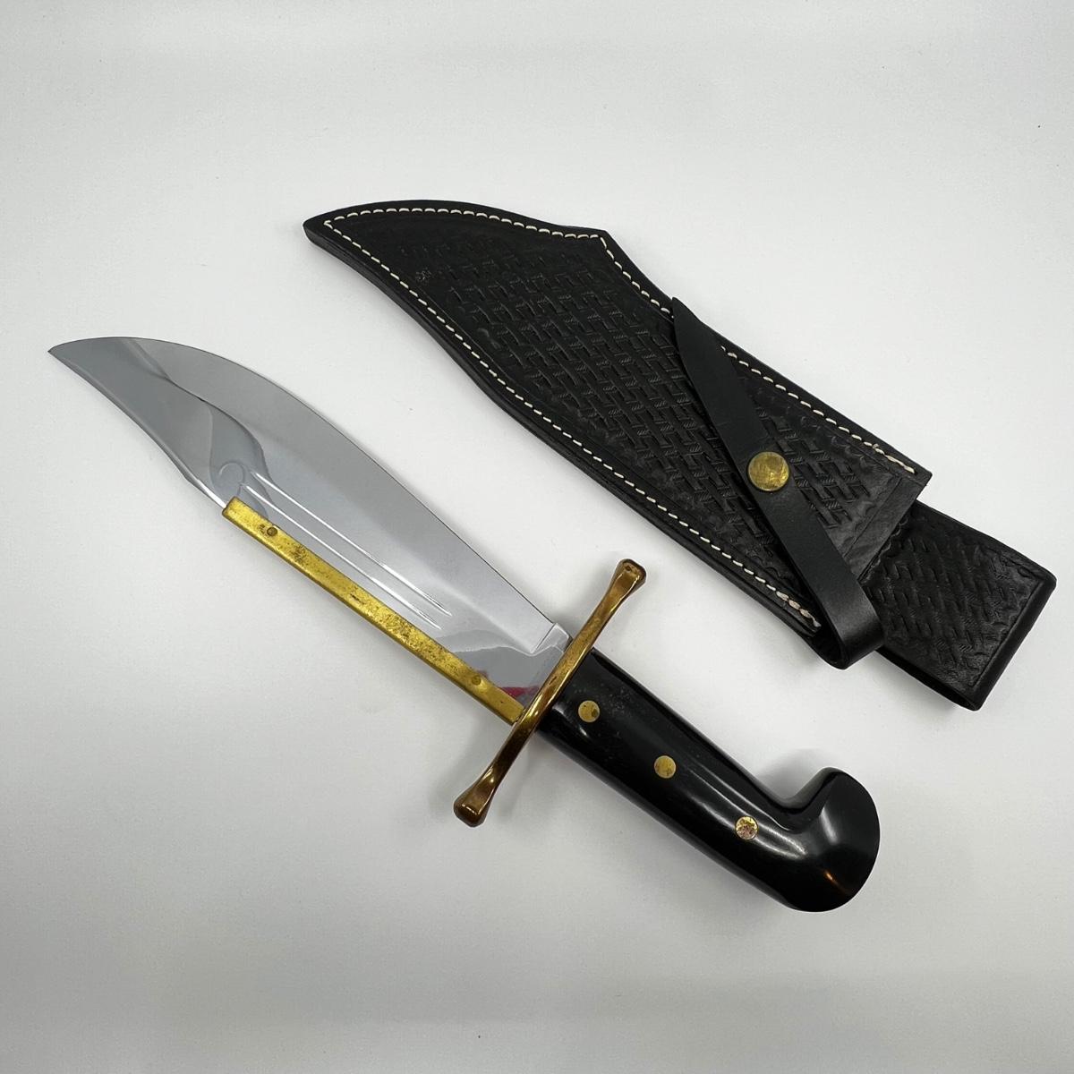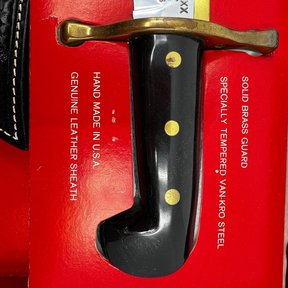 Serial #1836, solid brass guard, specially tempered van-kro steel, genuine leather sheath, and the original boxed. Never used.