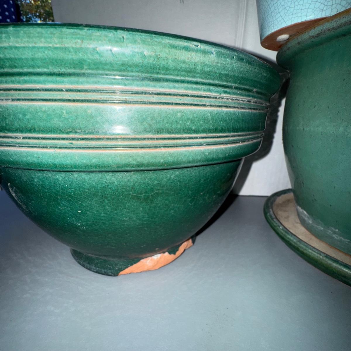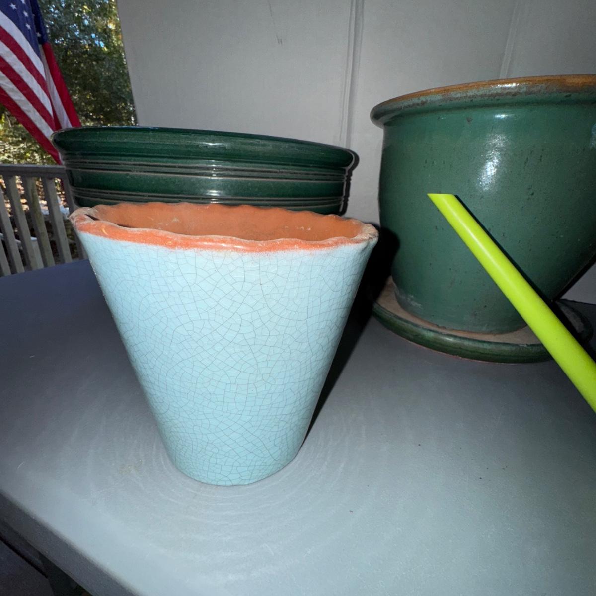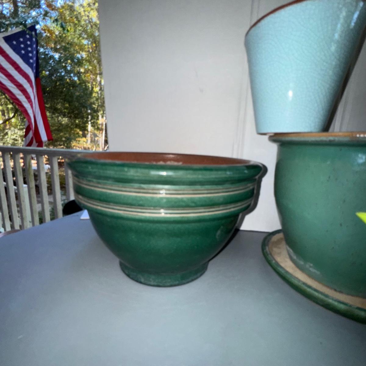 Green Planter LOT w/Italian Green Watering Can. Please see pics for details and sizes. NOTE: one green planter has a cup on the bottom as pictured.