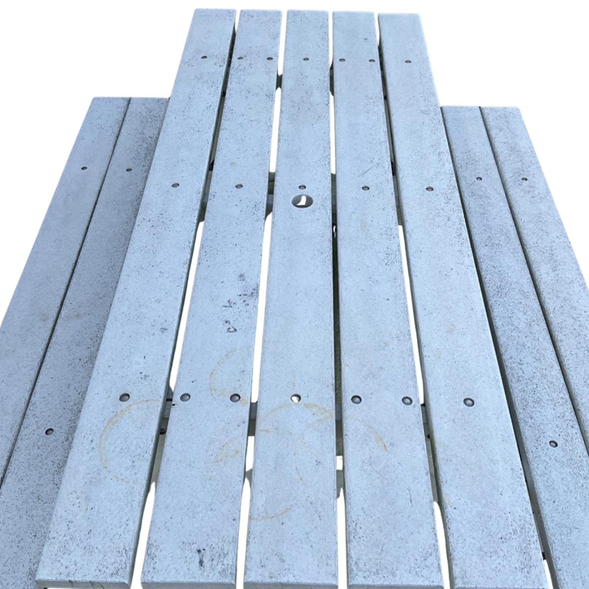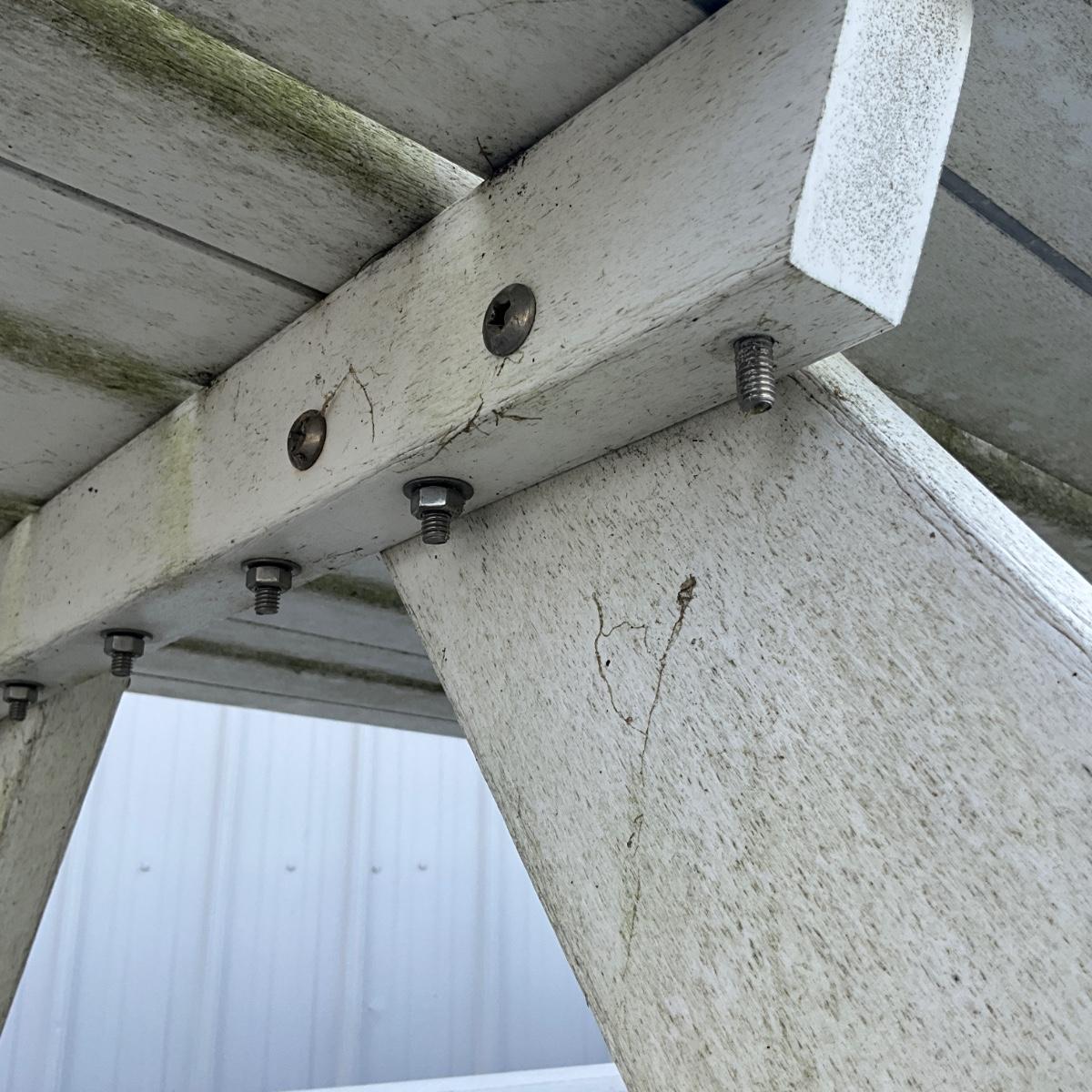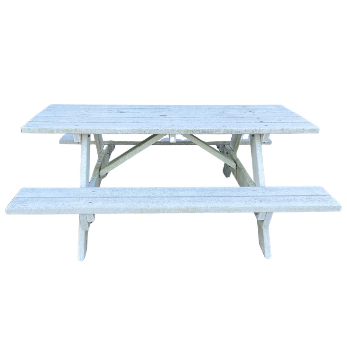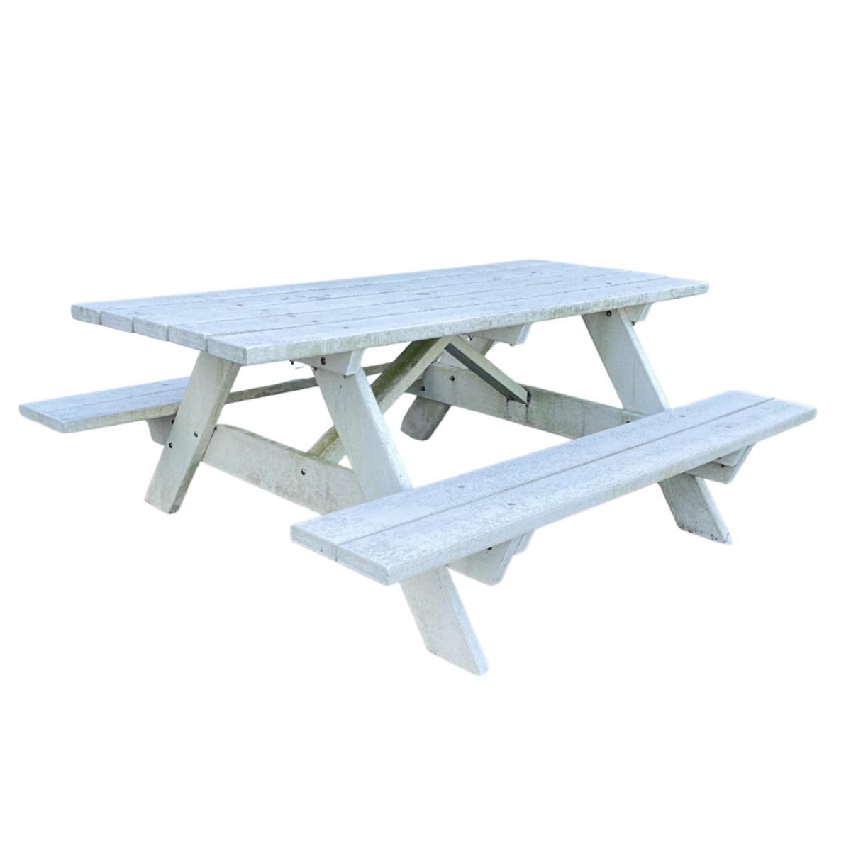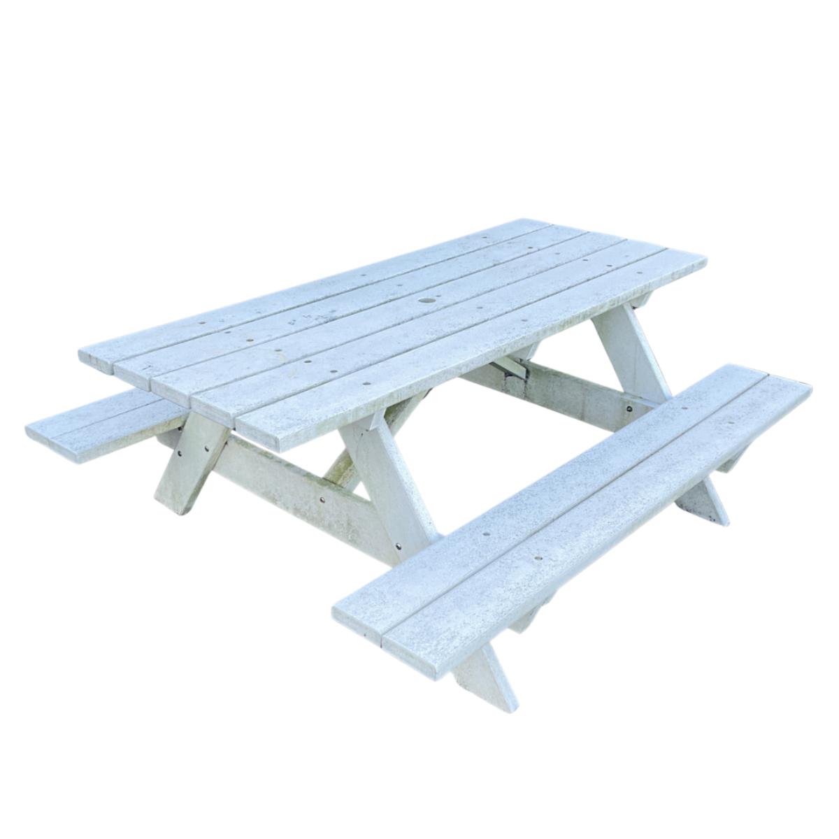 Made of environment recycled plastic. Has one nut missing on bolt underside of table, please refer to photo.