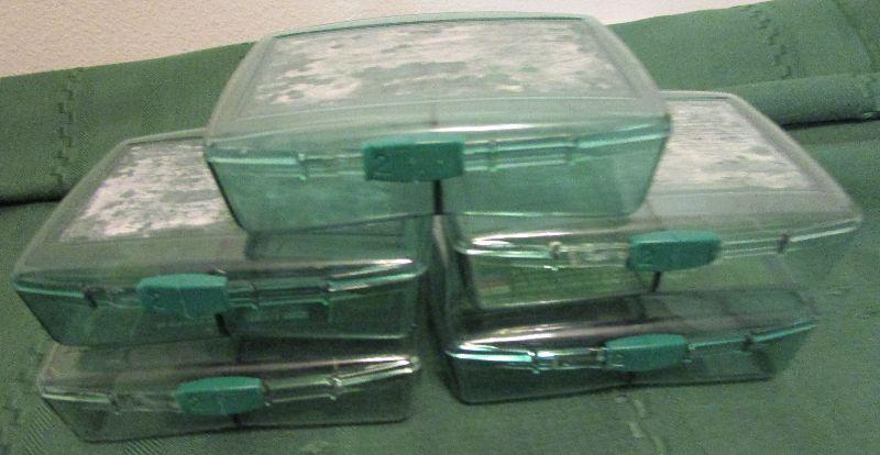 Five green plastic containers with slide closure, Would be great for crafts, small first aid kit, fishing hooks or fishing stuff 5"x4"x1.25"