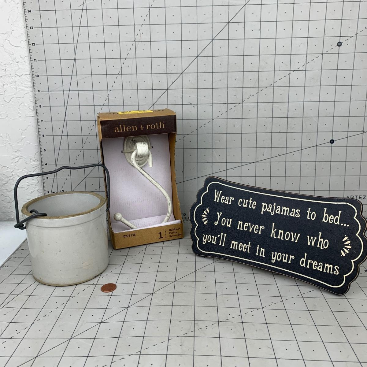 #47 Allen + Roth Holdback, Ceramic Bucket & "Wear Cute Pajamas"