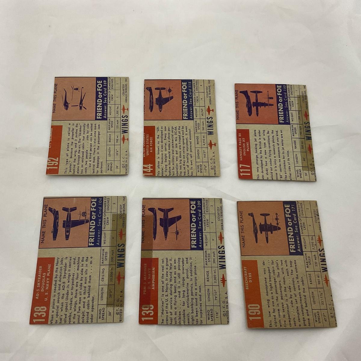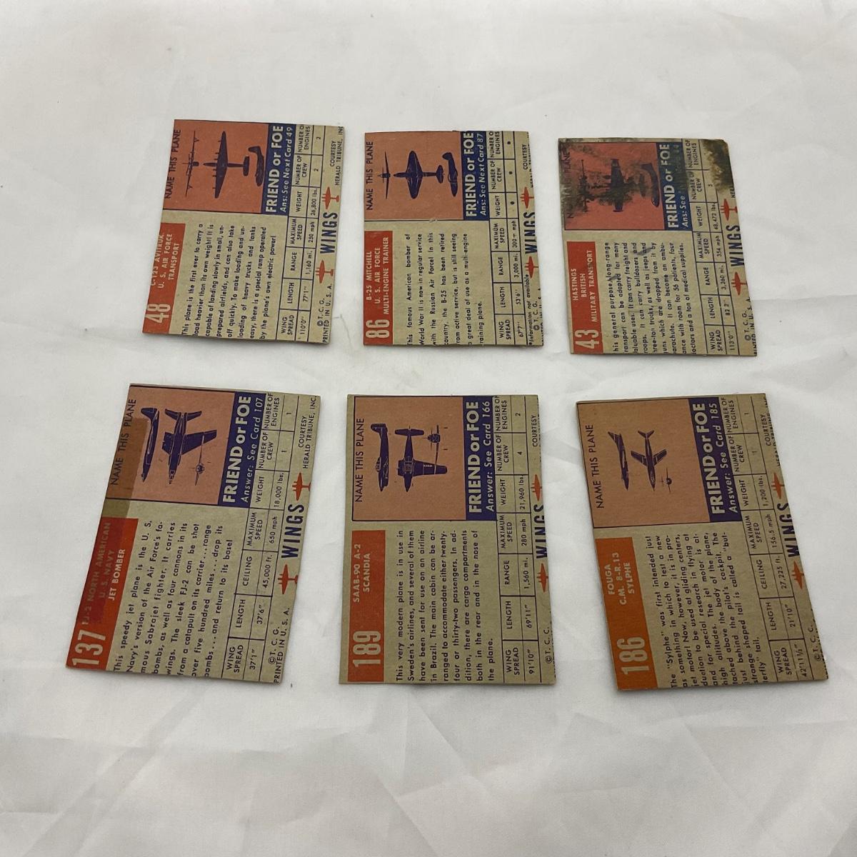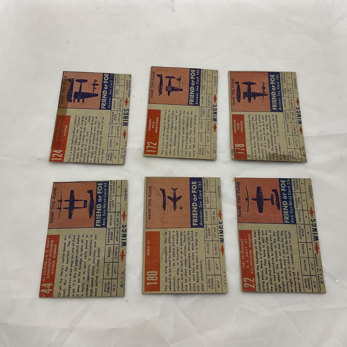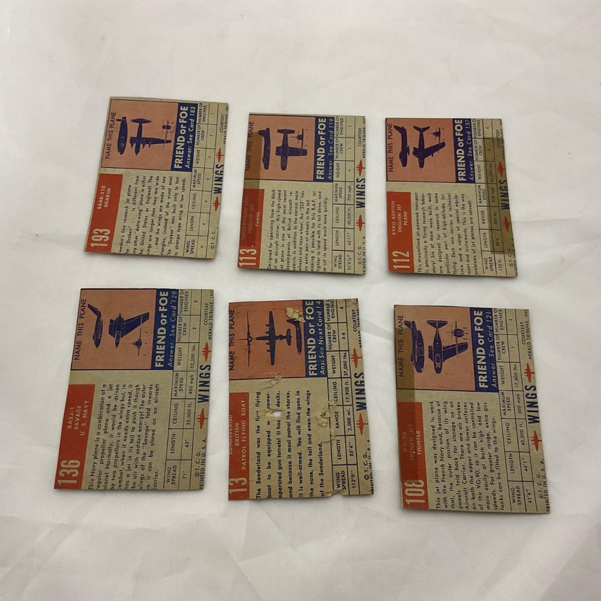 Group of 1952 Topps Wings airplane cards. In used, worn condition. Please see photos for details and condition. ::: Shipping is available on this lot. If you require shipping you must let us know at the close of the auction. We will coordinate with you after the item has been won. Shipping fees will include insurance up to or exceeding the value of all items being mailed. If you have any questions regarding this lot please contact the auctioneer either via this website, by direct email or by phone. PICK UP TIMES and other important information can be found in the TERMS and DESCRIPTION of the auction. Please take a look for pertinent information. Thanks!